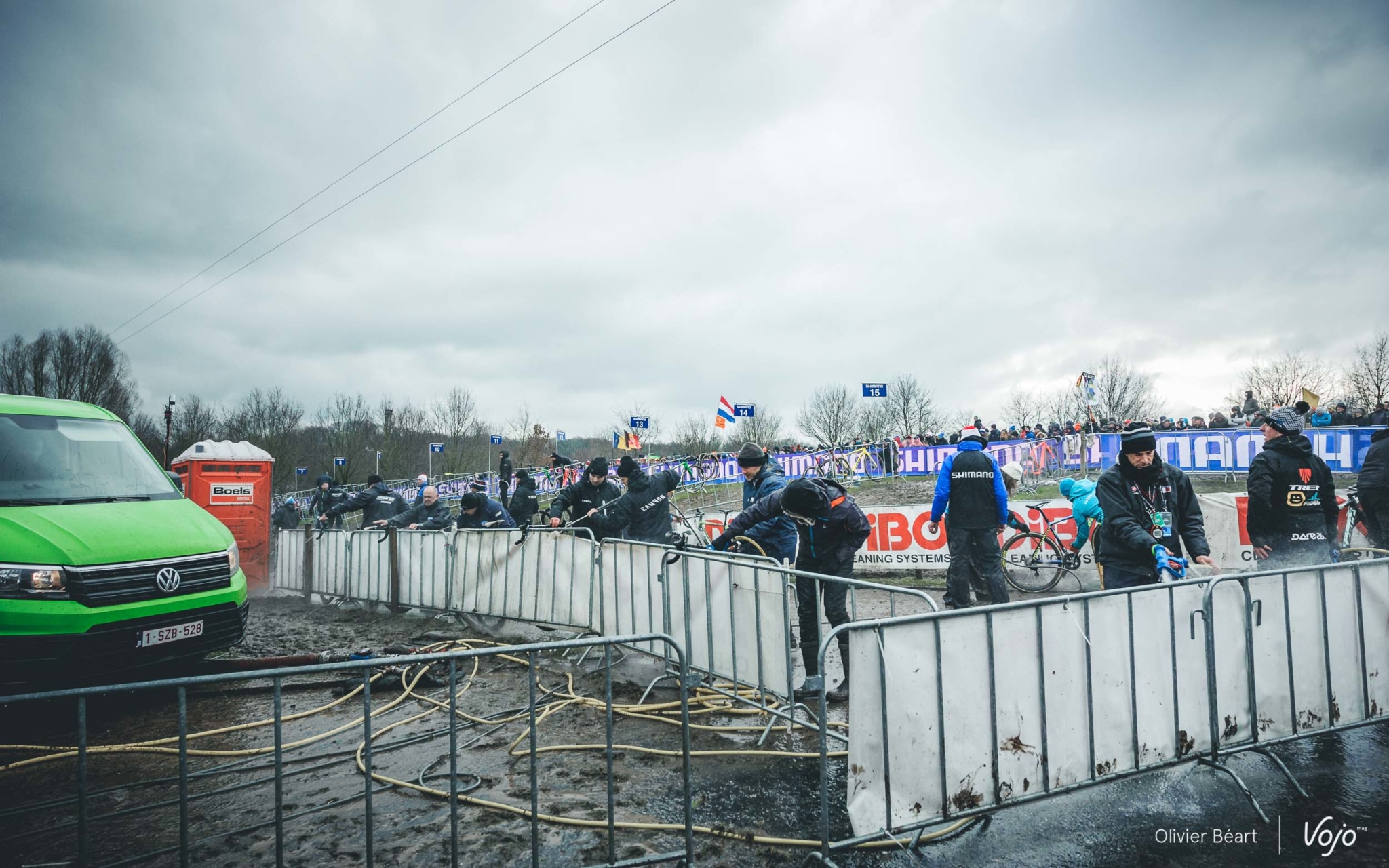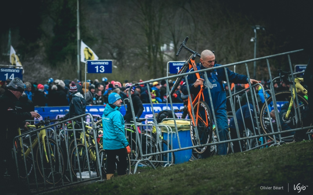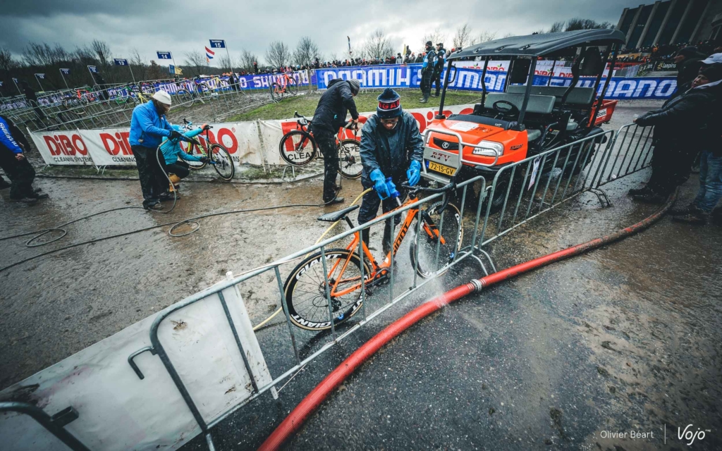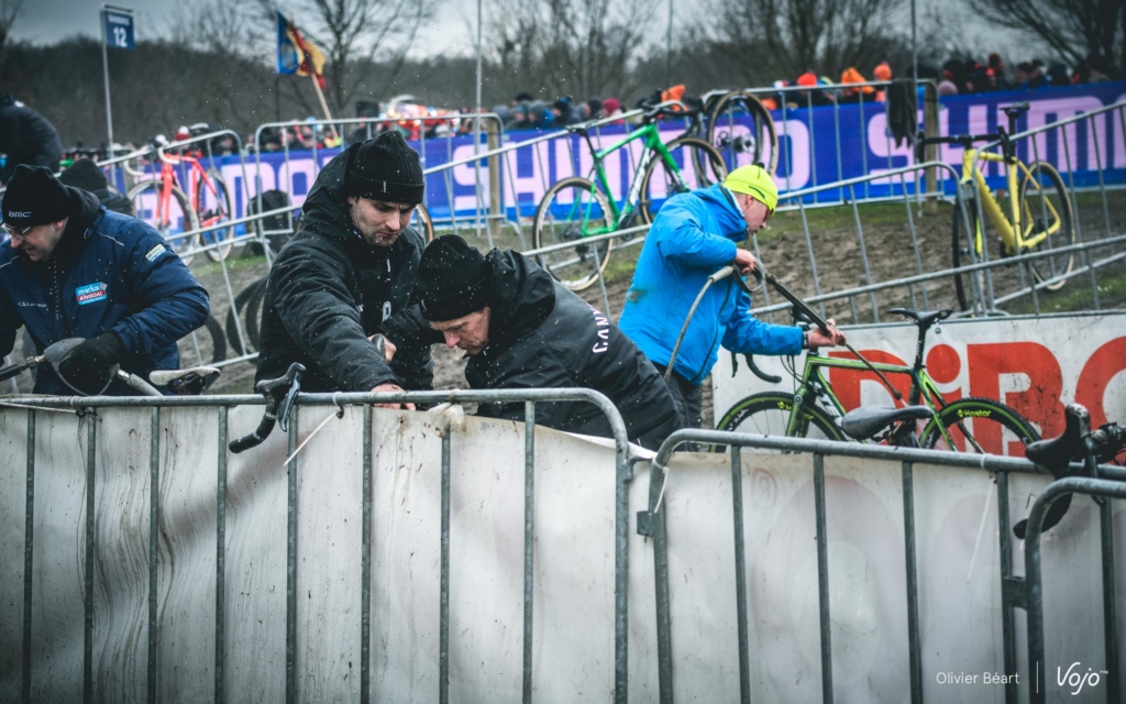 Avec tant de boue, la zone technique prend une importance toute particulière, puisqu’on peut changer de vélo jusqu’à deux fois par tour dans la discipline. Mais il faut bien évaluer l’intérêt car on peut y perdre du temps et l’opération comporte certains risques.