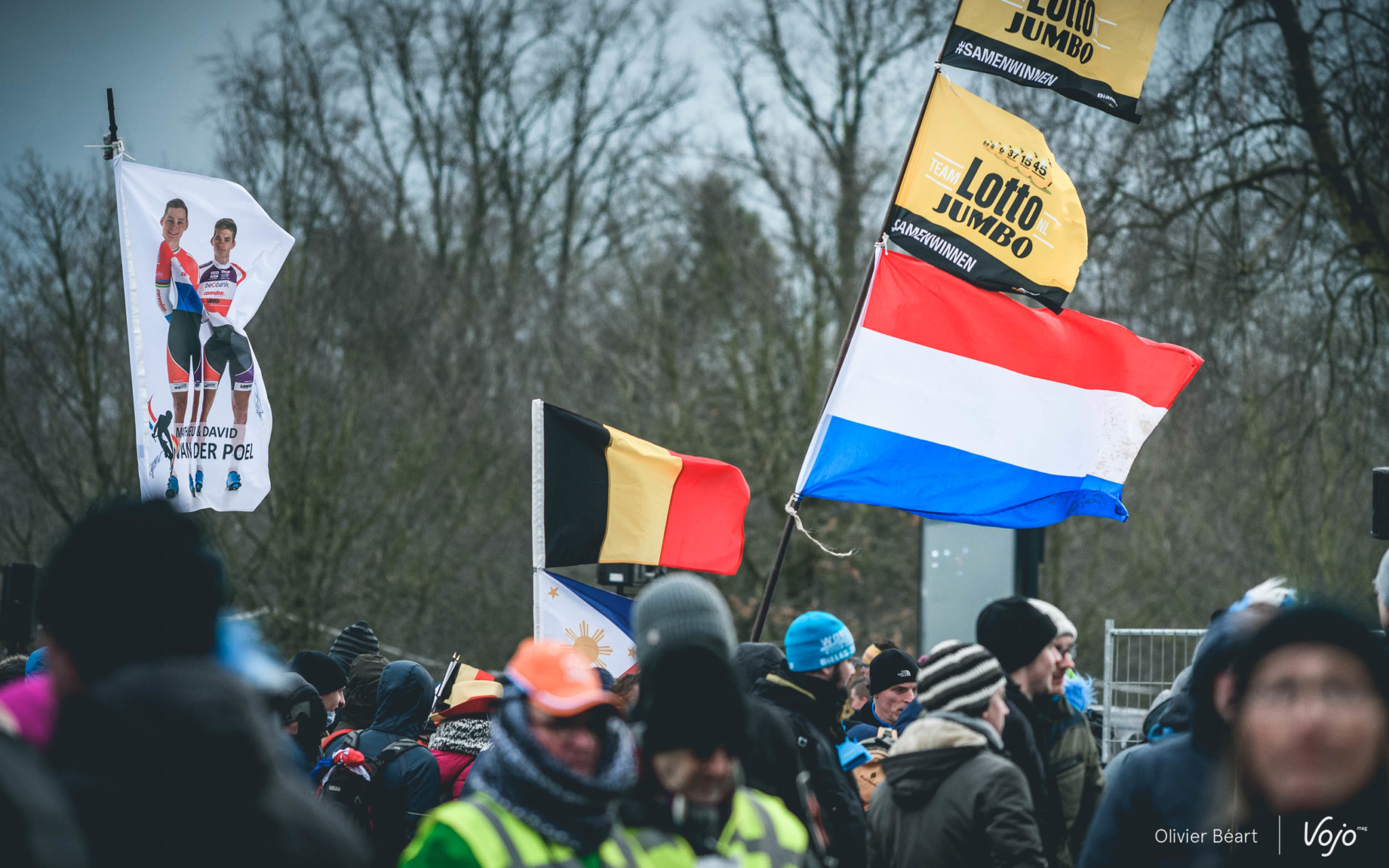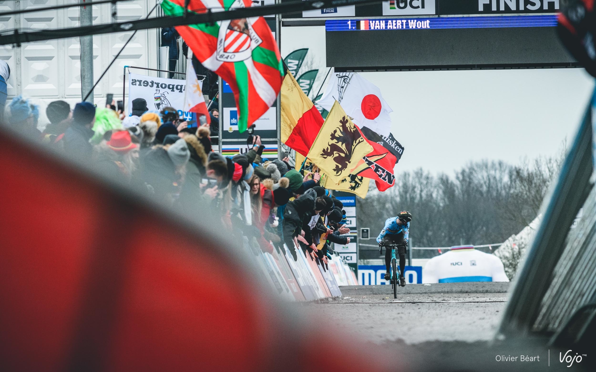 Les cris se font de plus en plus forts : voilà les coureurs, avec l’enfant du pays, le Néerlandais Mathieu van der Poel, qui pointe en tête devant le champion du Monde en titre, Wout van Aert. Visiblement, le duel de titans que tout le monde attend va bien avoir lieu !