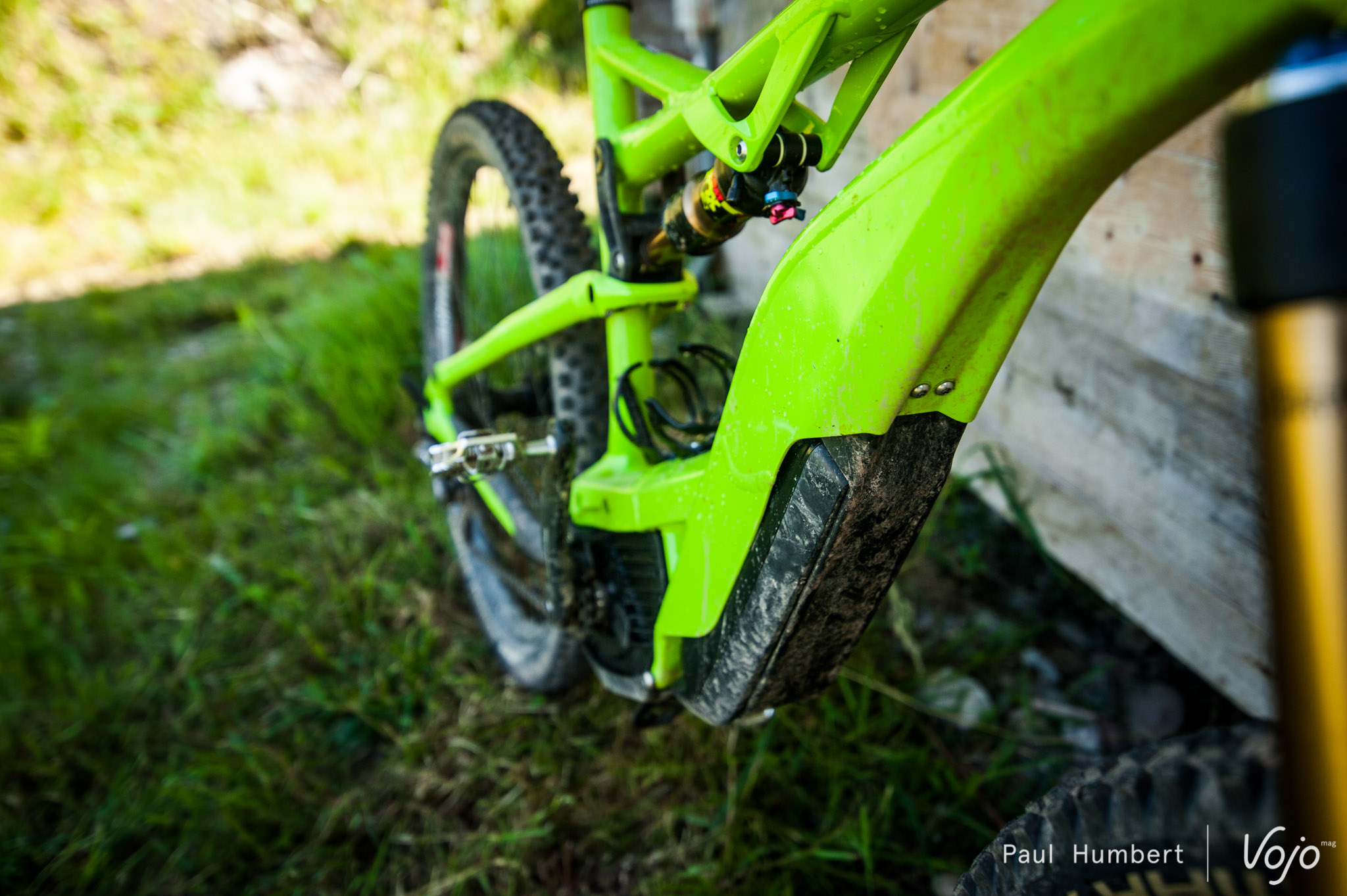 En descente, on retrouve le vélo très joueur et facile qu’on nous a promis. Les bases sont très courtes on le sent bien. La modification du centre de gravité n’était pas une promesse en l’air non plus et on ressent vraiment l’abaissement de ce dernier. Le vélo est bien plus facilement manoeuvrable et, un petit peu comme avec le Lapierre Overvolt (dont la prise en main est à retrouver ici : dev.vojomag.com/lapierre-overvolt-lelectrique-mode-turbo), on a réellement l’impression d’être au guidon d’un vélo classique.