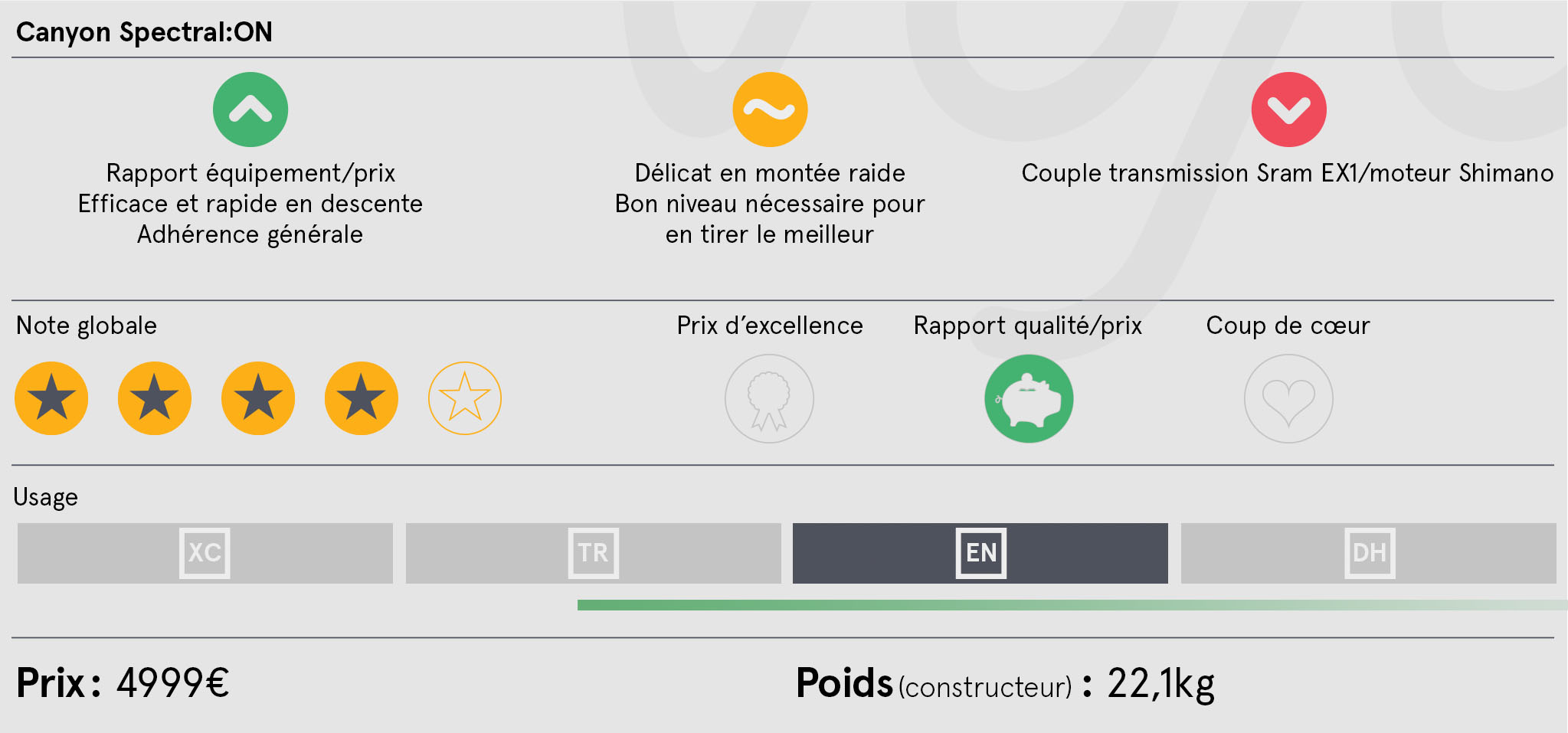 Le Canyon Spectral:ON 8.0 ne fait pas dans la demi-mesure. Au terme de cet essai de deux mois sur des terrains variés, nous pouvons dire qu’il revendique un côté mauvais élève en montée pour afficher clairement un gros caractère de descendeur. La dose d’adrénaline qu’il procure à chacun de ses runs fait partie de cette forte personnalité. Son identité pousse-au-crime trouvera preneur aux mains d’un pilote averti ayant une bonne expérience de la pratique et aguerri au système de vente par correspondance. Ce dernier devra faire preuve d’autorité pour emmener le Canyon et le faire briller à sa juste valeur. Cependant, un rider moyen pourra y trouver son compte grâce au confort distillé et au niveau d’adhérence rassurant procuré, mais attention aux débordements ! Son rapport qualité prix/équipement attractif est un vrai plus. Son terrain de jeu favori ? La moyenne montagne faite de singles naturels pas trop raides ou de pistes de mini-bike-park. Pas forcément à l’aise sur les longues distance, il se destine plutôt à des sorties courtes et dynamiques. Au final, Canyon propose ainsi un vélo plutôt atypique dans cette production pléthorique de all-mountain à assistance électrique qui cherchent tous à se ressembler.