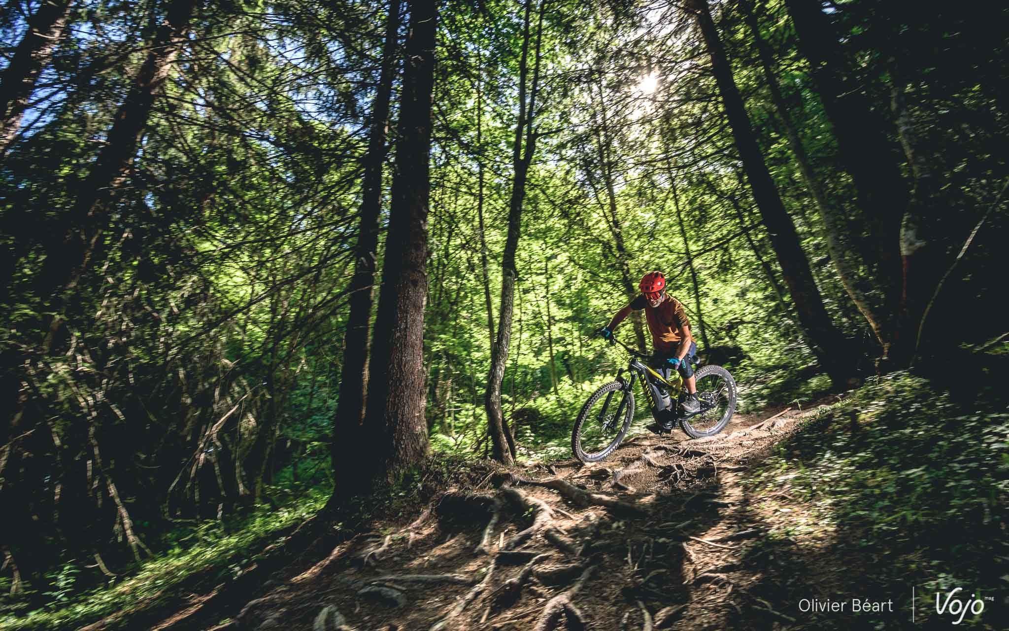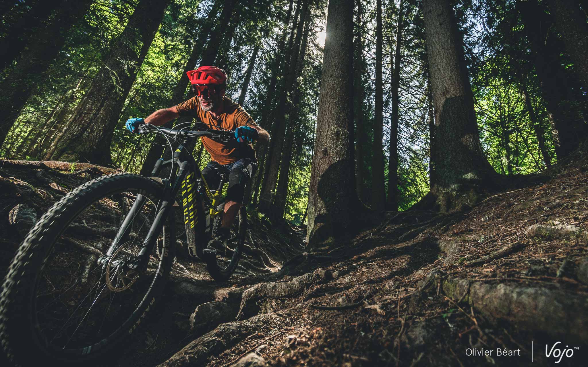 Selon nous, sur ces sections, le train roulant différencié fait des merveilles. La roue avant de 29″ avale littéralement les obstacles, tandis que la roue arrière en 27,5+ assure un grip de premier ordre, bien aidée par une suspension active. Pour autant, elle ne s’affaisse pas trop, et ne se raidit pas désagréablement sous charge. C’était un régal ! Seule ombre au tableau : il a fallu ajuster et viser son pédalage pour éviter de racler tout ce qui traîne avec les pédales.