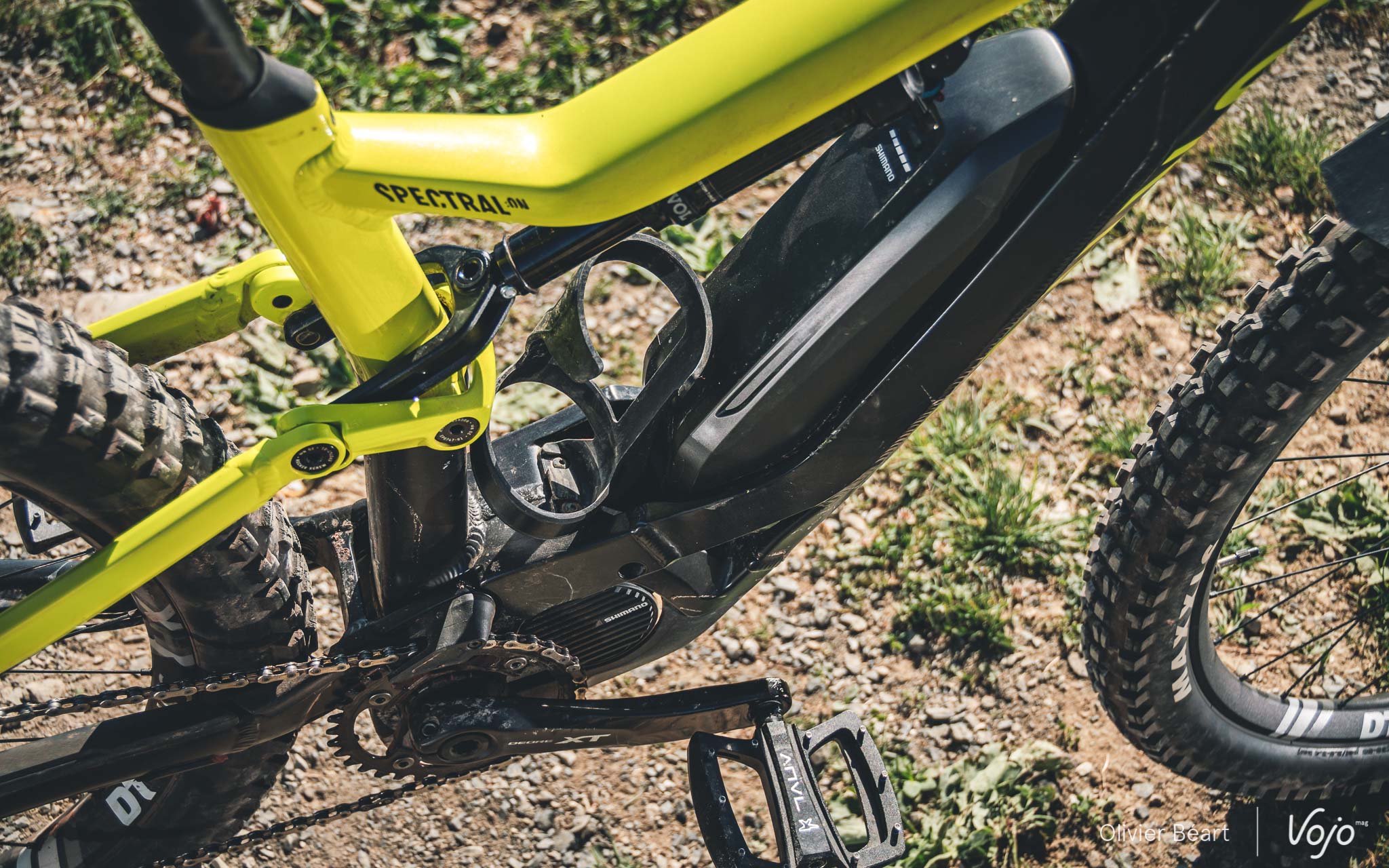 De nombreux détails de conception bien pensés complètent le tableau. Ainsi, on retrouve un protège-base intégré, qui participe au silence de fonctionnement du Spectral:ON. Un intelligent guide-chaîne, discret et efficace, prend place au niveau du point de pivot principal. L’espace disponible au centre du cadre permet le montage, idéalement placé, d’un porte-gourde pratique à l’usage. Enfin, comme pour la version non-électrique, on retrouve le génialissime axe de roue arrière, dont le levier de blocage intégré disparaît totalement dans ce dernier après serrage.