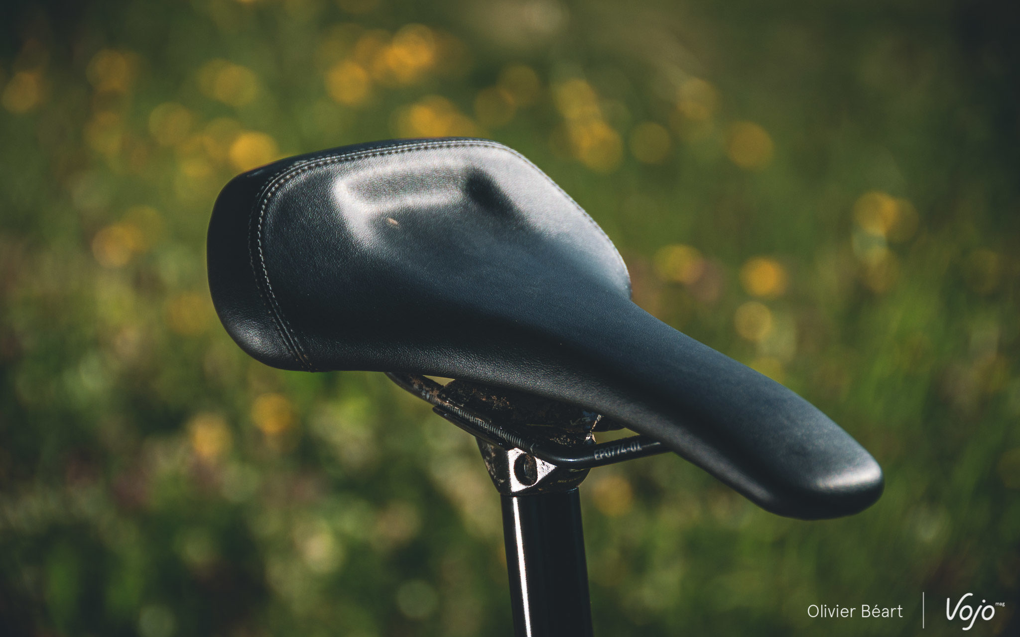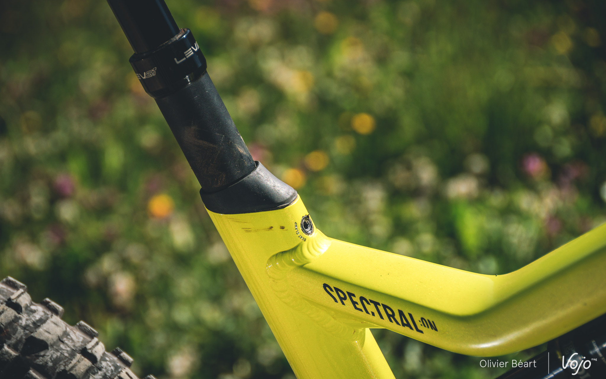 Au niveau de son pied, l’amortisseur est relié à la biellette par un « yoke » forgé offrant la possibilité de disposer d’un tube de selle ininterrompu. Ce dernier reprend une forme originale inaugurée sur le Sender puis finement déclinée sur les nouveaux Spectral et Torque. Il utilise un serrage de selle intégré sans collier apparent. Dans notre configuration, son angle est de 73,8° : une valeur presque basse à l’heure actuelle pour le pédalage, mais qui favorise plus la descente.