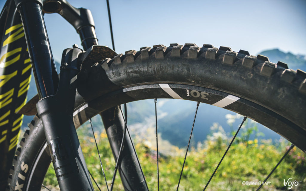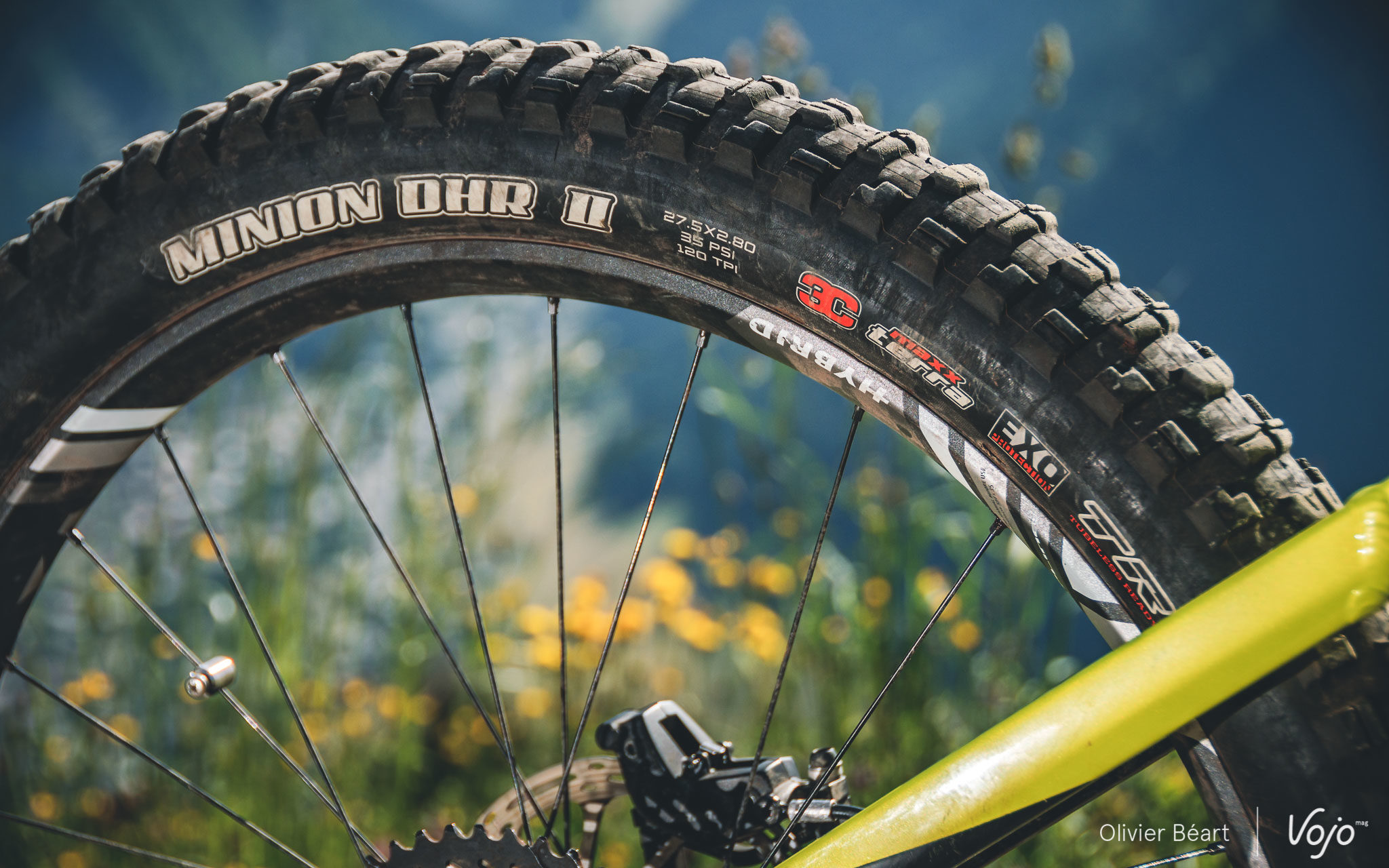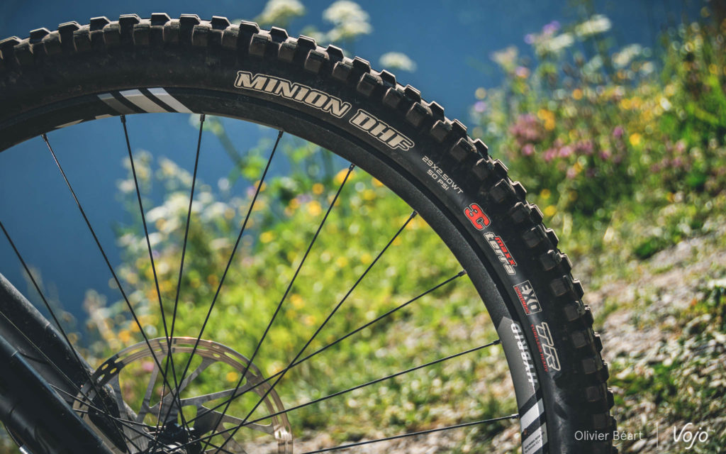 Une originalité du Canyon Spectral:ON tient à cette monte de roues différenciée entre l’avant et l’arrière. Roue avant en 29 pouces avec une jante 30 mm de large, roue arrière en 27,5+ pouces avec une jante en 35 mm de large provenant de chez DT Swiss. Ce sont les modèles HX1501 Spline One, modèle haut de gamme avec jante alliage, spécifique VAE, que l’on retrouve sous la dénomination Hybrid. Moyeux, rayons et jantes sont dimensionnés pour répondre aux exigences de fiabilité et de performance nécessaires au VAE. Nous n’avons pas été déçu par le résultat, avec un excellent compromis entre confort et rendement. Pas le moindre souci à déplorer concernant la fiabilité. Cette version du Spectral:ON 8.0 s’équipe de pneumatiques au grip et confort parfaits. Un Maxxis Minion DHF en 29 x 2,5 Wide Trail et gomme 3C Max Terra à l’avant ; un Maxxis Minion DHR2 en 27,5 x 2,8 et gomme 3C Max Terra également, à l’arrière. Petit bémol pour la carcasse Exo qui avoue ses limites en termes de fiabilité sur les e-bikes.