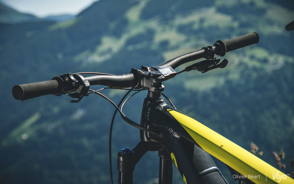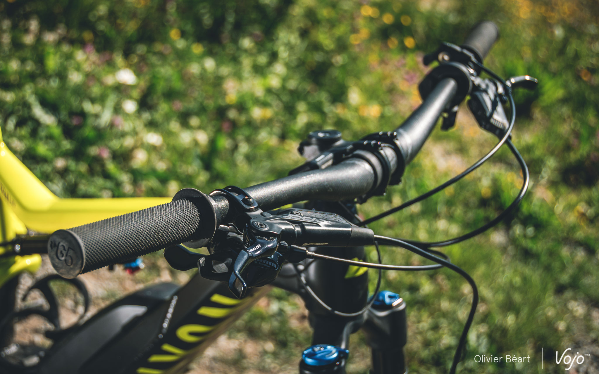 Au niveau des composants, on retrouve un cintre Race Face Aeffect de 35 mm de diamètre associé à une potence du même nom. Le dessin du cintre ne souffre d’aucune critique et la longueur de la potence s’avère adapté. Les grips et la selle viennent du catalogue maison. Les grips G5 sont issus de la gamme gravity et ne possèdent qu’un seul collier de serrage, leur dessin classique de diamant offre une bonne préhension et leur caoutchouc est confortable.