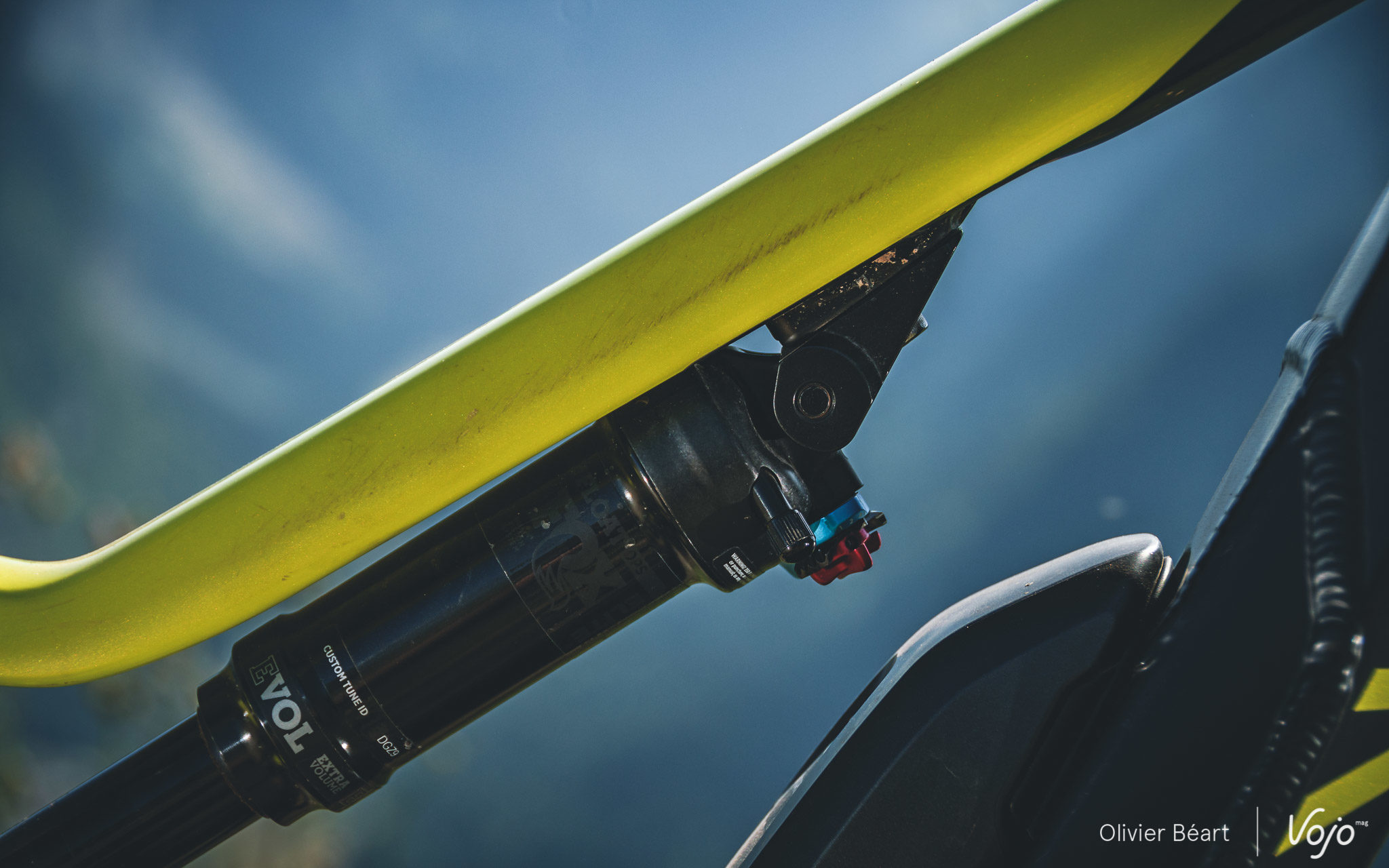 L’amortisseur, quant à lui, est issu de la gamme Elite, mais sans le traitement Kashima, puisque c’est un modèle DPS. Son piston à double étage permet de séparer la fonction plateforme de pédalage de la fonction ouverte. Ainsi, il n’y a pas d’interférence entre les deux circuits. L’amortisseur dispose de 3 positions de plate-forme. Parfait dans une utilisation “trail agressif”, il a avoué ses limites dans certaines longues descentes de bike-park. Vu l’agressivité dont le Spectral:ON 8.0 a fait preuve en descente, on le verrait bien avec une monte d’amortisseur plus « engagée » pour les plus énervés… ! Pas sûr, cependant, que la place disponible le permette.