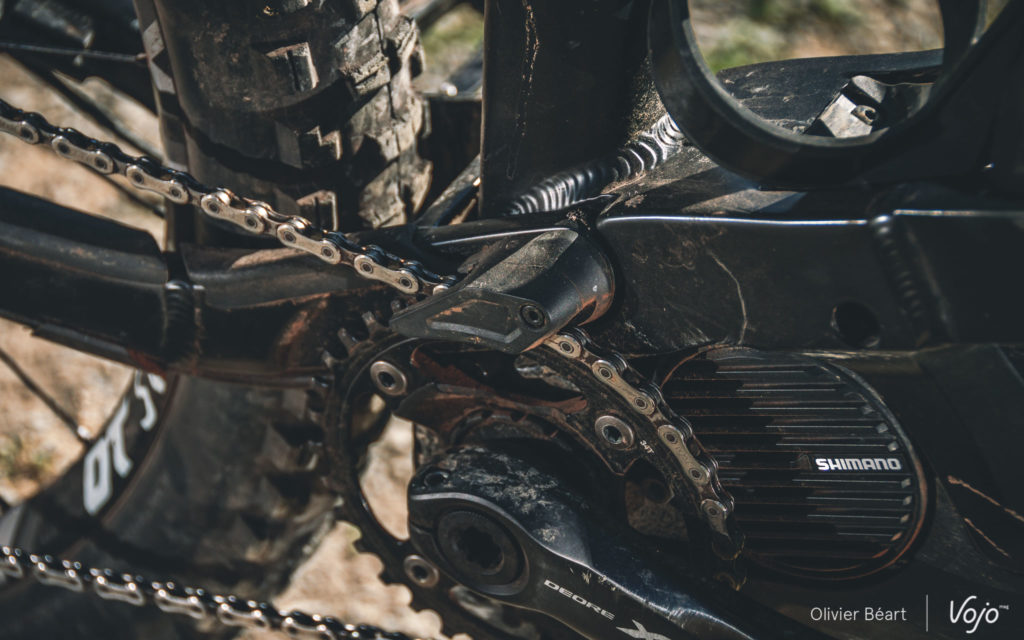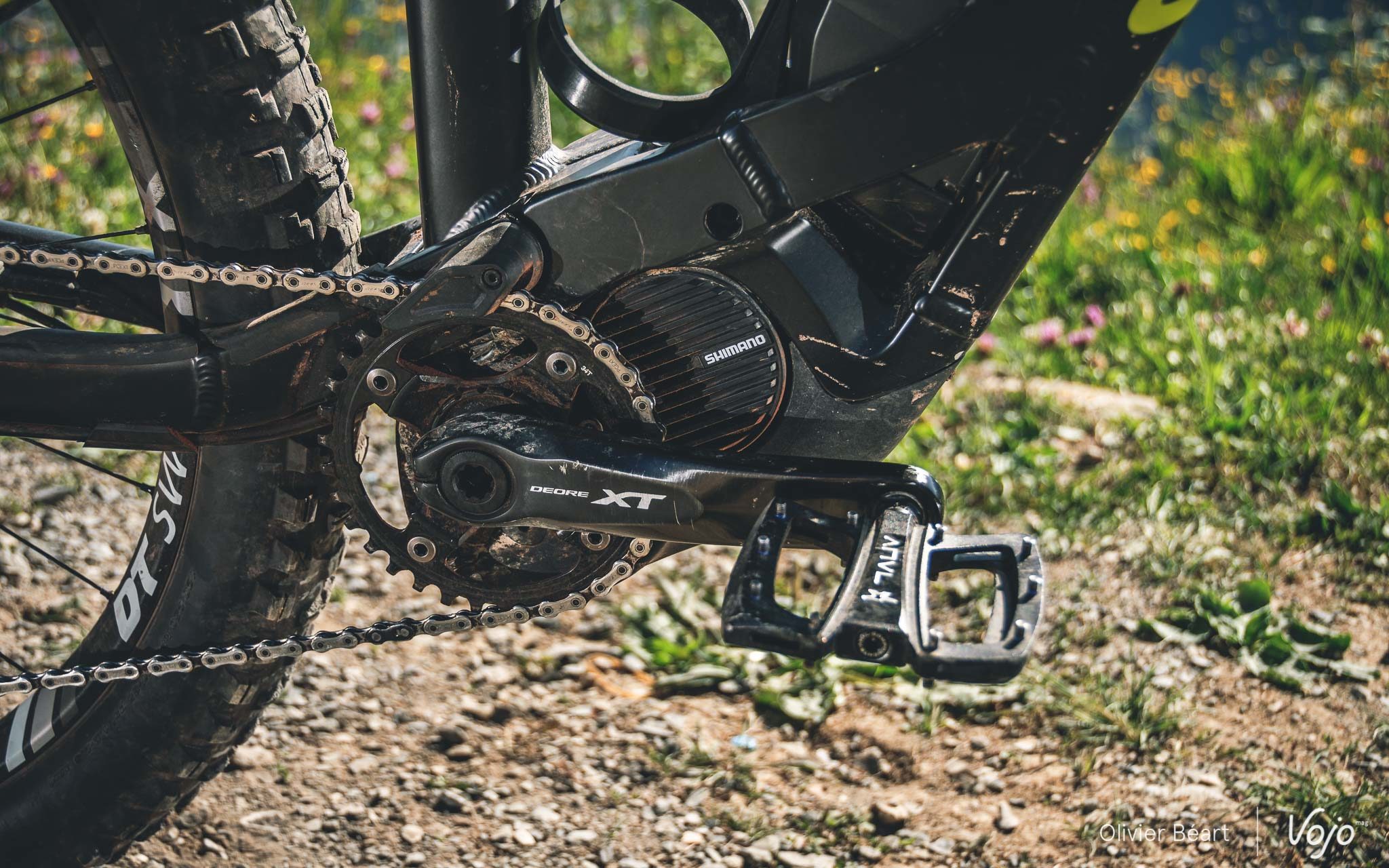 On visualise la situation sur un écran de contrôle au display ultra lisible et agréable. Un joli pédalier XT de type Hollowtech II associé à une couronne de 34 dents complète ce moteur.