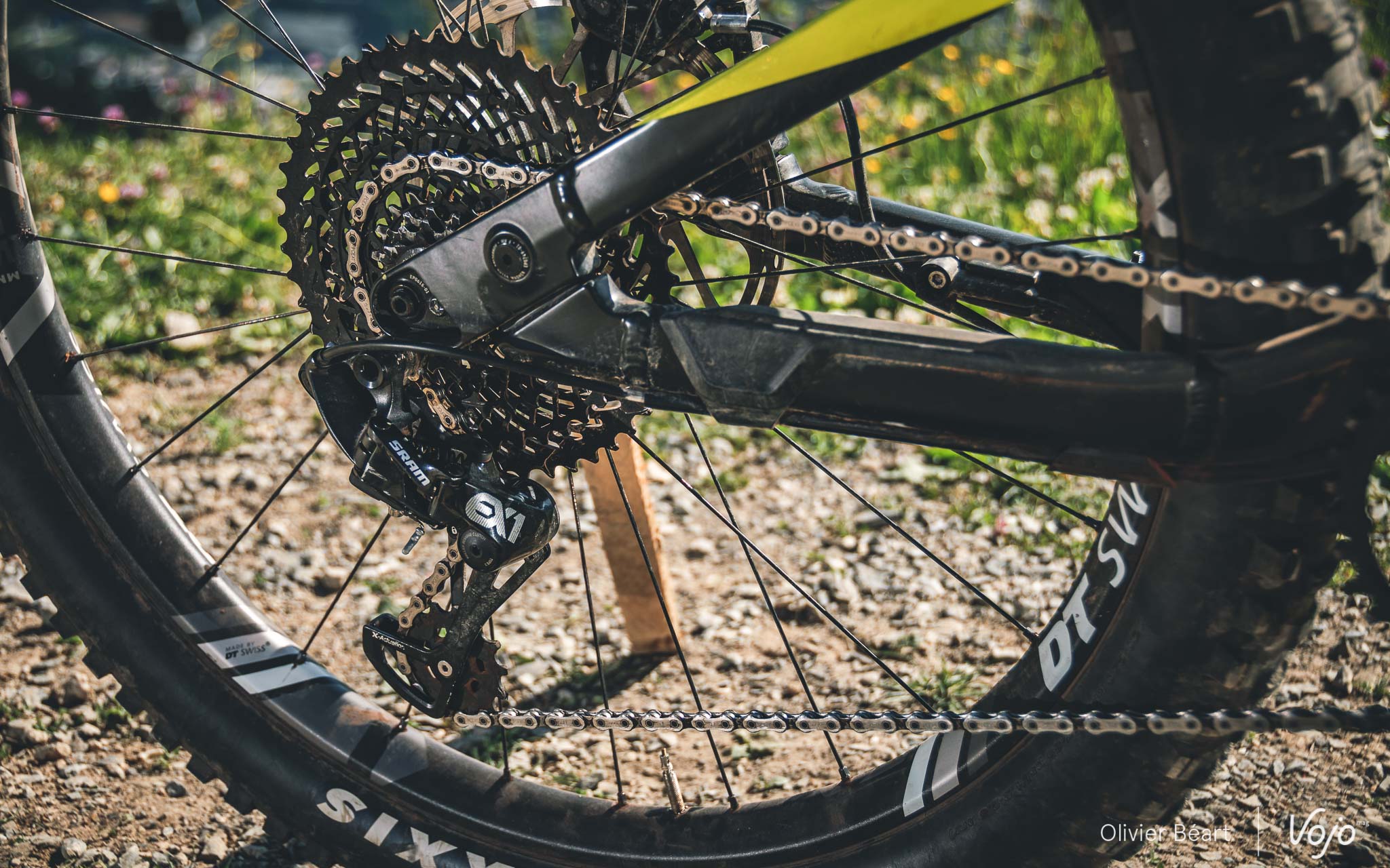Côté transmission, on retrouve un groupe Sram EX1 spécifique e-bike. C’est un ensemble haut de gamme indissociable comprenant une cassette, un shifter, une chaîne spécifique, ainsi qu’un dérailleur dédié. La particularité de cette combinaison est de ne pouvoir descendre qu’une vitesse à la fois et ainsi de minimiser les risques de rupture de chaîne liés à l’utilisation du moteur électrique. Une autre particularité consiste à n’avoir que 8 vitesses disponibles sur la cassette ; et là, on touche vraiment un point sensible du montage. En effet, le moteur peut facilement se retrouver hors plage d’utilisation entre deux rapports à l’écart trop espacé. Un changement de mode d’assistance est alors nécessaire pour s’en sortir. Un moteur en guise de « transmission » : pas forcément intuitif, surtout dans les situations qui demandent de la concentration. Ou quand le mieux devient l’ennemi du bien.