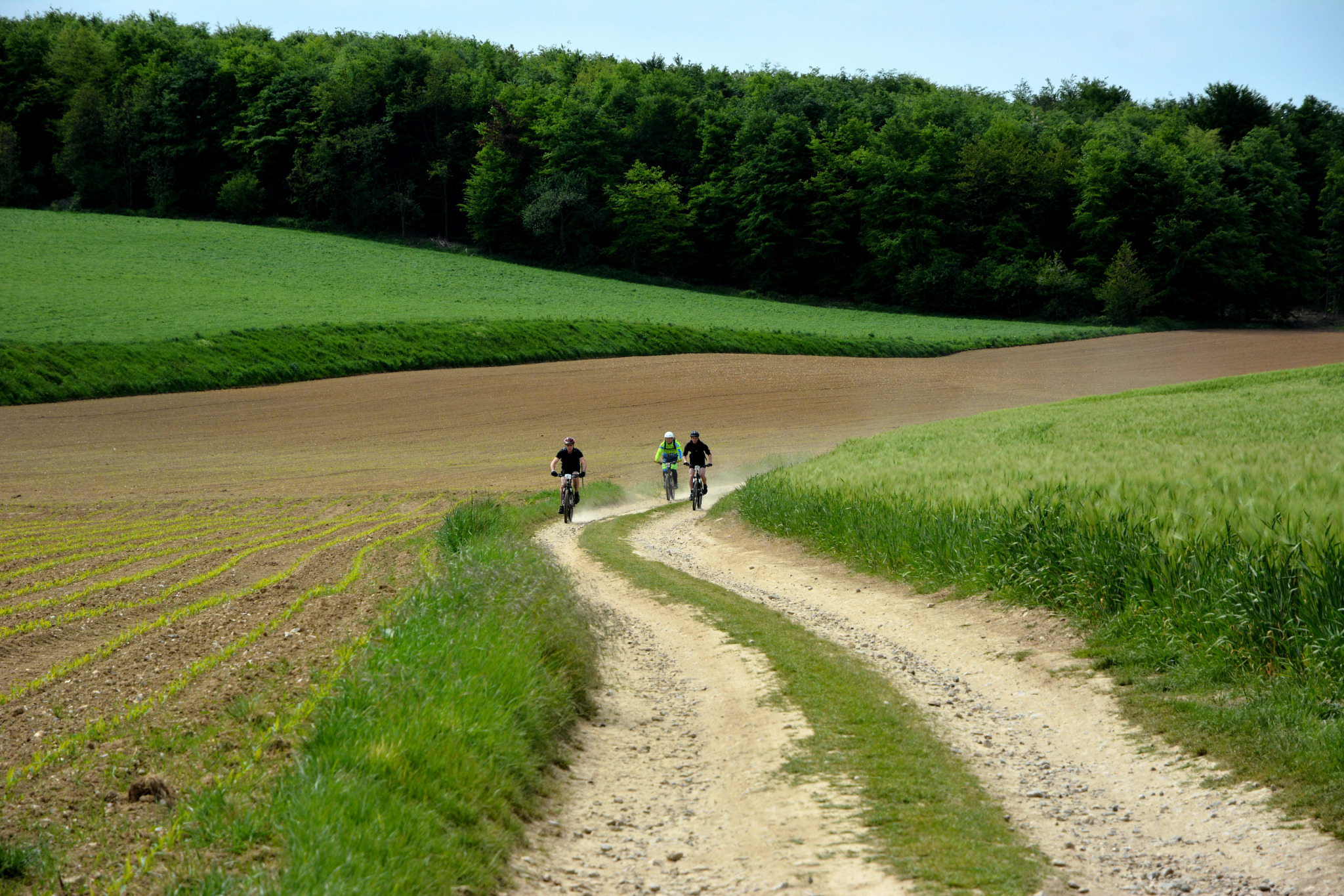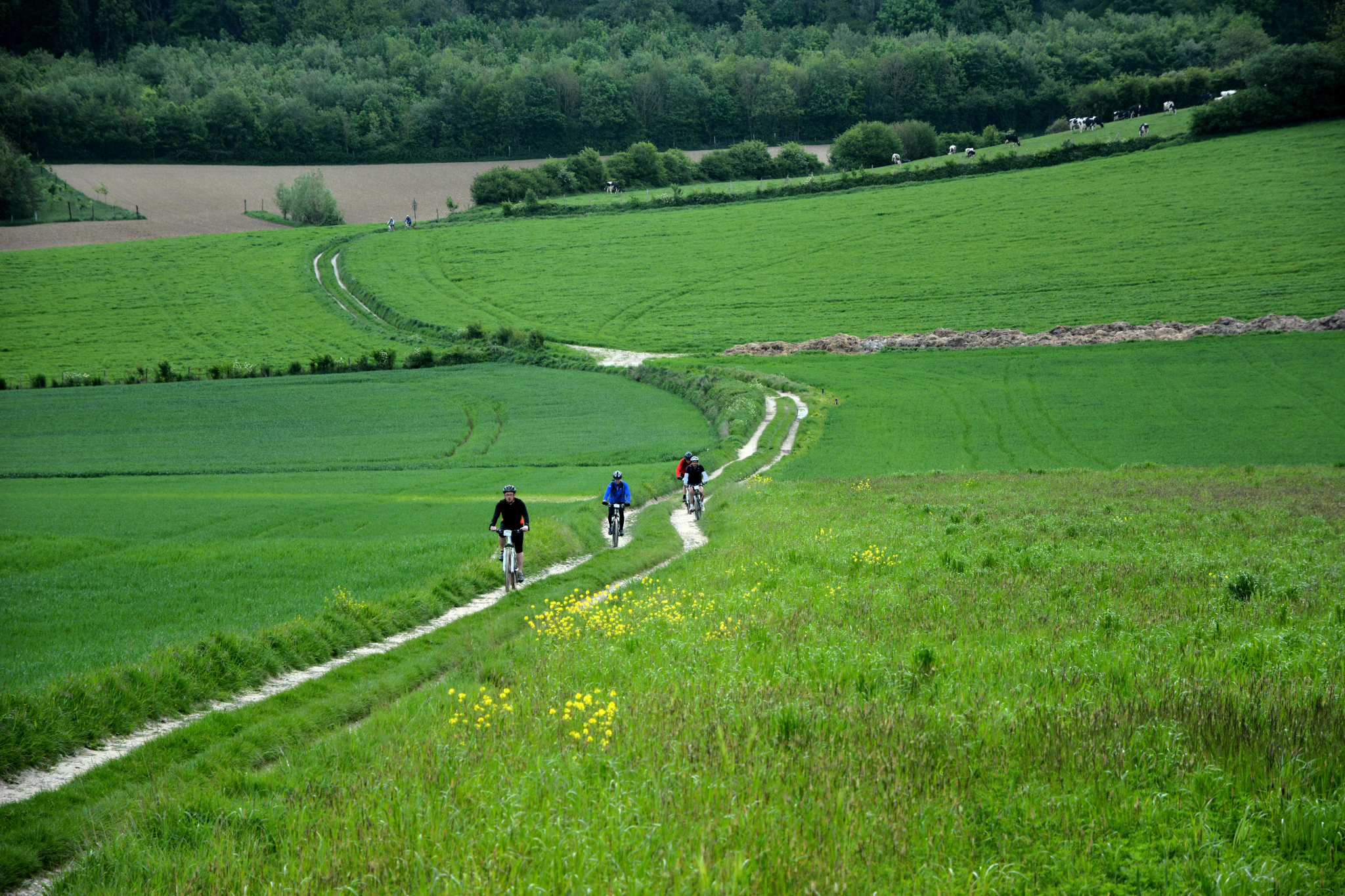 Après avoir traversé le village, nous parcourons quelques centaines de mètres sur la digue de Wissant. Le matin, les promeneurs sont encore peu nombreux, de sorte que l’on ne gêne personne. Ce sera la seule fois que nous verrons la Manche de près. Nous quittons en effet bien vite le bord de mer pour nous enfoncer lentement à l’intérieur des terres. D’emblée, nous rentrons dans le vif du sujet : le circuit, composé en toute grande majorité de chemins campagnards larges et très roulants, ne présente aucune difficulté technique. Tout au plus certaines ornières cachées par des herbes hautes méritent-elles une attention particulière.