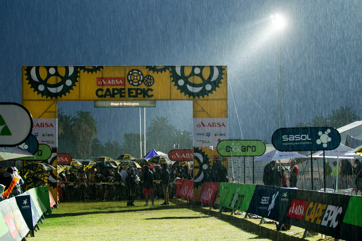Le Cape Epic touche doucement à sa fin. Et pour cette avant-dernière étape, la mythique course Sud-Africaine revient à des distances plus « humaines » avec 70km… mais tout de même 2000m de d+ dans les vignobles de Wellington. Mais surtout, beaucoup de singletracks et de descentes très « flow » pour se faire plaisir sur une étape très attendue par les participants car annoncée comme vraiment ludique. Hélas, le matin, en ouvrant les tentes, un invité surprise vient tout chambouler : la pluie tombe à grosses gouttes !