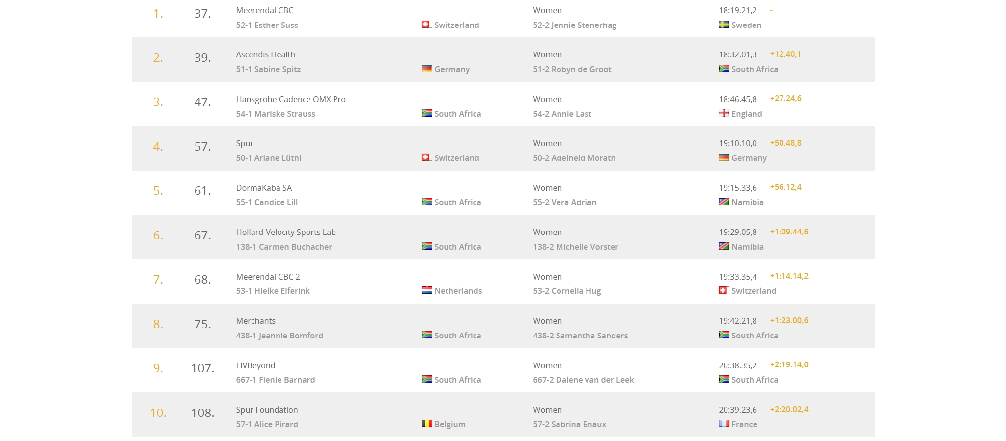 La domination de Suss et Sternerhag (Meerendal CBC) est tellement claire qu’avec 12 minutes et 40 secondes sur leurs poursuivantes au général (Spiz et de Groot), rien ne semble pouvoir les priver d’une victoire dimanche, sauf chute ou gros pépin mécanique.