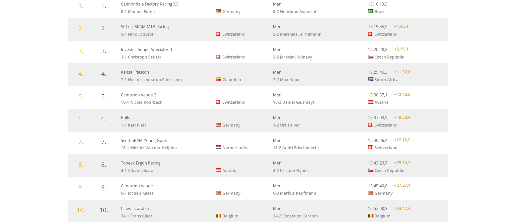 Chez les hommes, la victoire du jour a été construite et savourée par quatre riders. Les « Young Guns » du team Scott-Sram, Michiel Van der Heijden, 25 ans (Pays-Bas) et Andri Frischknecht, 22 ans (Suisse, fils du célèbre Thomas, présent lui aussi et leader en mixte) l’emportent…