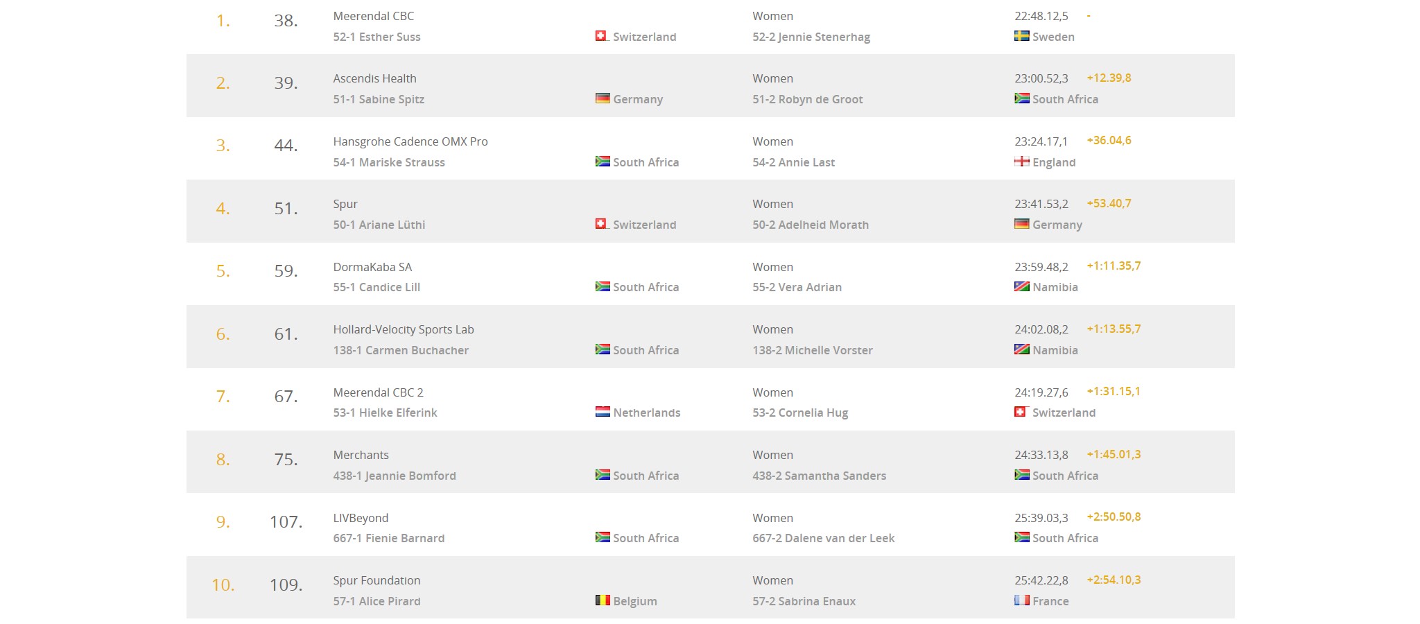 Jenny Rissveds et Thomas Frischknecht ont une telle avance sur Grant Usher et Amy Beth McDougall (42 minutes) qu’ils vont pouvoir apprécier le paysage ce weekend. Johan Labuschagne et Catherine Williamson complètent le podium. 4 équipages français sont toujours en course en mixte !