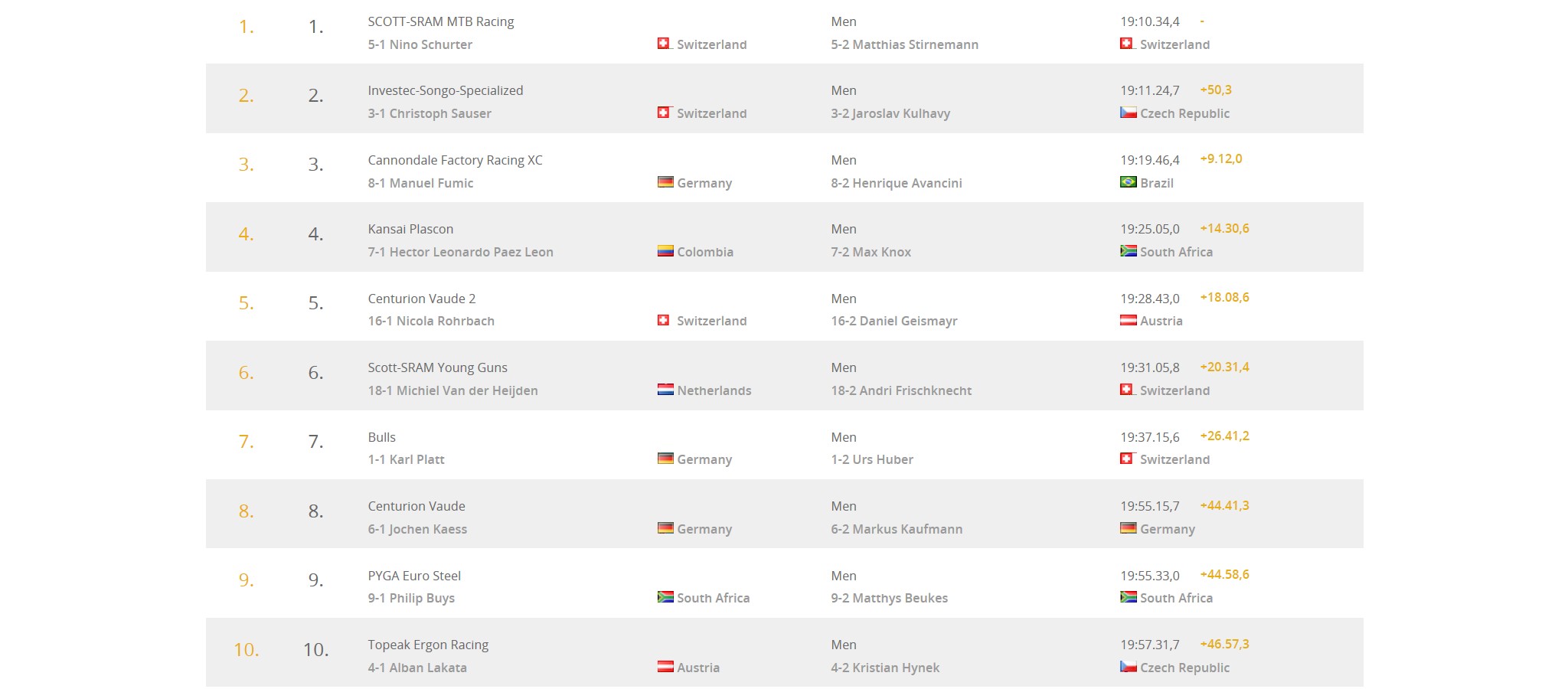 Devant, Schurter et Stirnemann tiennent enfin leur victoire d’étape ! Ils bouclent les 84km en 3 heures, 50 minutes et 38 secondes. Dans leurs roues, les Young Guns du team Scott-Sram franchissent la ligne en deuxième position. Michiel Van der Heijden et Andri Frischknecht reproduisent un beau travail d’équipe, après la victoire d’hier.