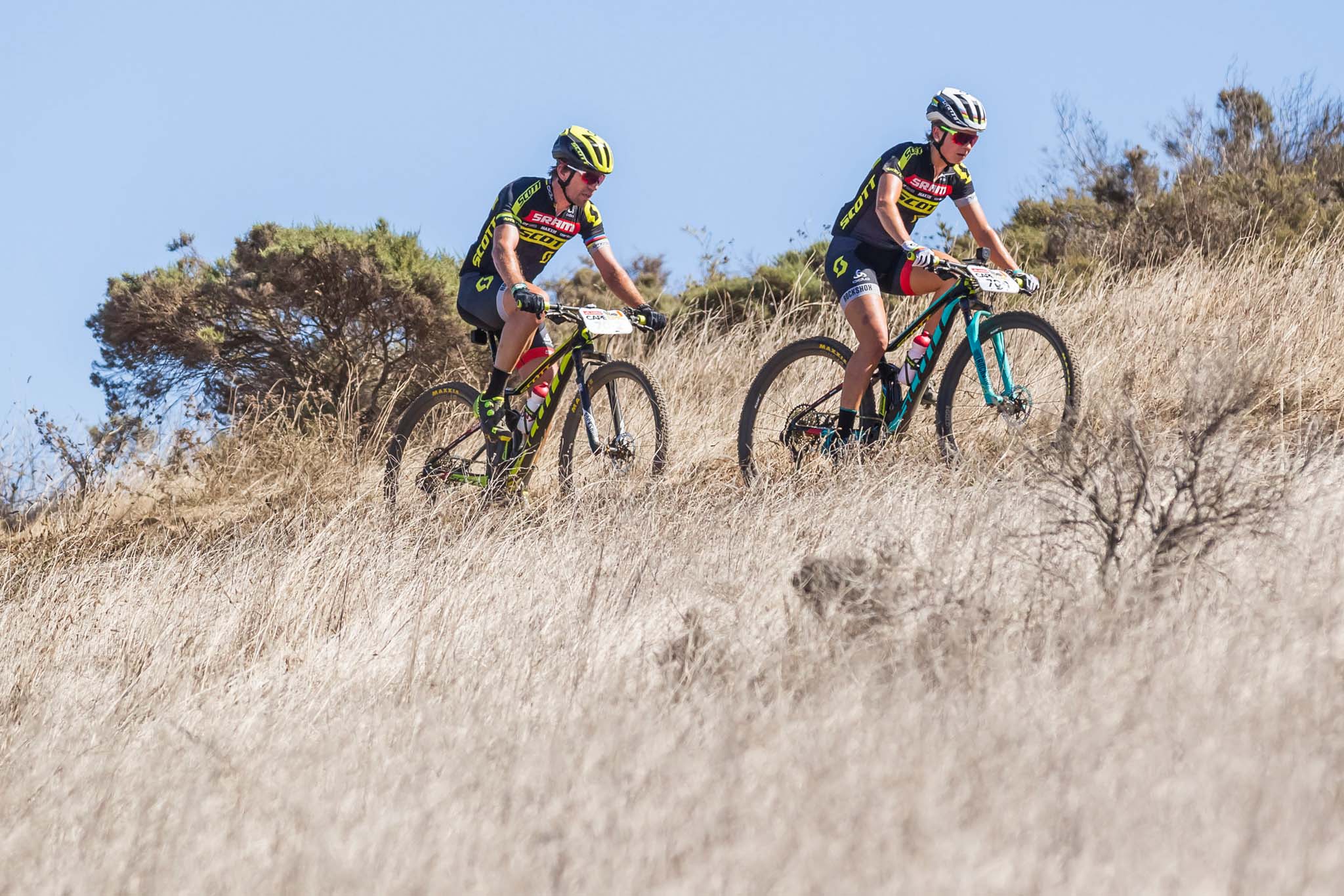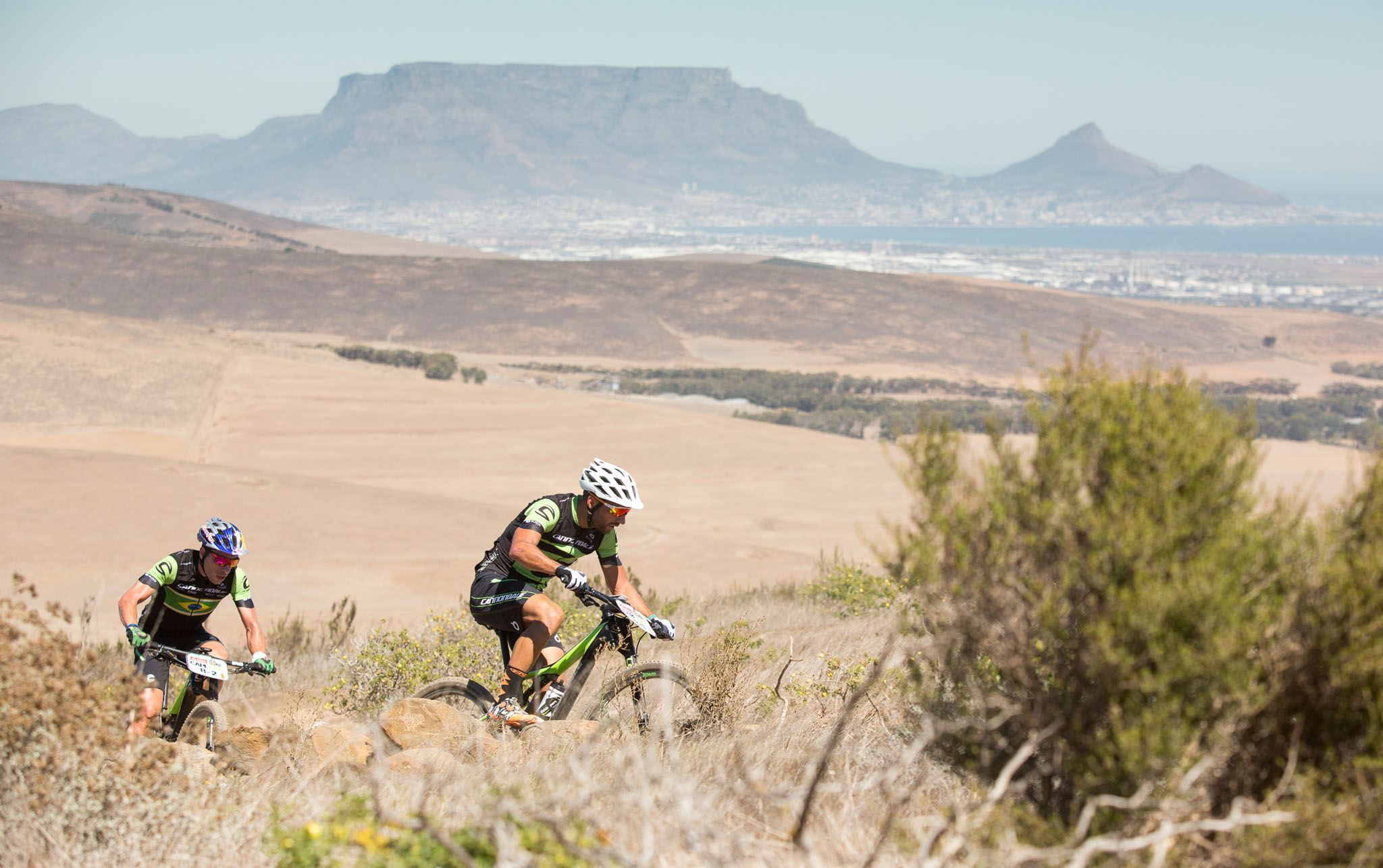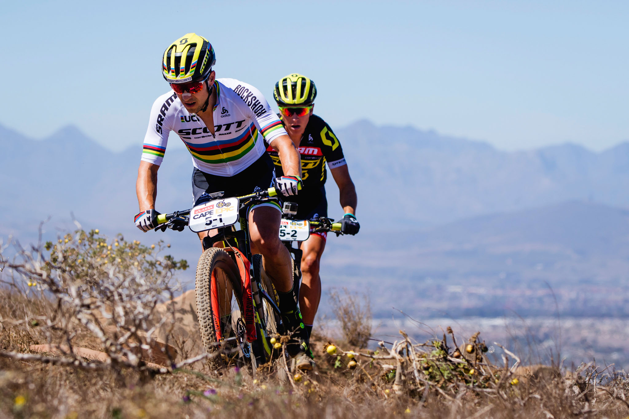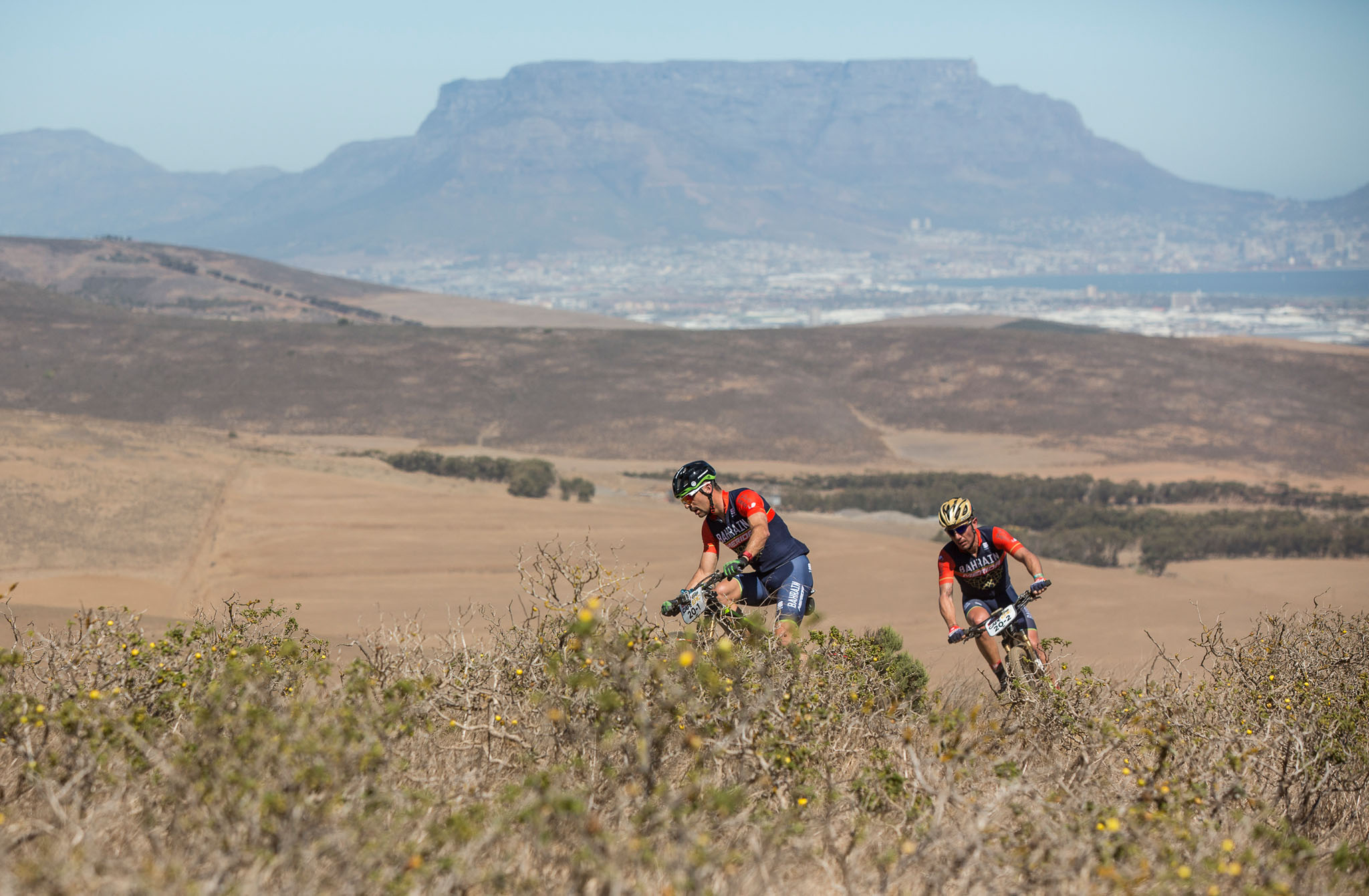En 2016, l’Allemand Manuel Fumic et le Brésilien Henrique Avancini remportaient l’étape finale du Cape Epic. Les deux hommes jouent la continuité en s’imposant aujourd’hui sur le prologue, avec un grand sourire communicatif ! Il n’aura fallu aux représentants du team Cannondale Factory Racing XC que 1h, 1 minute et 52 secondes pour boucler les 26km de l’étape. Du côté de chez Bulls, les tenants du titre finissent à la 6ème position, avec 3 minutes et 23 secondes de retard.