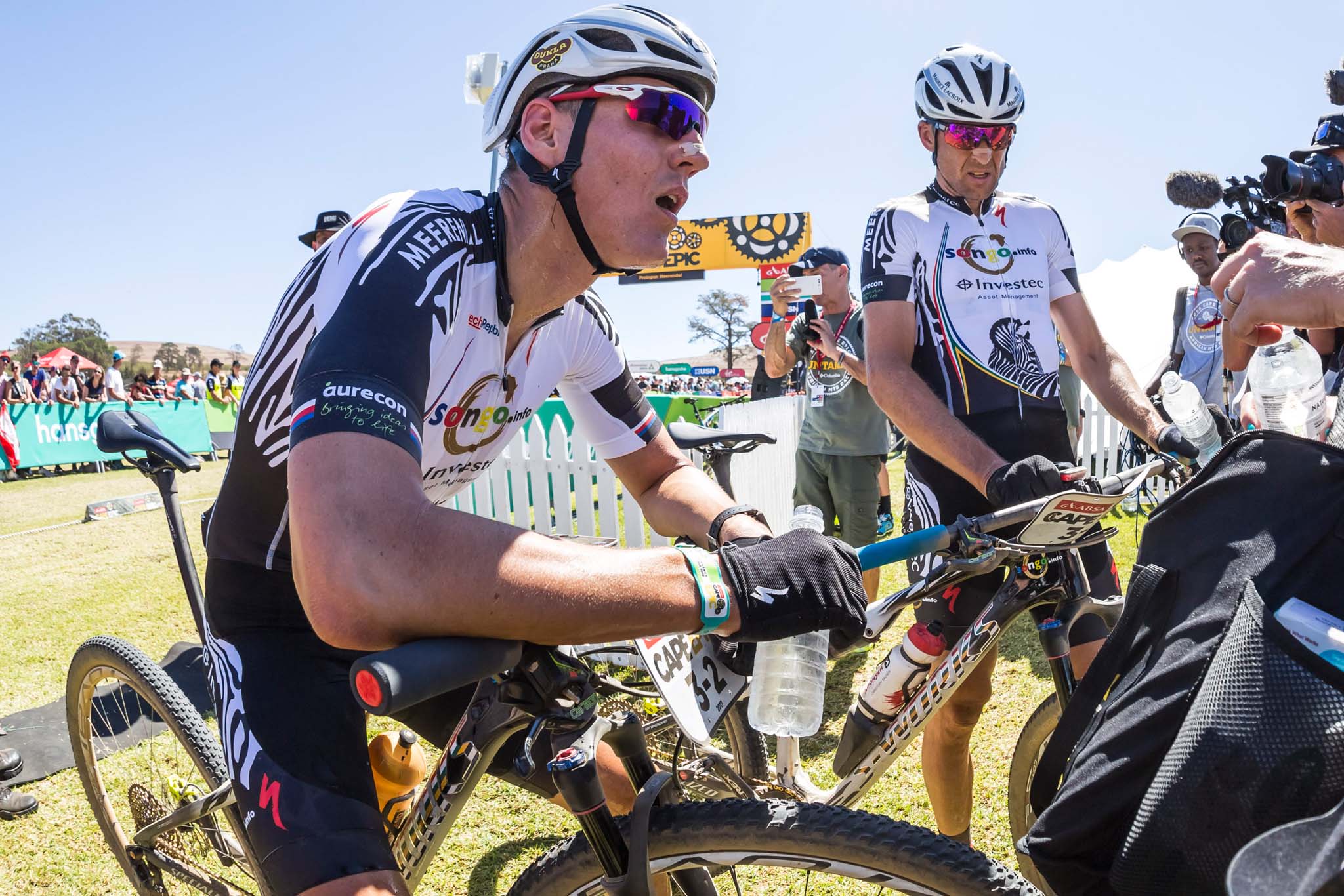 Au milieu des vignes du Meerendal Wine Estate, le champion olympique en titre Nino Schurter monte sur la deuxième marche du podium avec Matthias Stirnemann, Suisse lui aussi (team Scott – Sram MTB Racing). Même après avoir roulé à Rio, Nino Schurter avouait avoir chaud à l’arrivée de cette première étape !