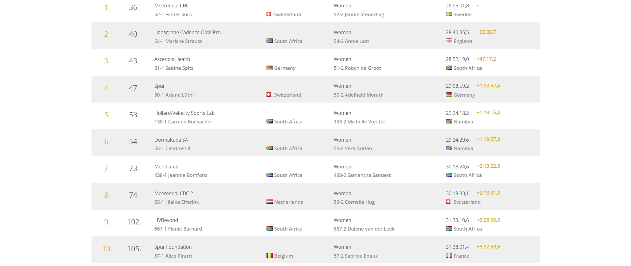 Mariske Strauss et Annie Last ont fait preuve de leur talent dans le technique aujourd’hui. Elles gagnent une place au général, 2èmes à 35 minutes d’Esther Suss (43 ans) et Jennie Stenerhag (41 ans), qui s’imposeront demain. Sauf incident… Et nous voyons bien qu’un incident qui coûte beaucoup de temps peut arriver très vite, incitant Suss à la prudence.