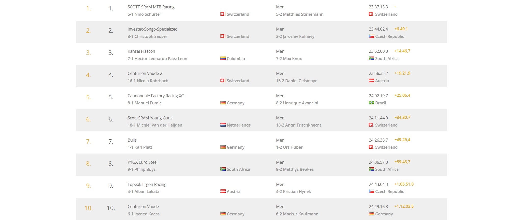 « Nous avions prévu de rester au contact du team Investec-Songo-Specialized toute la journée. Quand Christoph Sauser a crevé dans la première grande descente, on a décidé d’attaquer et de s’échapper. A partir de là, c’était comme une course de cross-country pour nous », commente Nino Schurter. Le champion olympique est installé en tête du général avec Matthias Stirnemann, près de 7 minutes devant Sauser et Kulhavy. Sauf pépin majeur, la victoire finale est à eux.