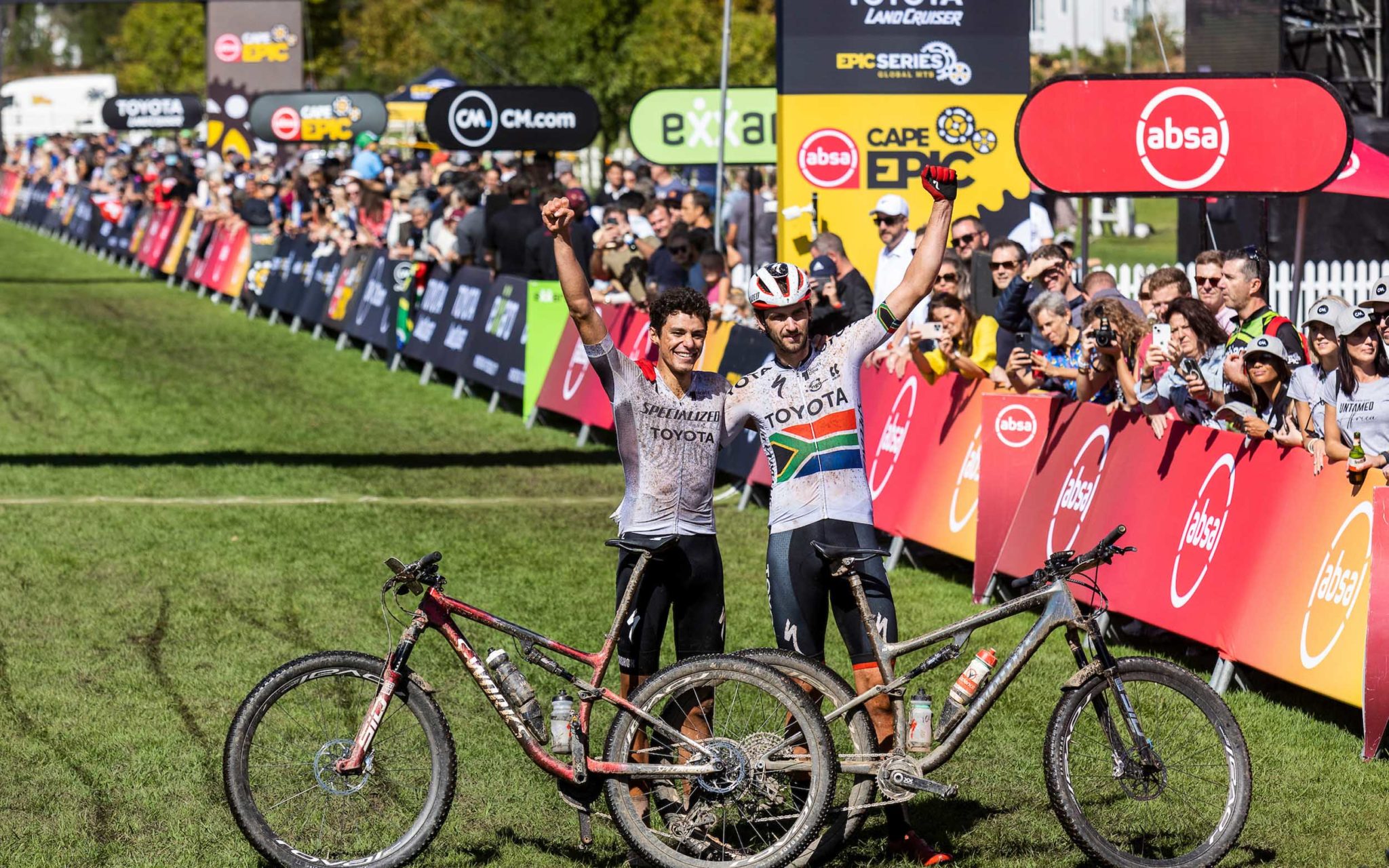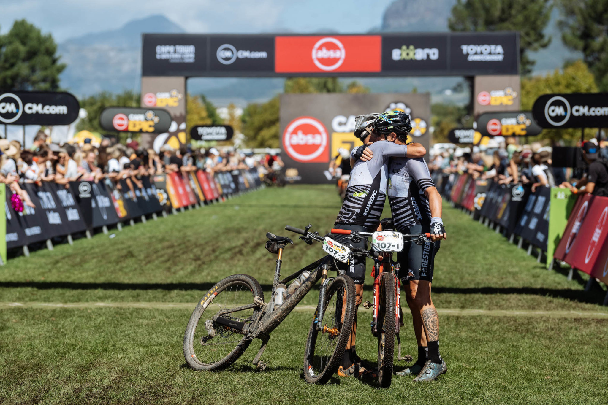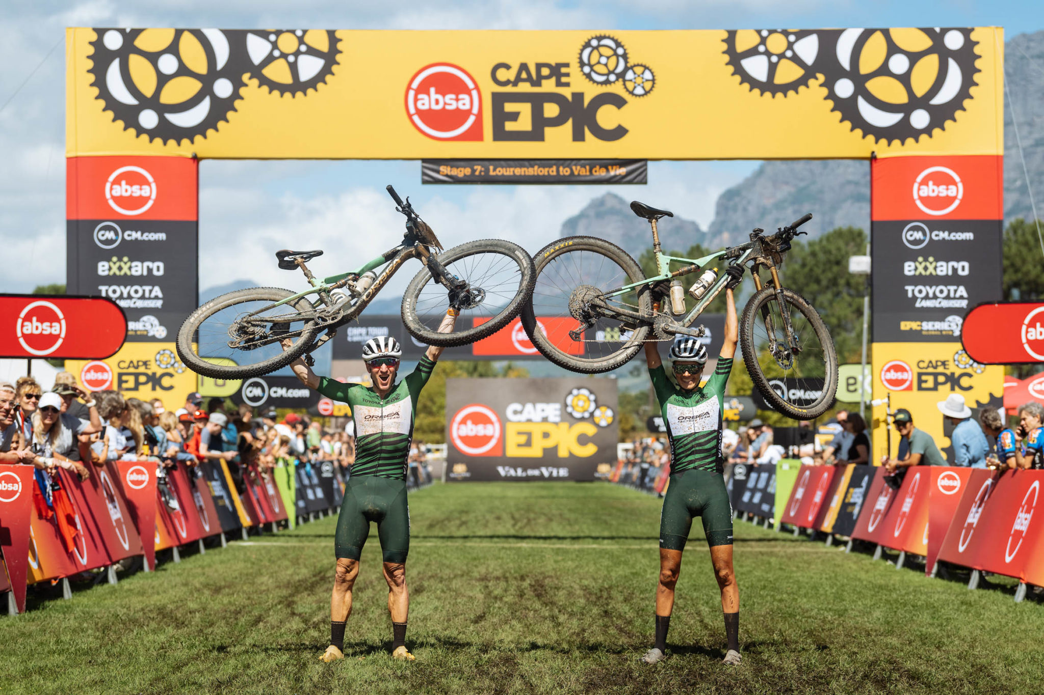 Voilà le premier équipage à se présenter sur la ligne d’arrivée de cette étape finale du Cape Epic 2023, et il s’agit des vainqueurs en titre, Georg Egger et Lukas Baum (Orbea X Leatt X Speed Company). Les deux hommes ont bouclé cette édition en 26 heures, 20 minutes et 53 secondes.