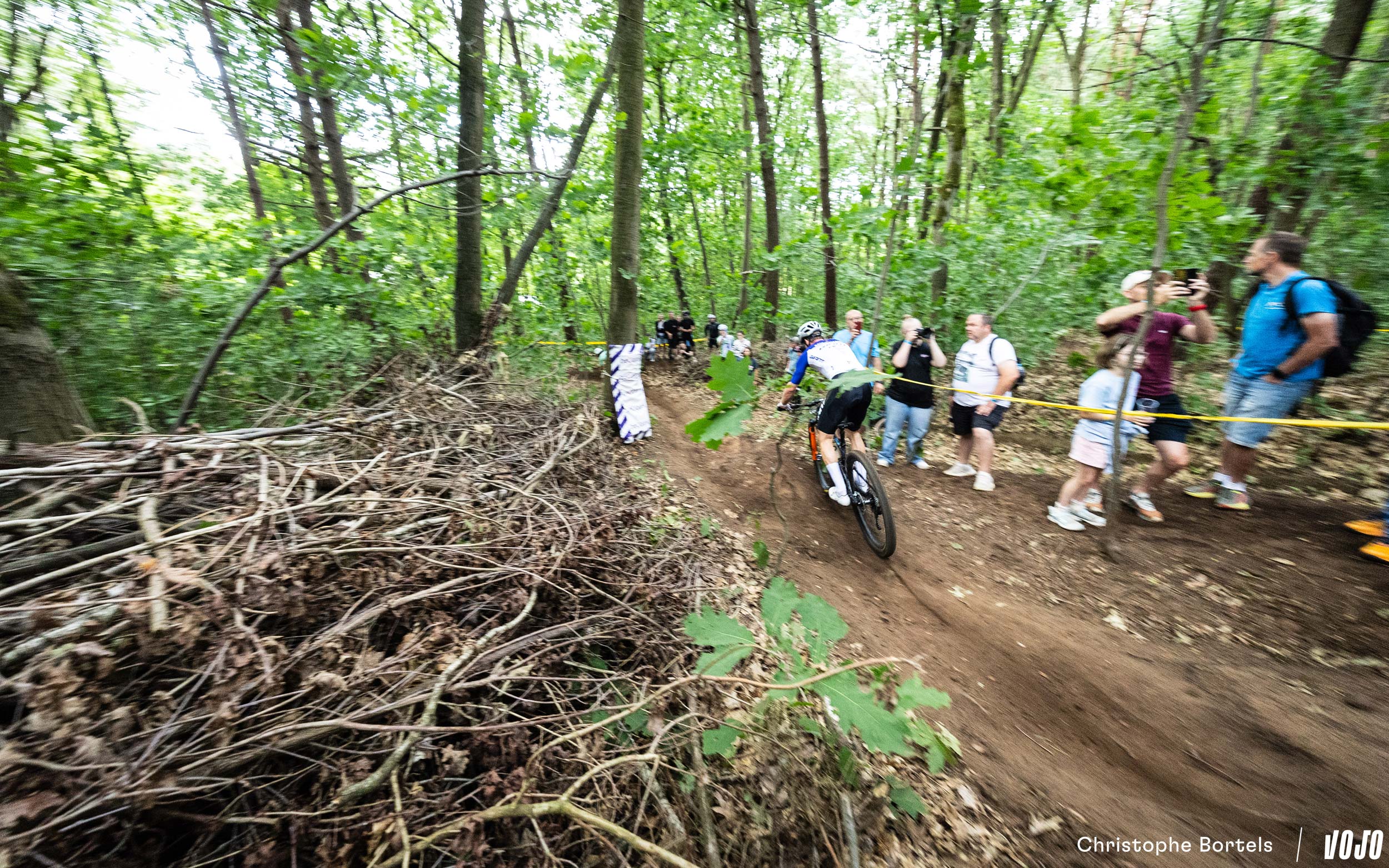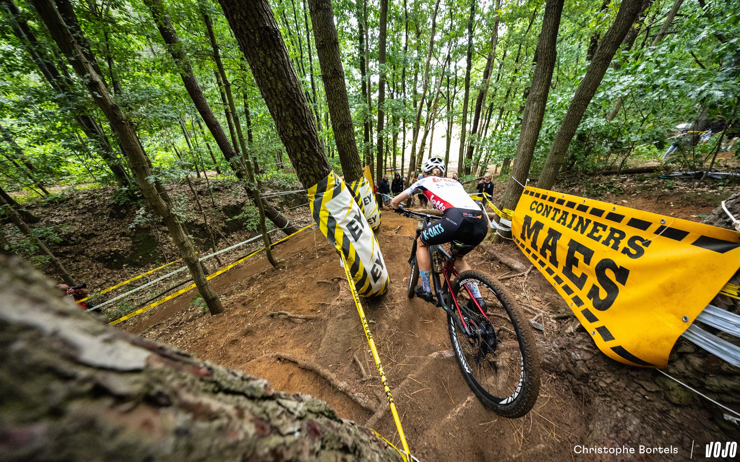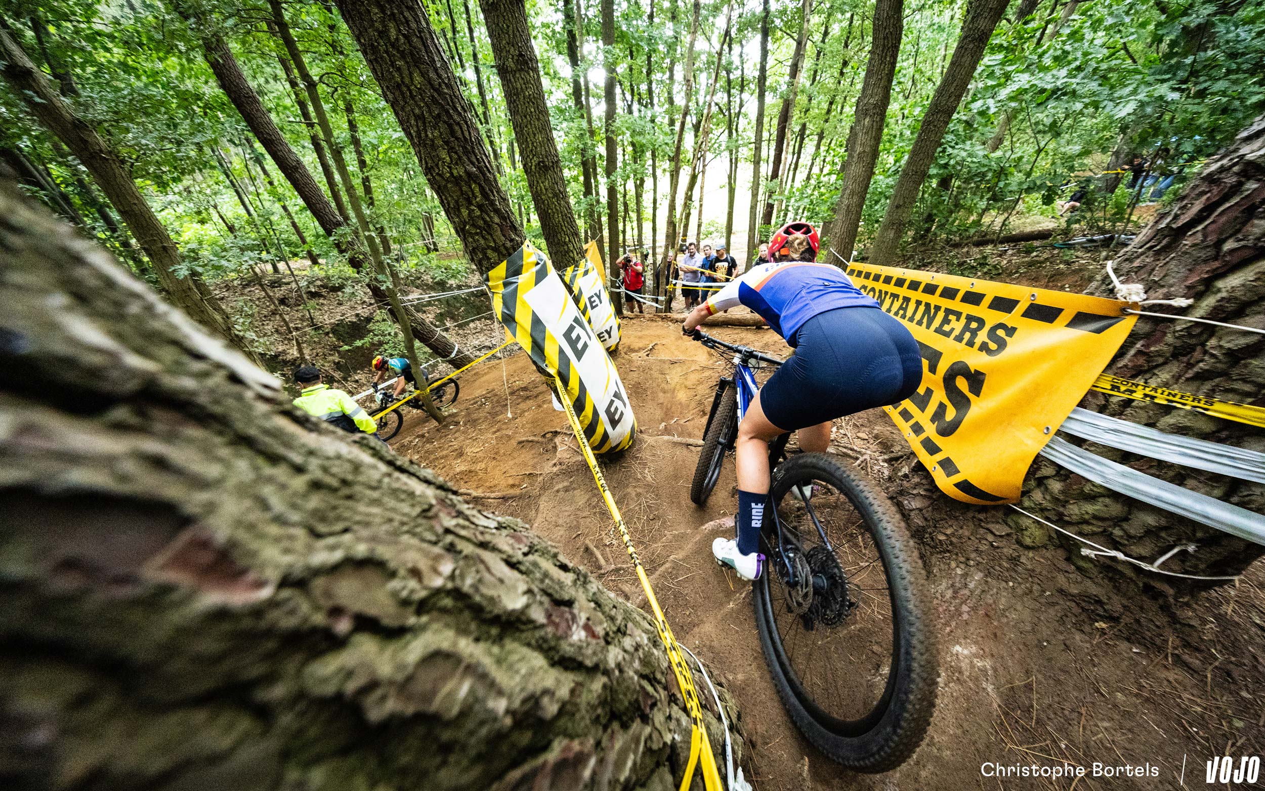 Difficile de prendre la succession d’Houffalize, qui reste un endroit mythique malgré ses défauts, alors que Beringen et son terril nous avaient proposé l’année dernière un sympathique terrain de jeu pour le XC. Cette fois, place à un parcours boisé de 5 km à deux visages : une première partie très roulante et rapide, sans véritable côte ou descente, puis une seconde moitié bien plus intéressante et exigeante, composée d’une succession de petites descentes/montées raides truffées de virages serrés, de sauts, de drops et de racines. Les puristes resteront dubitatifs face à ce circuit loin des standards modernes comme on en trouve en coupe du monde, d’autres comme nous répondront qu’un peu de variété ne fait pas de tort, et que dans tous les cas c’est toujours mieux que de ne pas avoir de championnats du tout !