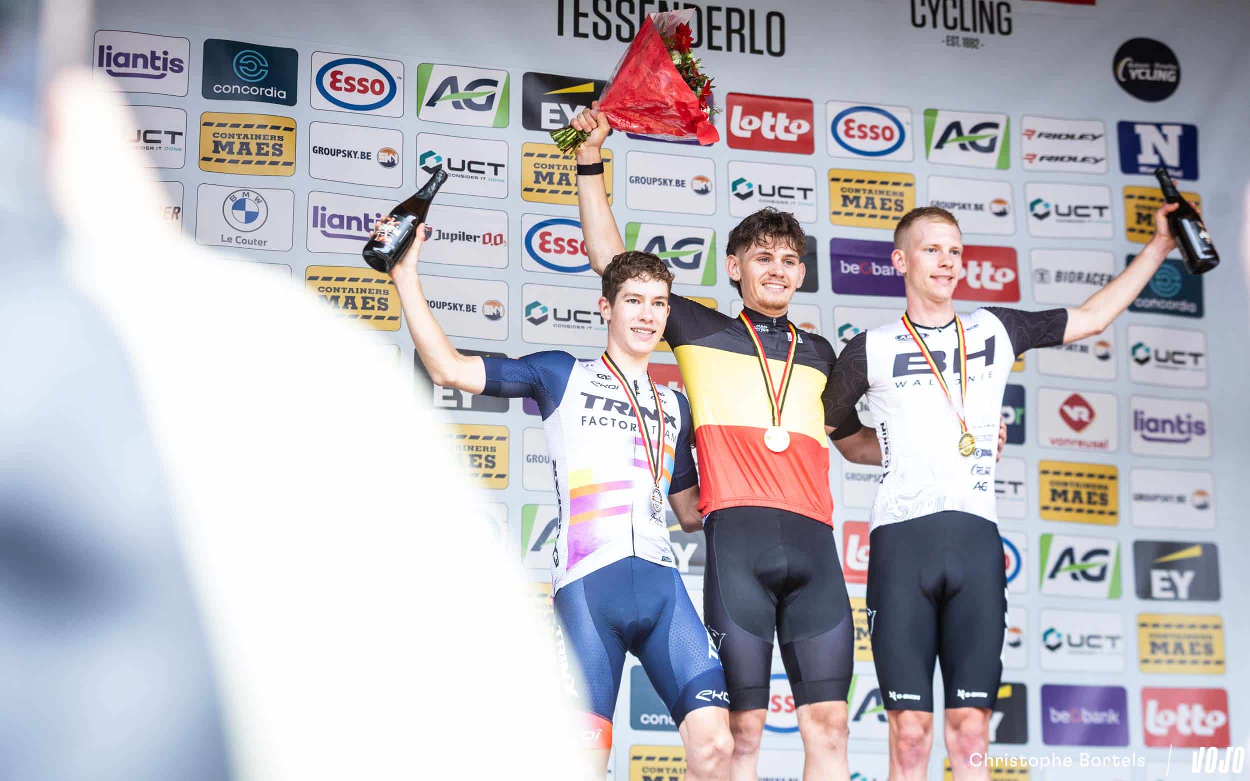 Le podium Elites : Pierre de Froidmont entouré de Jens Schuermans (2e) et Tom Van Ingelgom (3e et champion de Belgique Elite 2).