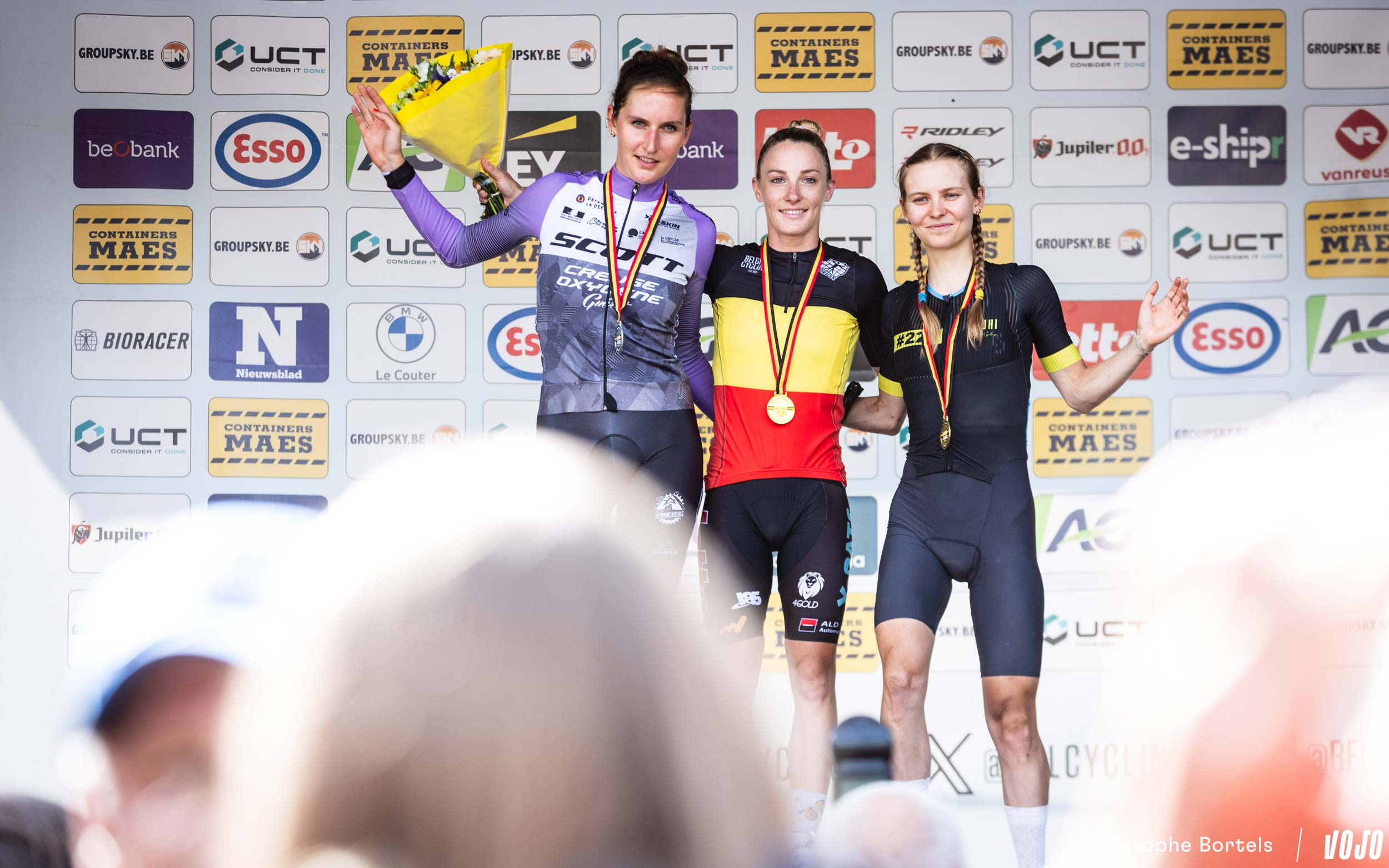 Le podium Elites Femmes : Alicia Franck entourée d’Emeline Detilleux et Britt Segers.