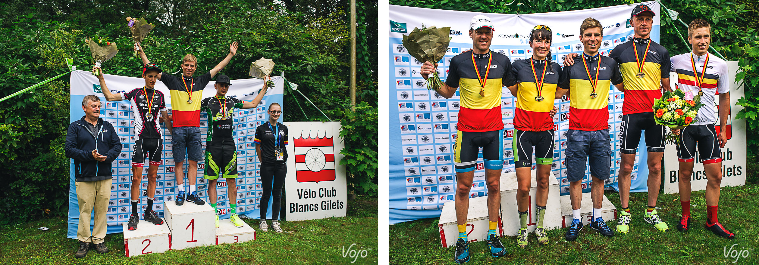 Voici le podium Elite avec, de gauche à droite, Wout Alleman, Frans Claes et Joris Massaer, ainsi que tous les champions de Belgique et leurs maillots.