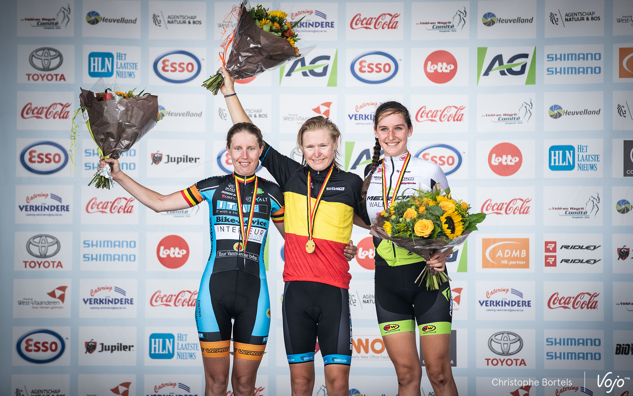 Le podium des Dames Elites : Joyce Vanderbeken (2e), Githa Michiels (1ère) et Emeline Detilleux (3e).