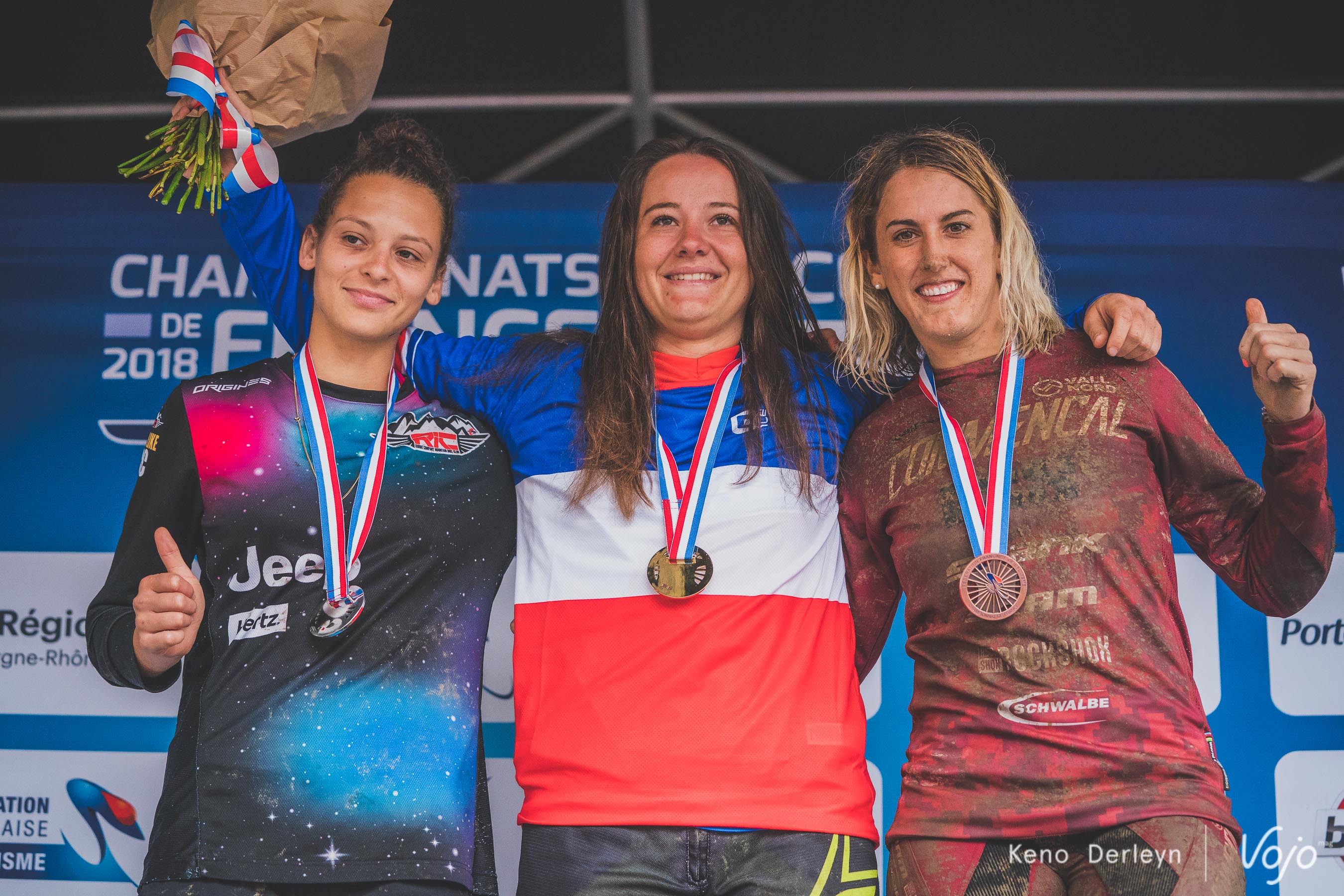 Championne Juniors en 2012, Fiona roulera pour une année entière avec la manche tricolore sur son maillot et elle l’inaugurera d’ailleurs sur la manche de La Bresse fin août pour la finale de la Coupe du Monde ! A la deuxième place, on a le plaisir de retrouver une représentante de l’Île de la Réunion, Adelina Fontaine : « Oui je suis heureuse mais je sais que les conditions n’étaient pas les mêmes pour toutes. On a eu de la boue aussi, un peu de pluie, ça glissait mais je sais qu’elles étaient bien plus en galère que nous ! »