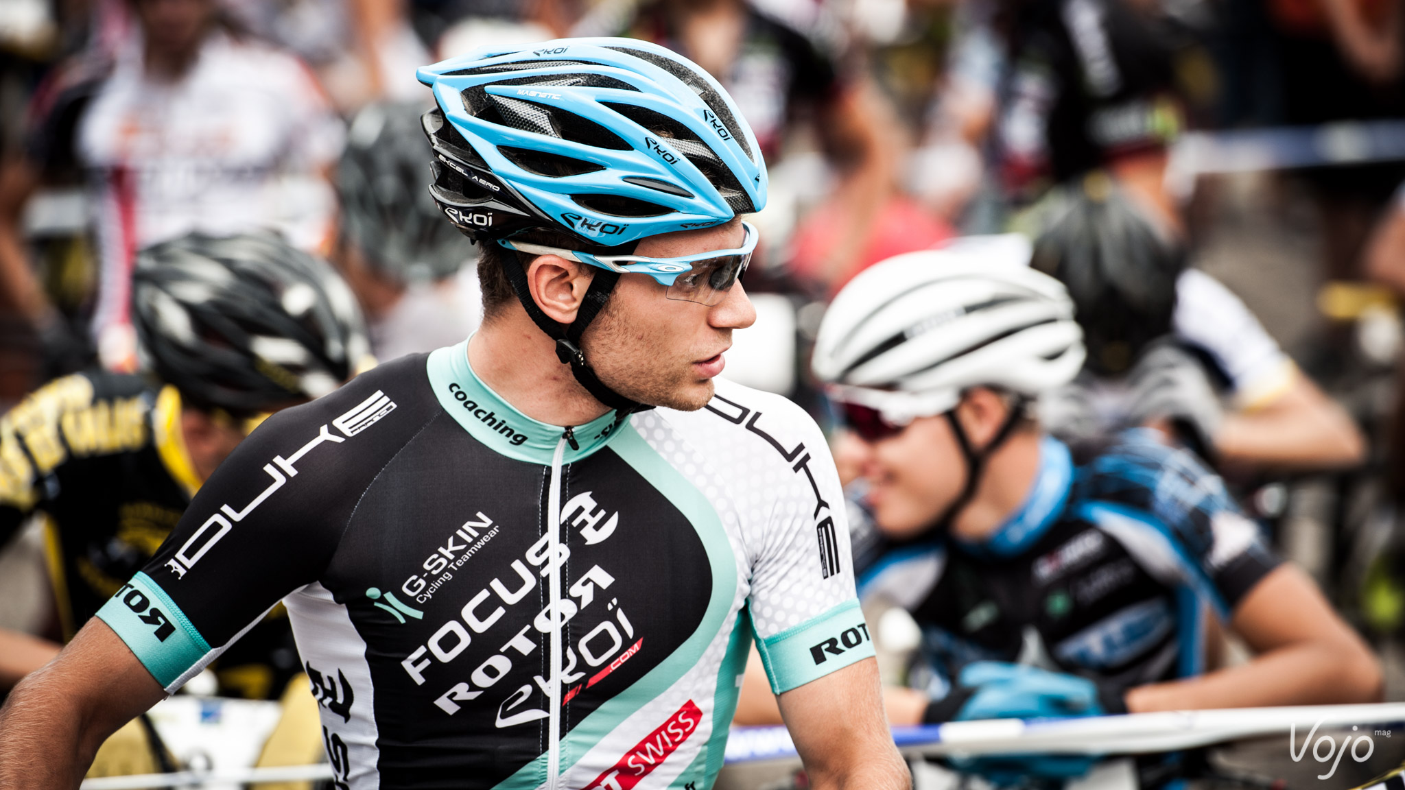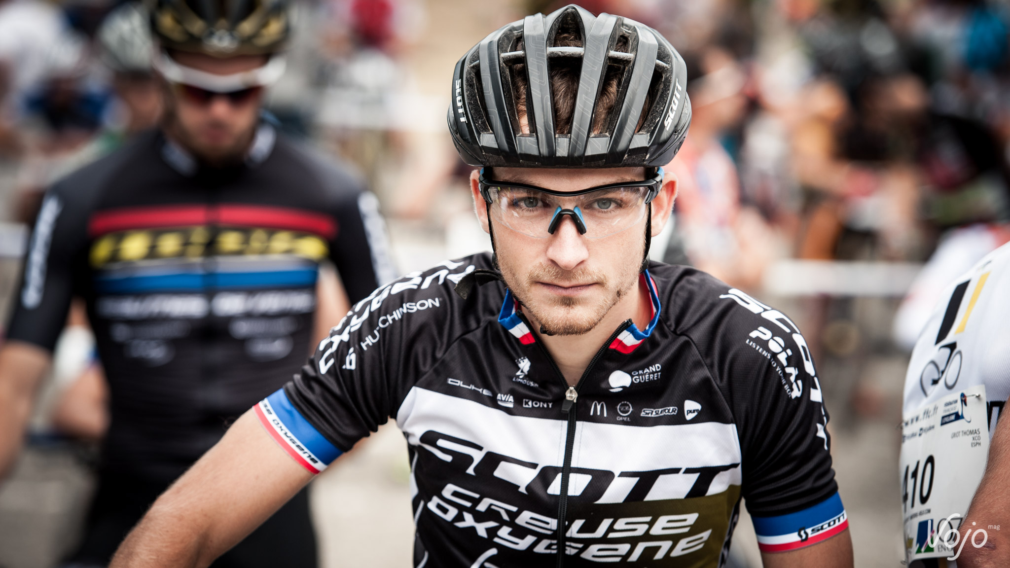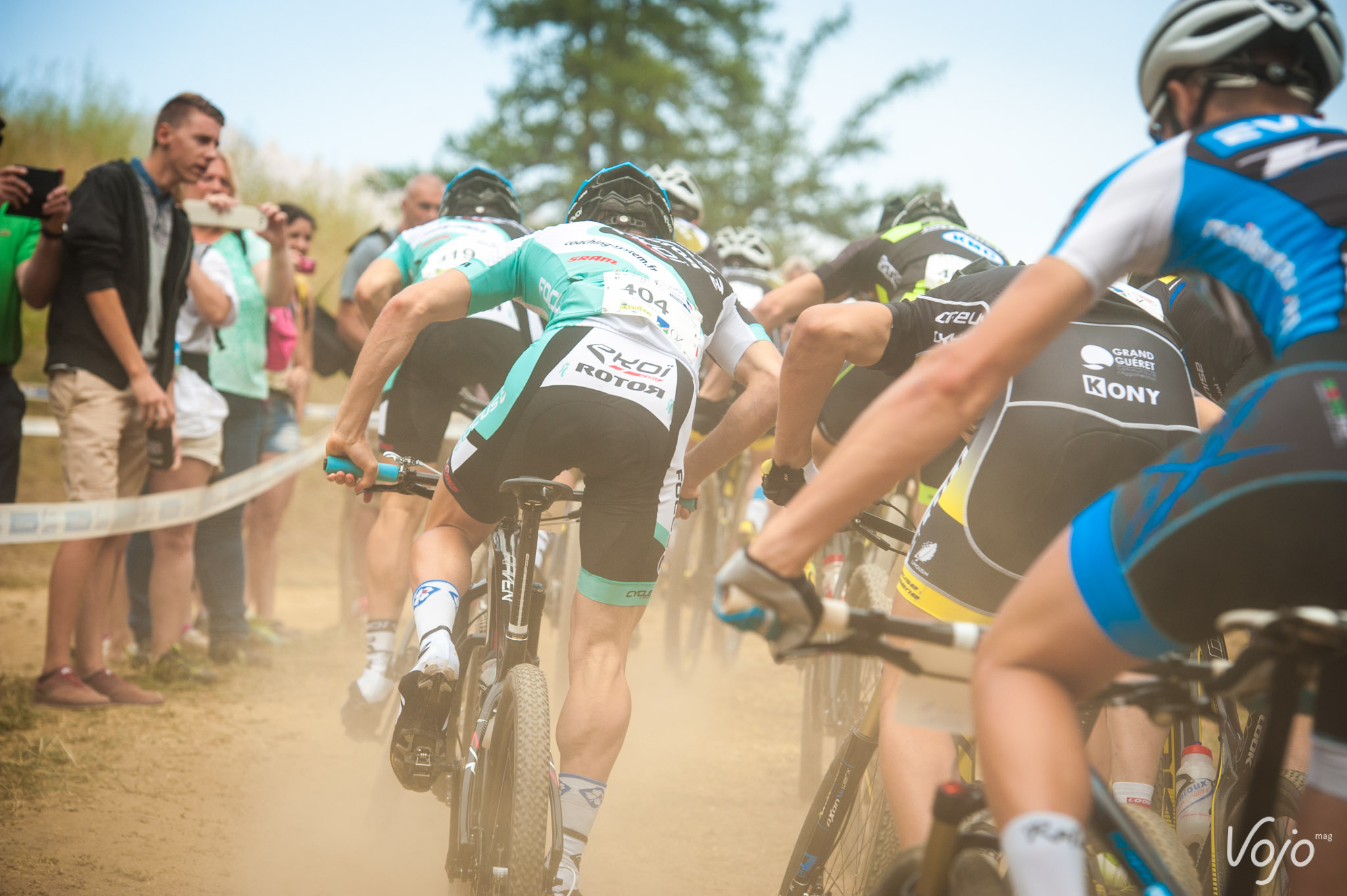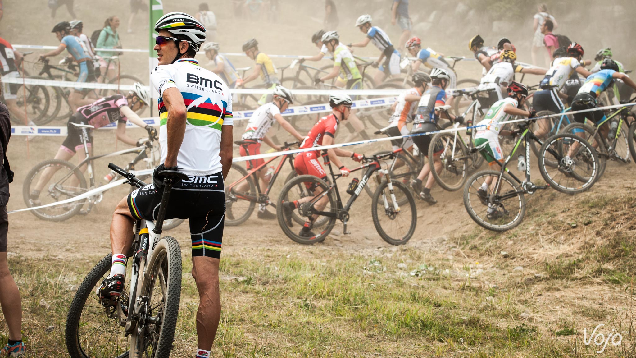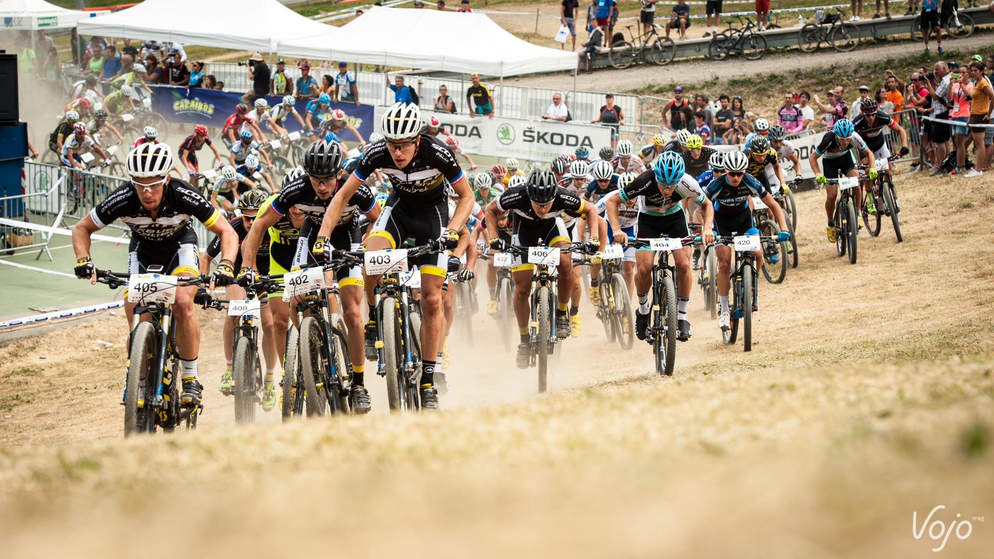 C’est sous bonne garde que la meute s’élance. Julien Absalon vient assister au départ de la course espoir. Cela va se jouer entre Titouan et Victor.
