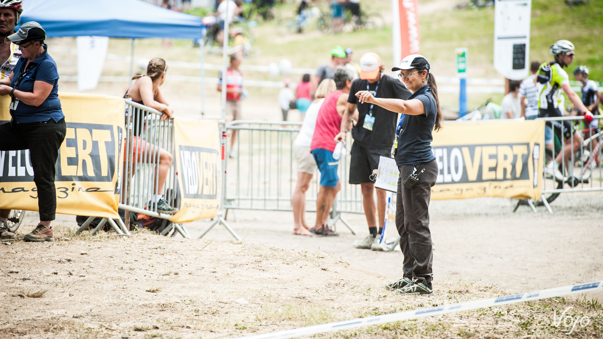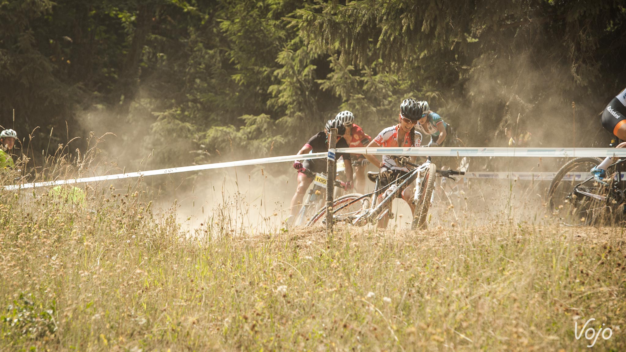Samedi, 12h45, la course élite dames est prête à s’élancer. Sur la première ligne, on retrouve Pauline Ferrand-Prevot mais non loin d’elle se trouvent les favorites de la catégorie espoir. Les deux courses sont mélangées et c’est tant mieux car les seconde et troisième places seront occupées par des espoirs.
