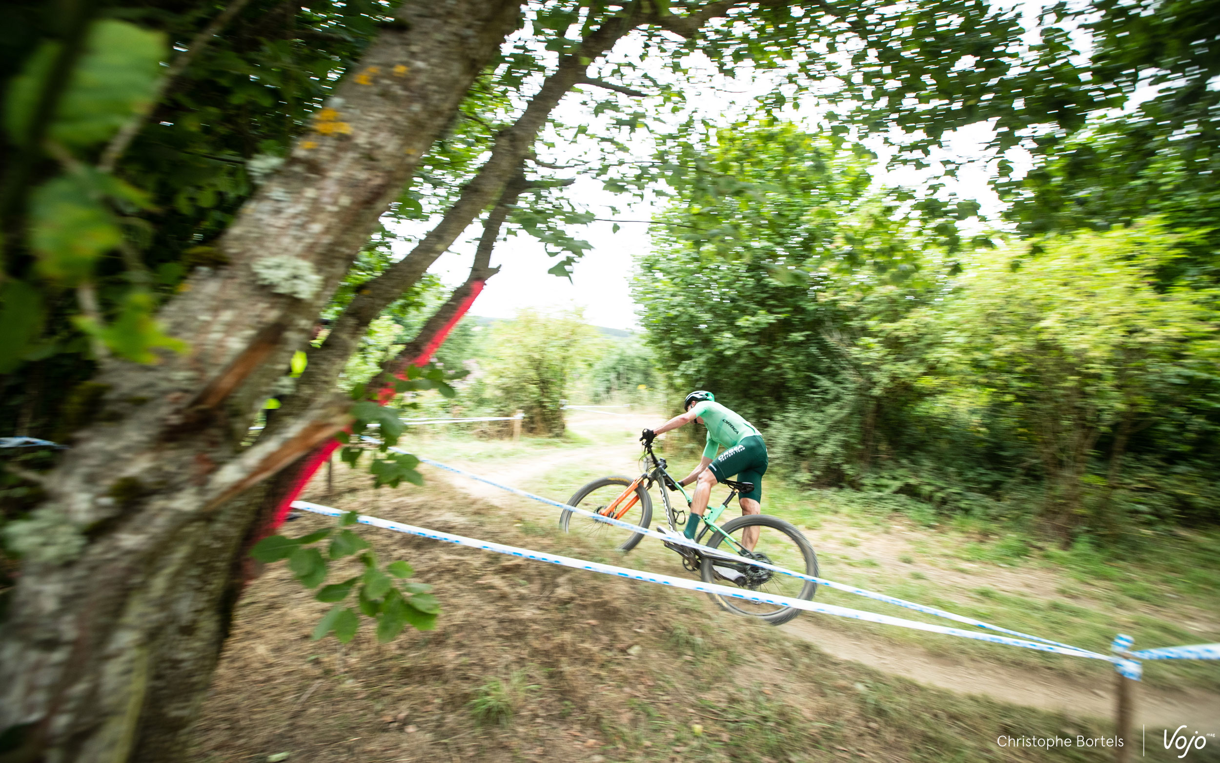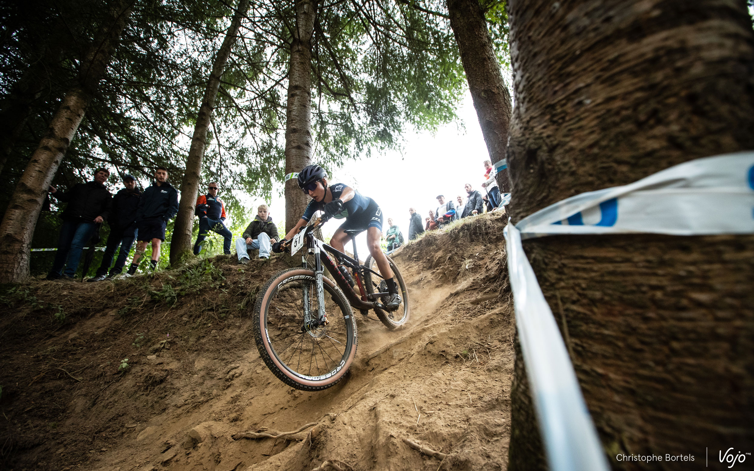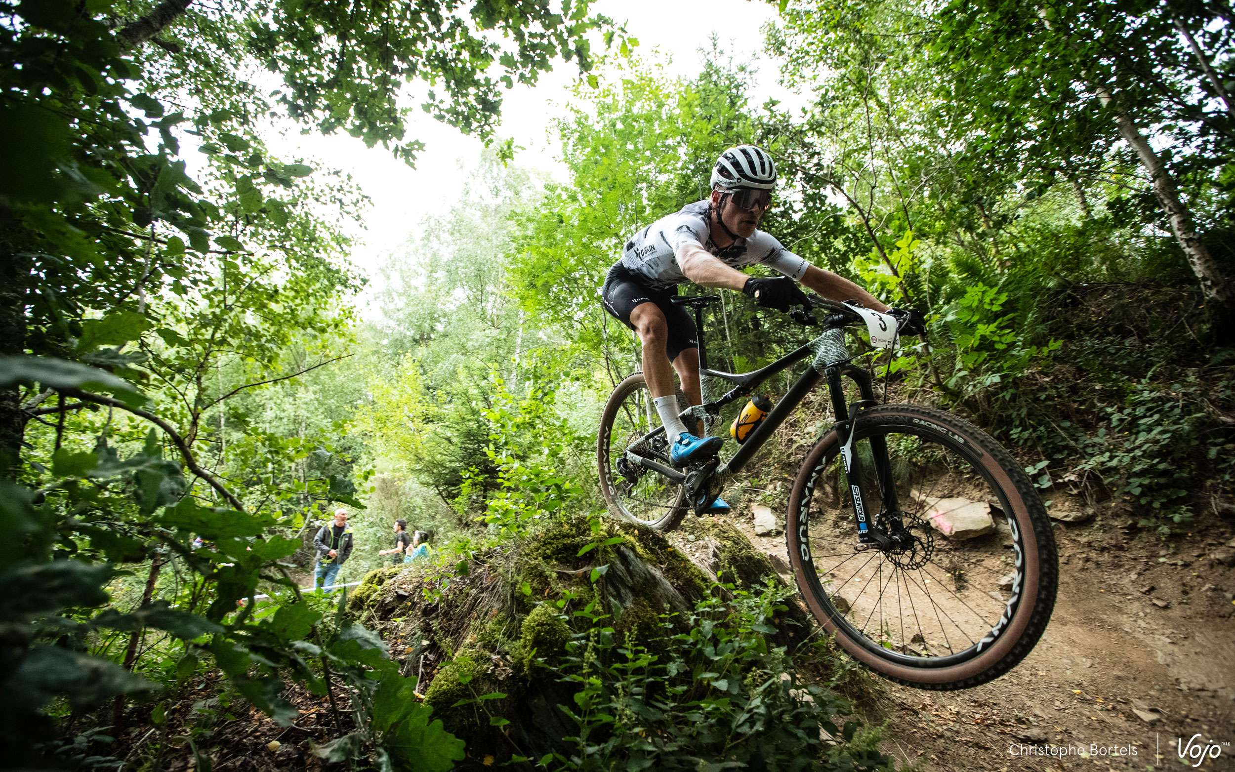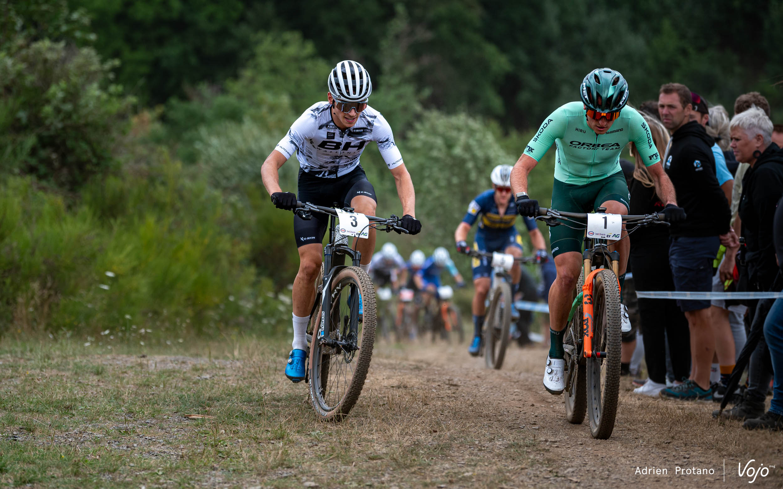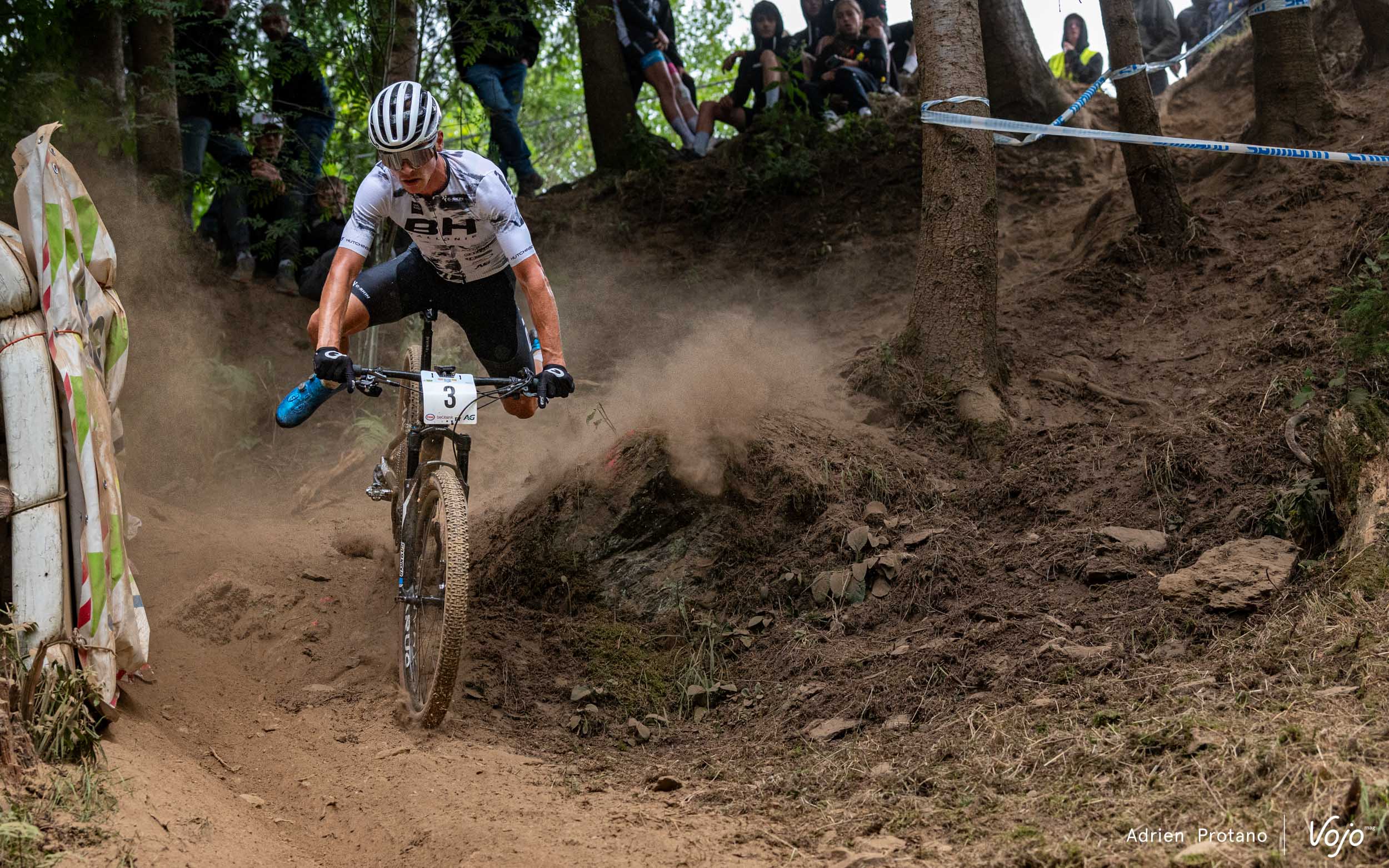 C’est Jens Adams qui se présente en tête dans le premier virage, coude à coude avec les deux hommes du BH Wallonie MTB Team. Les deux grands favoris du jour, Pierre de Froidmont et Jens Schuermans, se voient enfermés juste derrière.