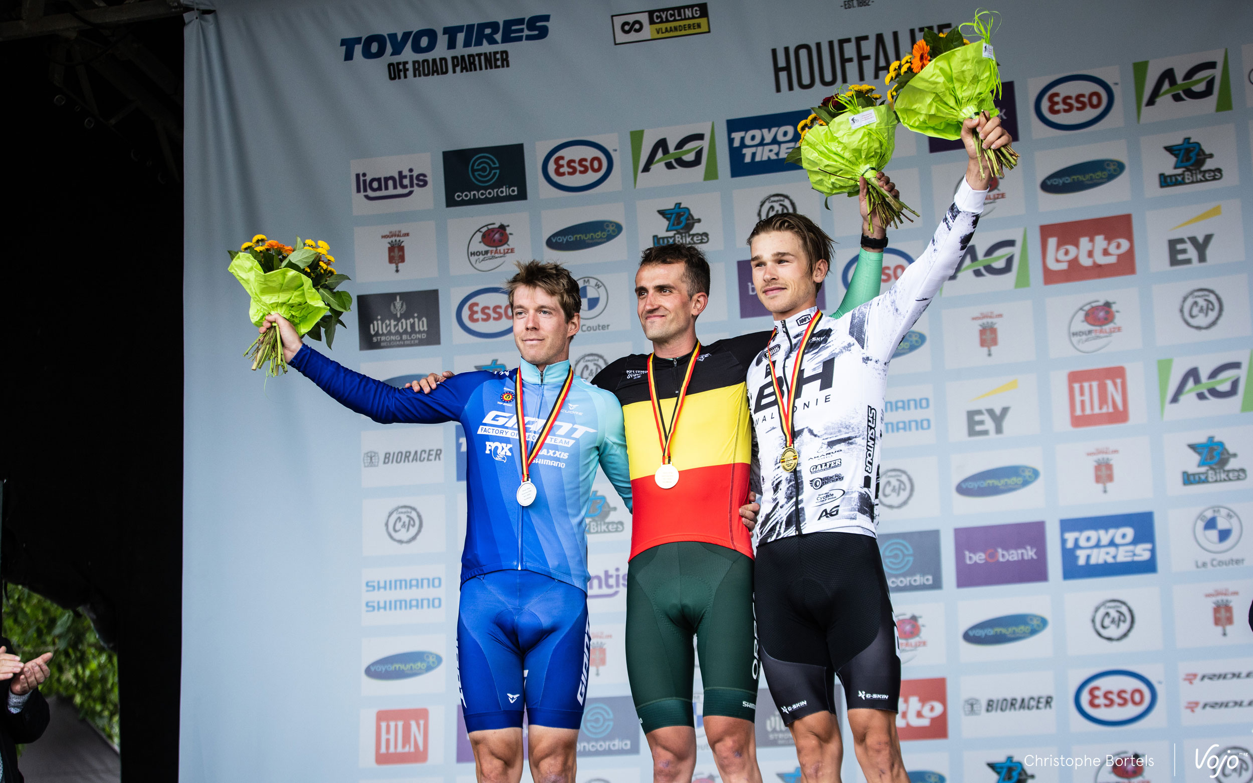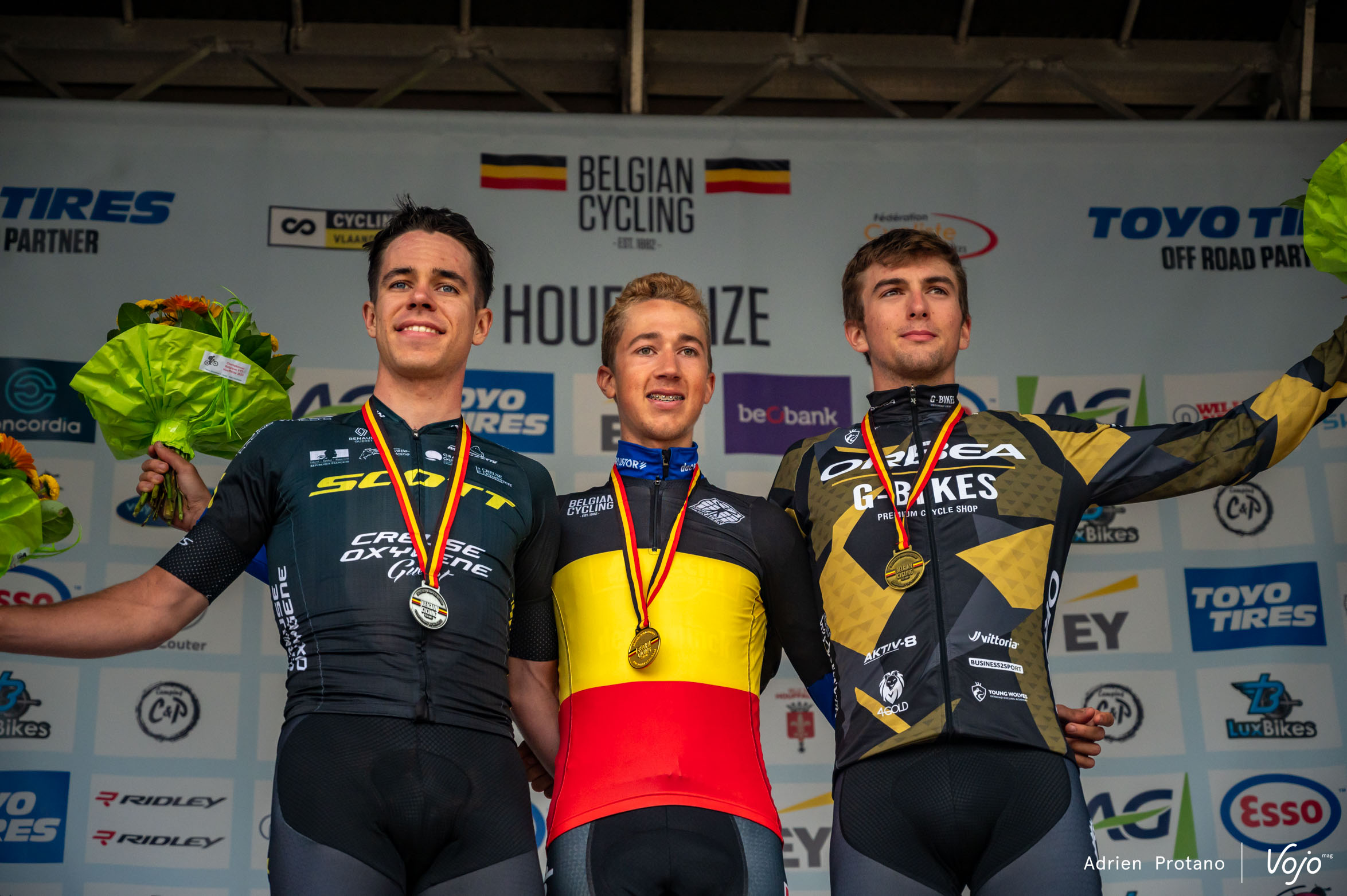 Médailles autour du coup et maillot noir-jaune-rouge sur les épaules, voici le podium des championnats de Belgique XCO millésime 2023.
