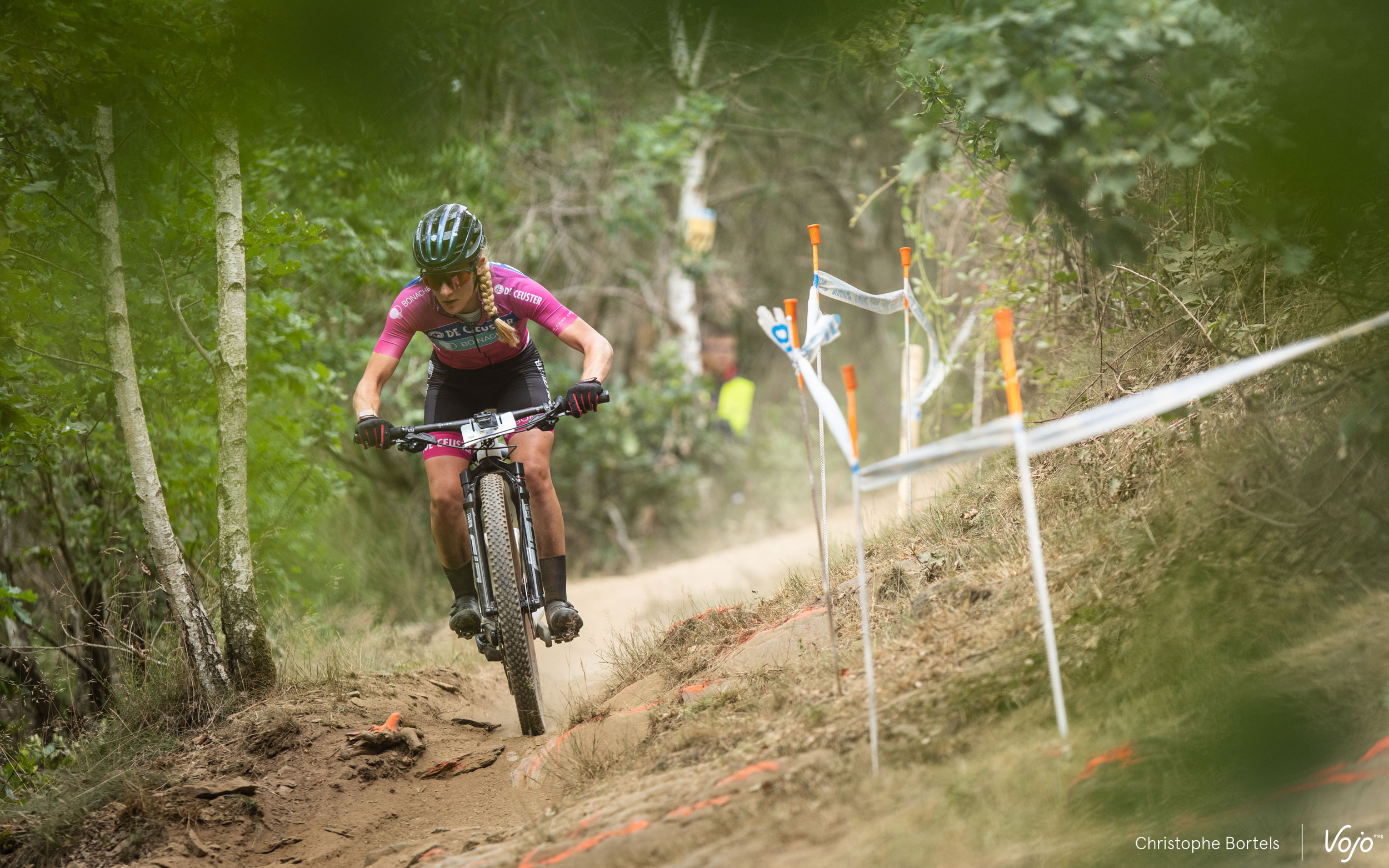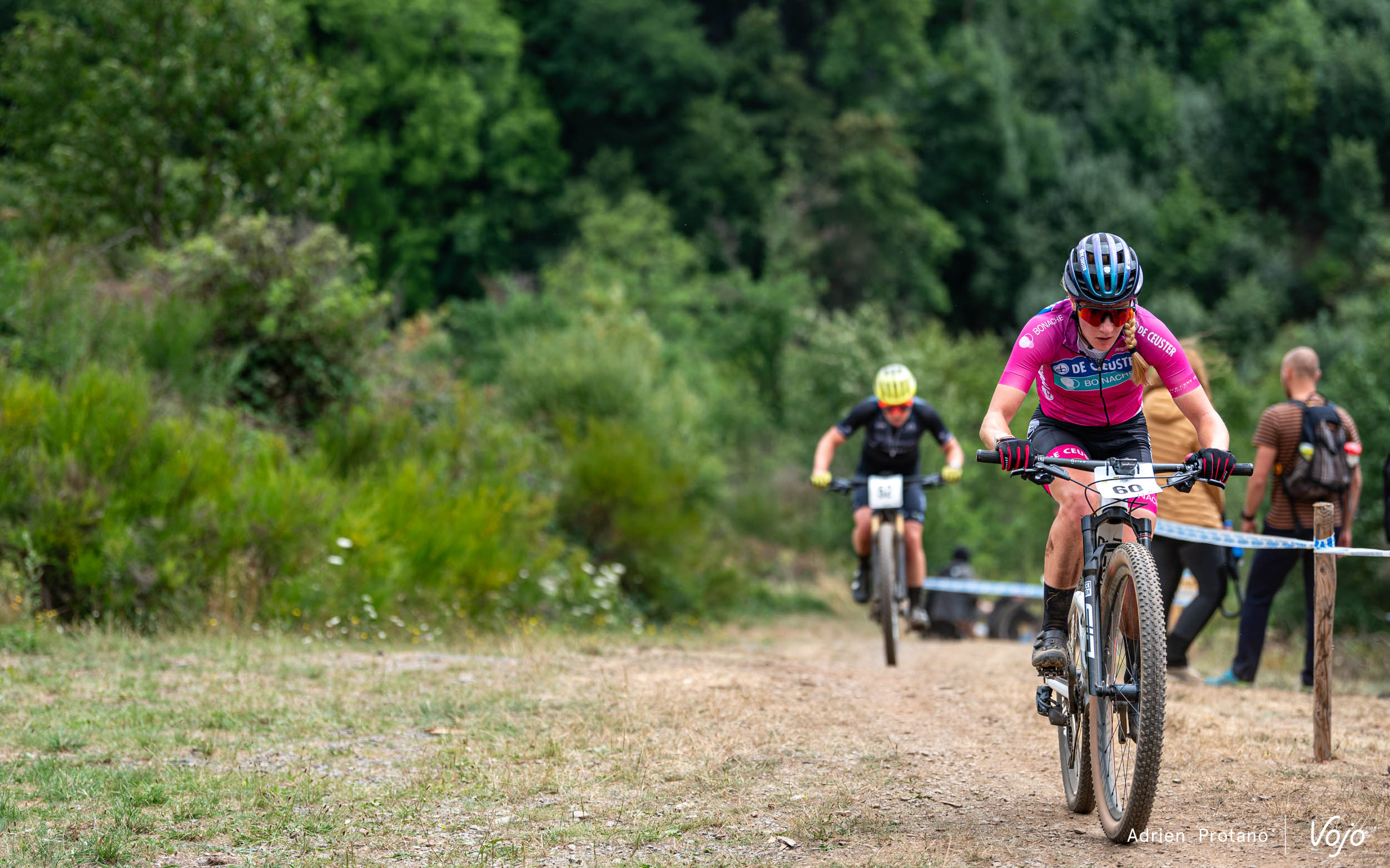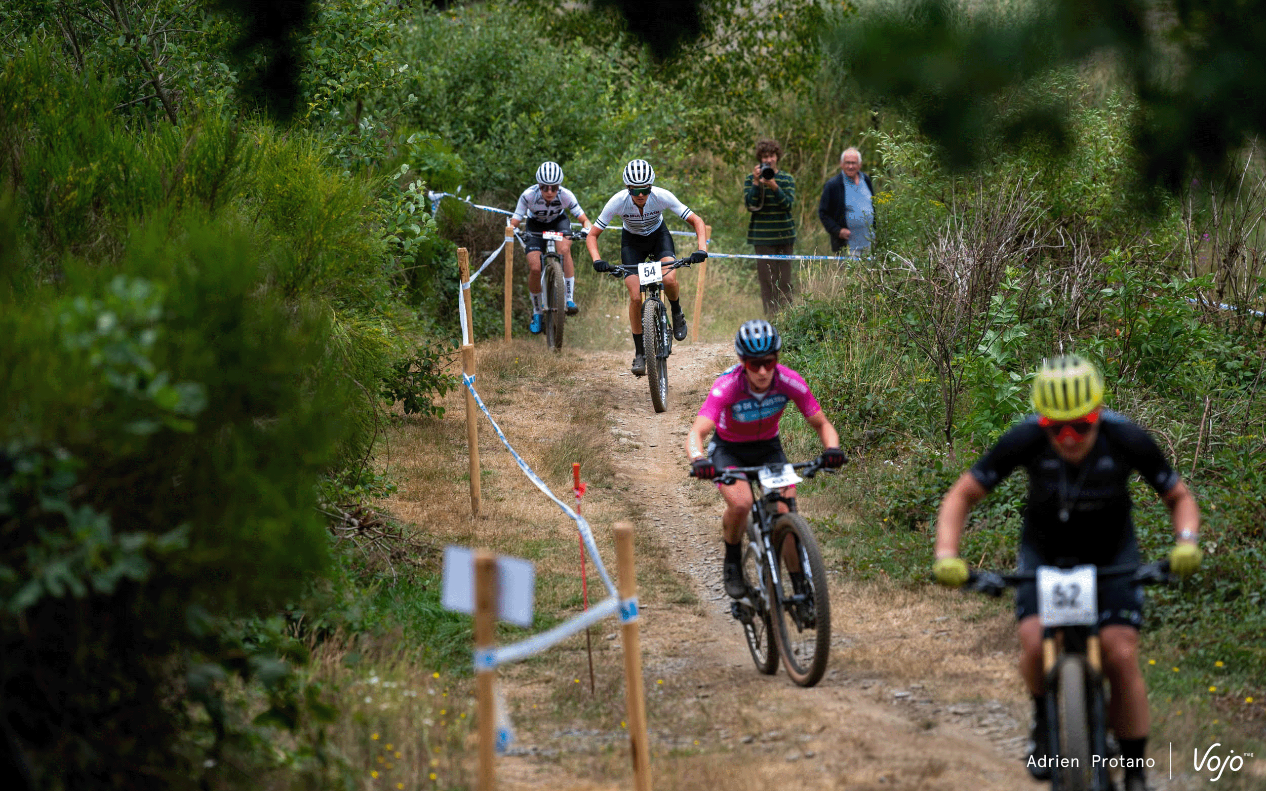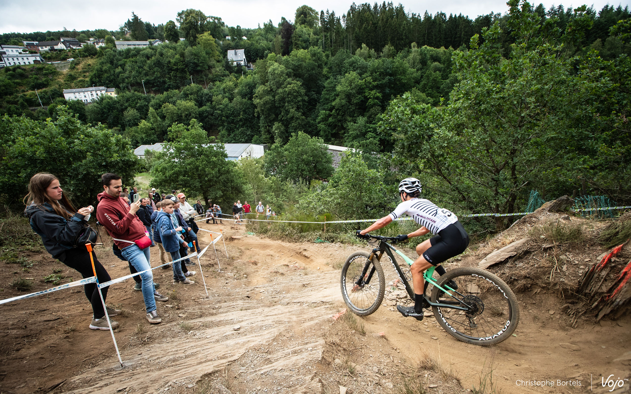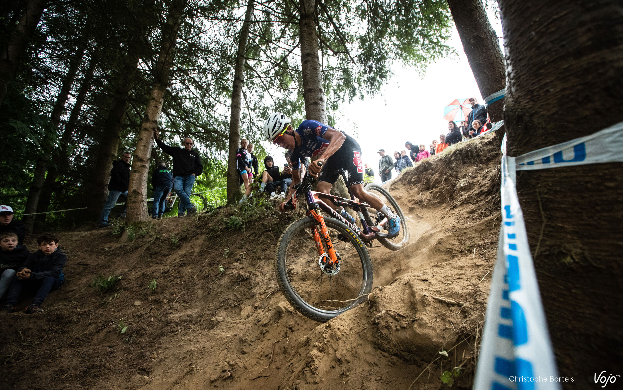 Mais le pilote de l’Orbea Factory Team n’attendra pas longtemps avant de prendre les commandes. Dans cette longue montée située dans la dernière section du circuit, Pierre de Froidmont teste son adversaire et finit par passer en tête. Quelques mètres derrière, on peut apercevoir Daan Soete, seul entre le duo de tête et le groupe situé derrière lui.