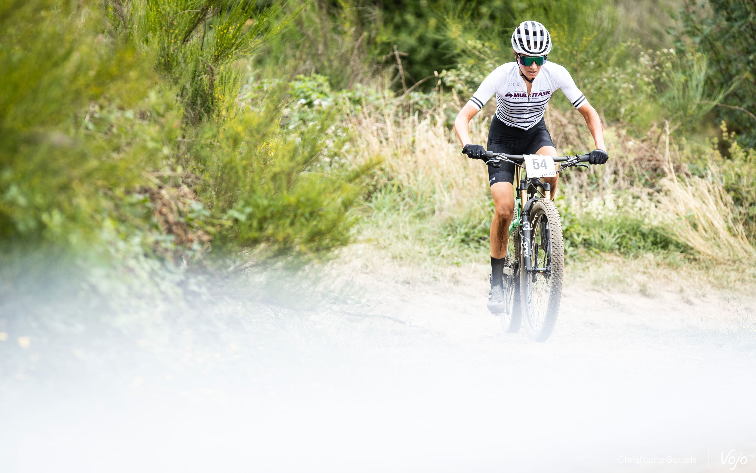 Le bras et l’épaule marqués par la poussière de la pilote du BH Wallonie MTB Team nous laissent comprendre que le retard de celle-ci est sûrement dû à une chute. Cette hypothèse sera confirmée par la pilote à l’arrivée.