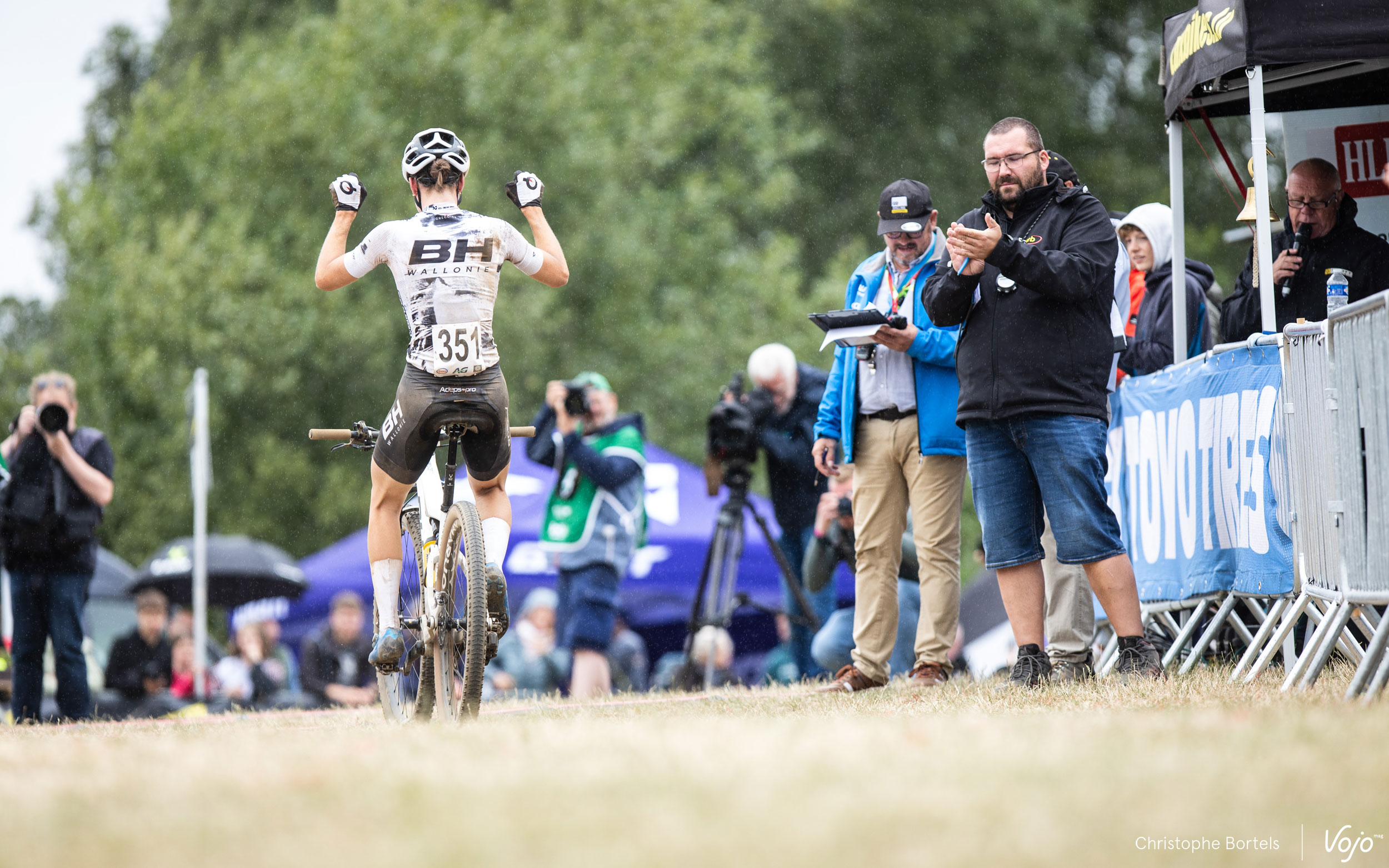 Et c’est parti pour 5 tours de course sur ce circuit de 3,920 kilomètres autour (et sur) cette bute de Sertemont, qui a jadis accueilli des manches de coupe du monde. Si l’édition 2022 s’était déroulée dans une réelle fournaise sous plus de 30°c au soleil, c’est davantage les nuages et la pluie qui semblent avoir été prévus par Madame Météo pour ces championnats de Belgique XCO 2023.