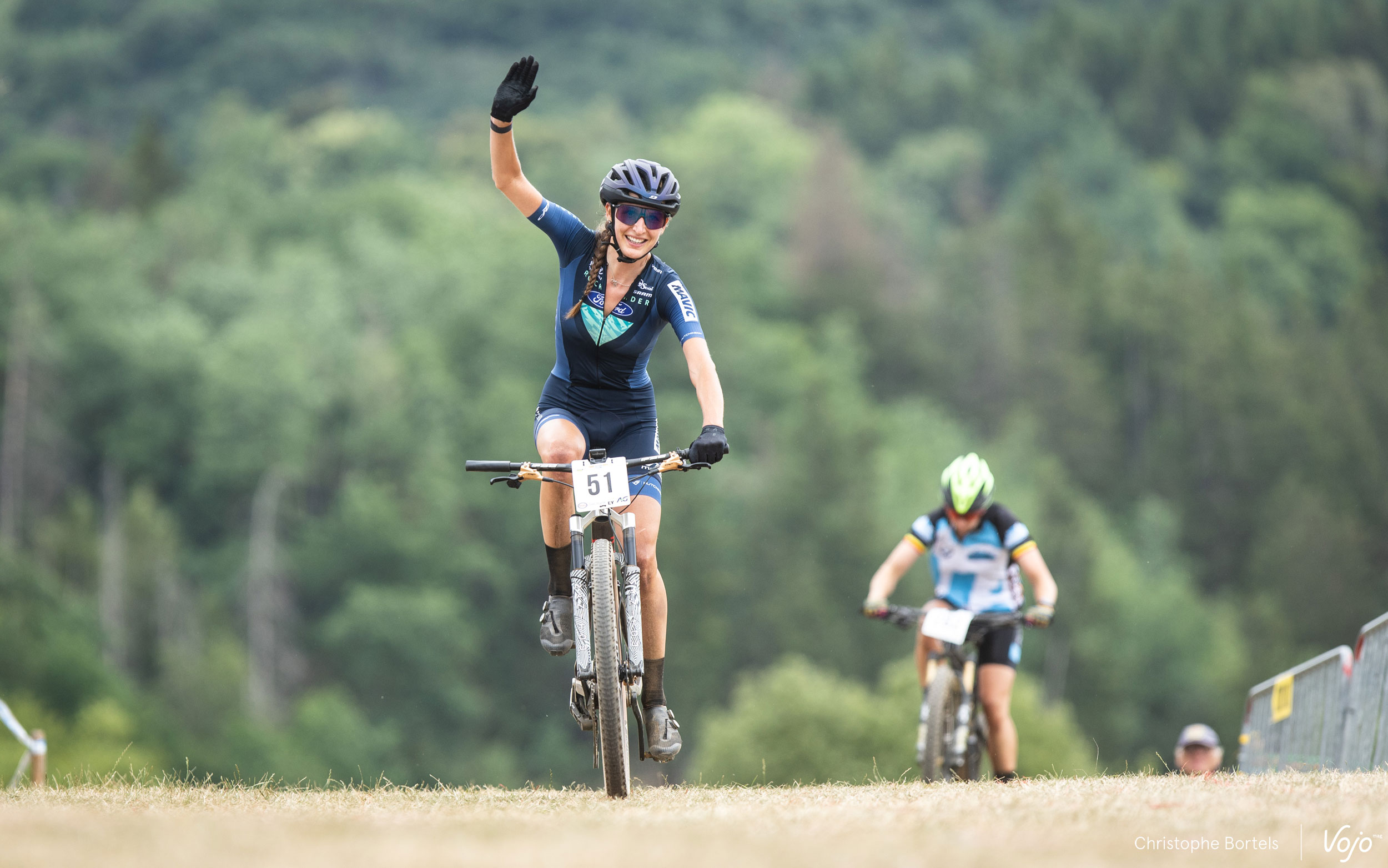 Et voilà Julia Grégoire qui franchit la ligne d’arrivée au terme de son 4e tour. En effet, si la pilote du BH Wallonie MTB Team pointait en 5e position au scratch, elle demeure toutefois en catégorie U23 pour laquelle la course dure un tour de moins que les Élites. Après sa domination du XCC du vendredi, Julia Grégoire s’empare une nouvelle fois du maillot tricolore ce dimanche !