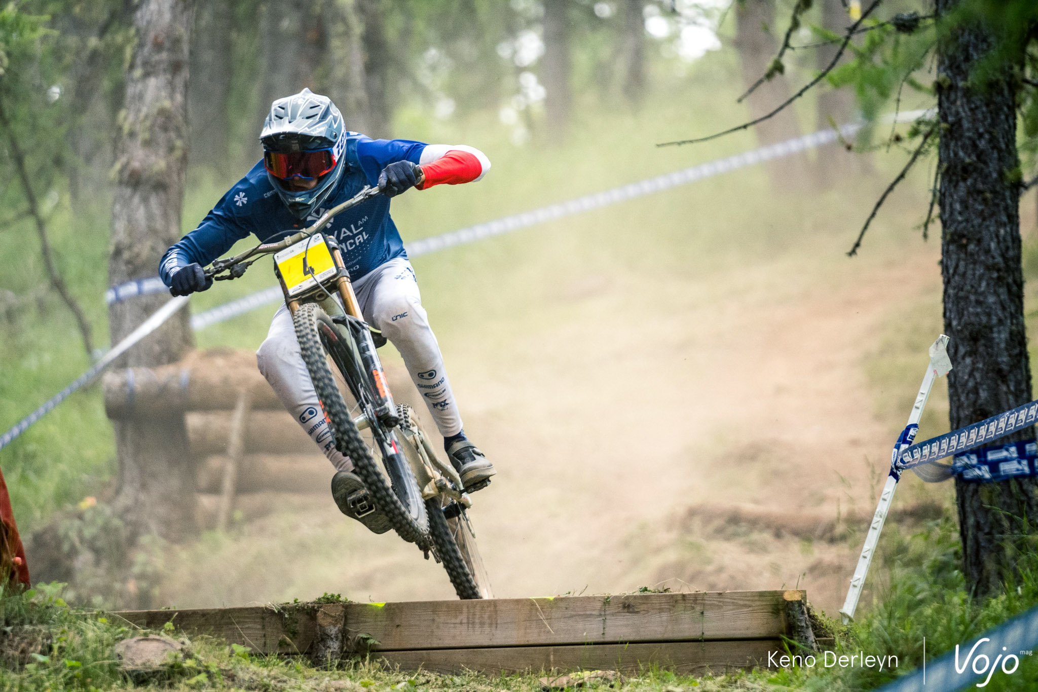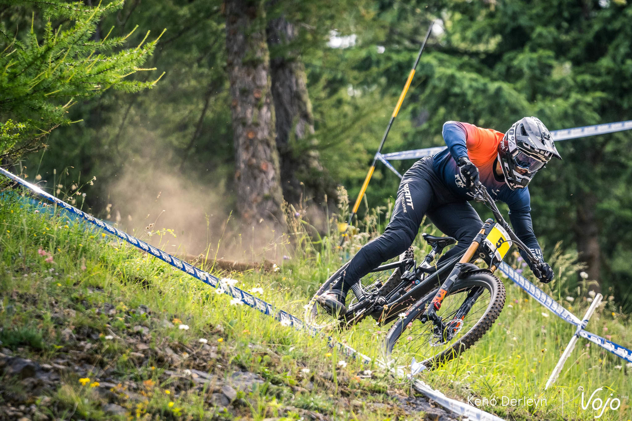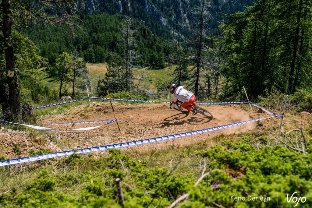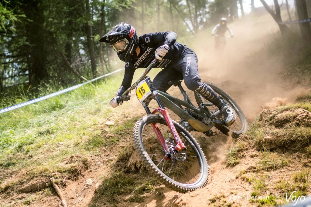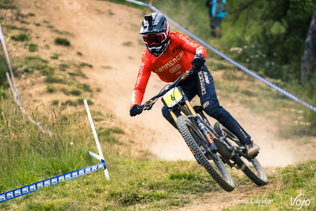 La piste qui accueillait ses championnats de France est très particulière. Plutôt courte (moins de trois minutes), elle commence par une longue section de pédalage d’une trentaine de secondes, à peine entrecoupée par quelques sauts. Un départ de BMX ou d’enduro qui met les pilotes dans le rouge d’emblée, et derrière, impossible de récupérer jusqu’à l’arrivée puisqu’on plonge directement dans la pente, où dévers, racines et cailloux s’enchaînent avec un grip très changeant tout au long de la semaine.