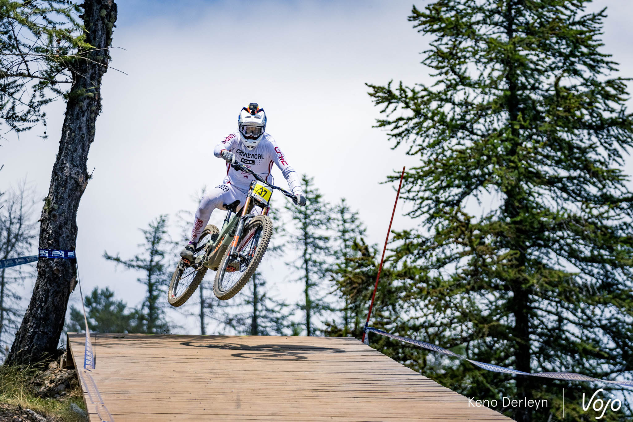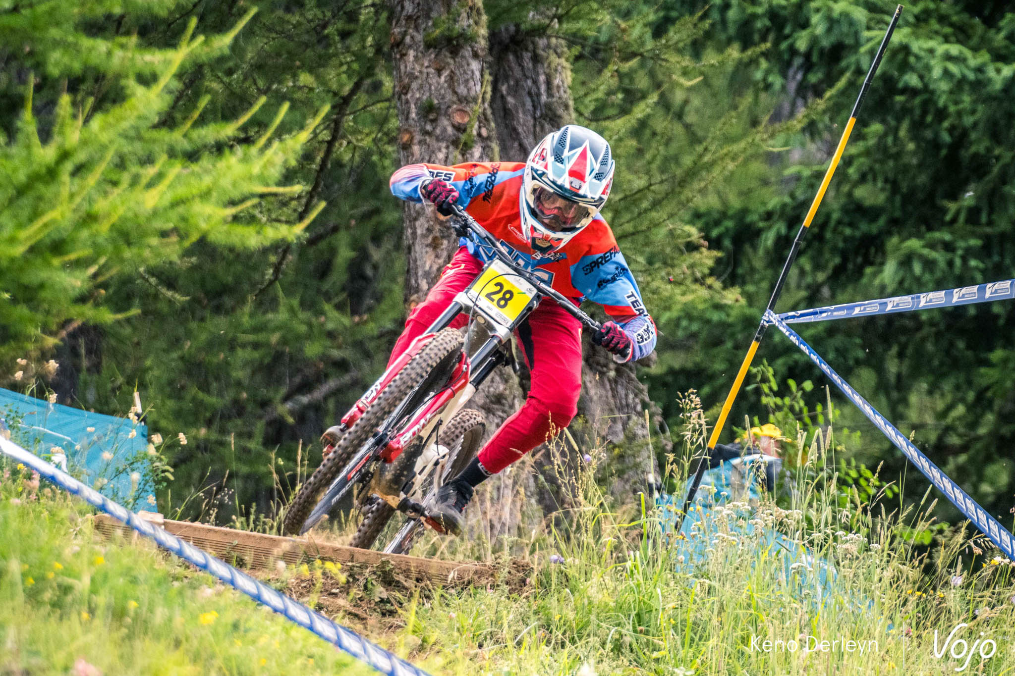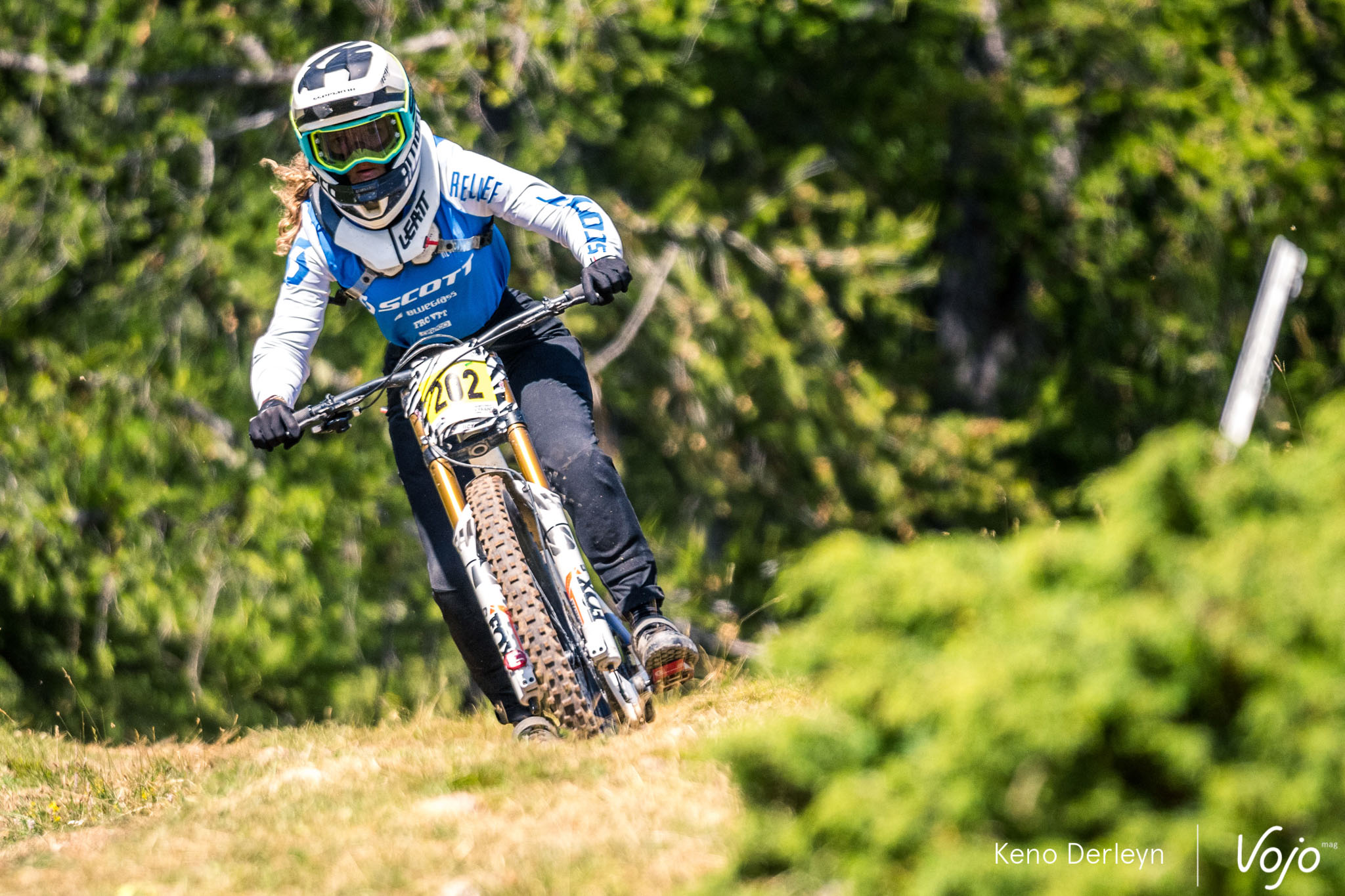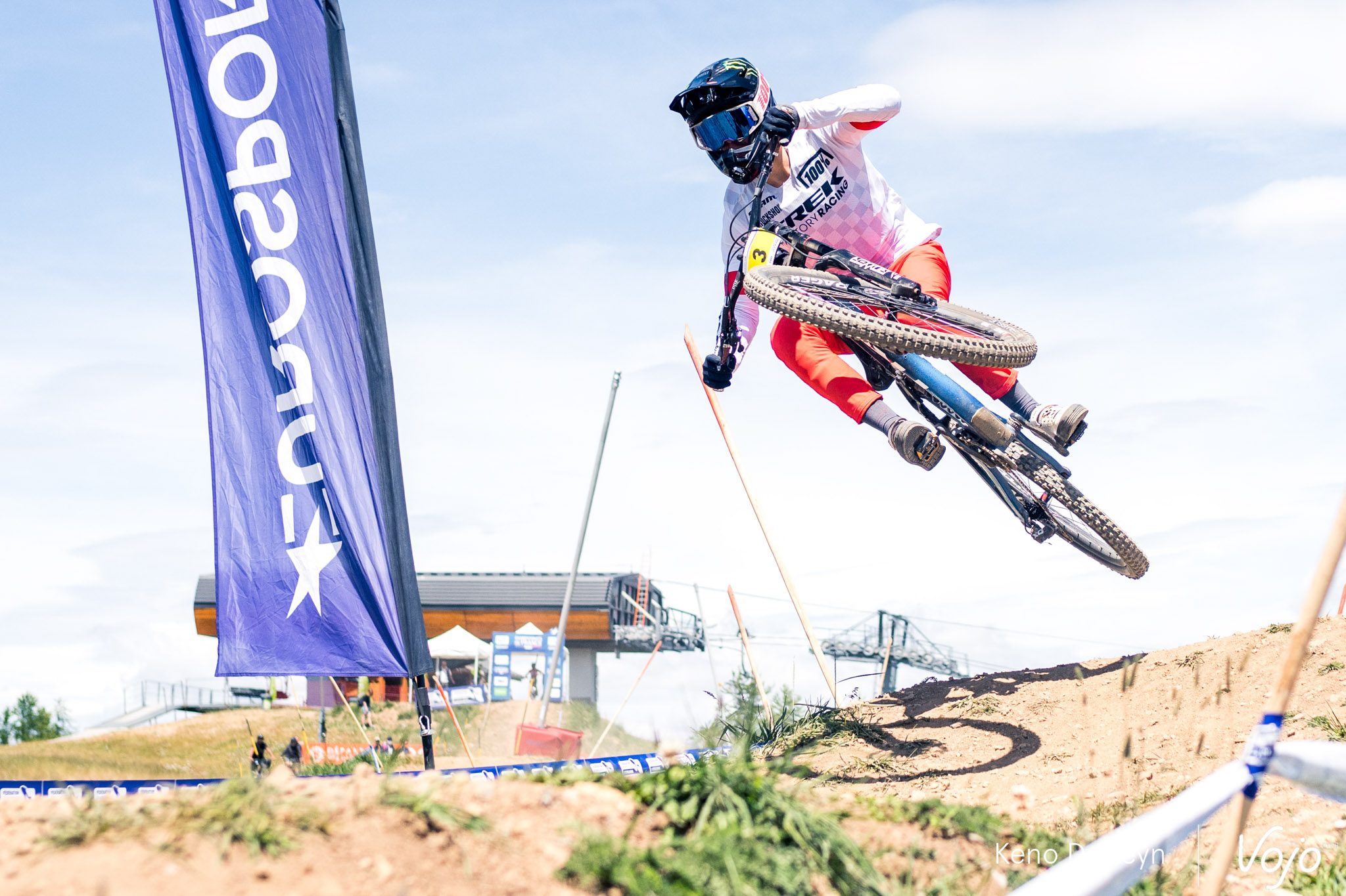 La piste qui accueillait ses championnats de France est très particulière. Plutôt courte (moins de trois minutes), elle commence par une longue section de pédalage d’une trentaine de secondes, à peine entrecoupée par quelques sauts. Un départ de BMX ou d’enduro qui met les pilotes dans le rouge d’emblée, et derrière, impossible de récupérer jusqu’à l’arrivée puisqu’on plonge directement dans la pente, où dévers, racines et cailloux s’enchaînent avec un grip très changeant tout au long de la semaine.