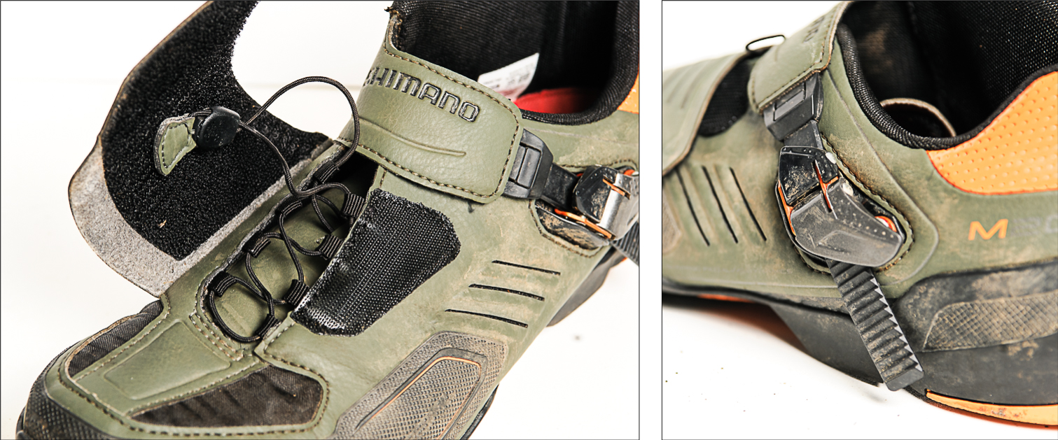 En dépit des renforts, leur poids n’a rien d’élevé, et ça se sent (762g la paire, soit à peine 100g de plus que les modèles de cross les plus légers). Pas de surchauffe non plus, malgré leur côté fort fermé, l’air parvient à circuler à l’intérieur. Enfin, côté durabilité, là aussi c’est du tout bon. Comme vous pouvez le voir sur les photos studio ci-dessus, effectuées à mi-parcours, mais alors que les chaussures avaient déjà été bien éprouvées sur des terrains difficiles, les matériaux gardent une apparence presque neuve. Pas de griffes sur le cuir, pas d’entailles dans la semelle, pas de coutures qui s’effilochent. La qualité Shimano est bien présente et on imagine sans peine que l’investissement de 189,95€ devrait pouvoir être amorti sur de longues années de pratique.