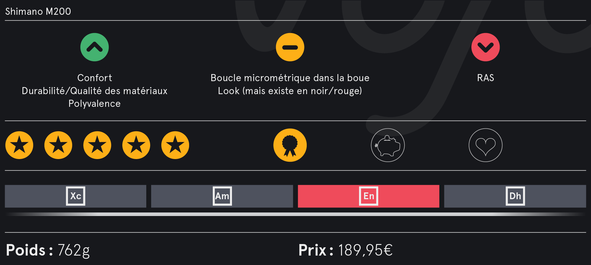 Conçues pour l’enduro, les Shimano M200 sont en fait capables de bien plus que ça. Loin de faire des compromis, elles excellent dans presque tous les domaines. A tel point qu’on en ferait bien sa seule paire de chaussures pour tout faire, du XC à l’enduro race. Elles séduiront aussi les randonneurs qui apprécieront tant leur confort que leur légèreté et leur durabilité.