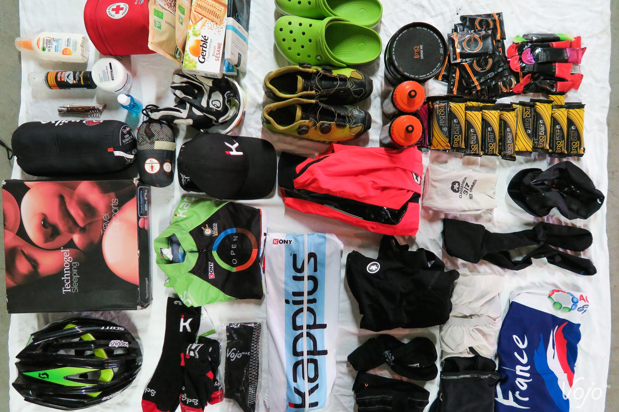 Pour optimiser le confort de dormir sous tente, un bon sac de couchage de faible volume mais résistant sous 10°C (les nuits sont fraiches), un oreiller de voyage, des boules Quies et un bandeau pour les yeux sont impératifs pour un repos correct. Limiter au maximum le nombre de cuissards / maillots, 7 ne sont pas nécessaires car un service de lessive journalière vous permettra de tourner sur un jeu de 3. Idem pour les affaires civiles, ce n’est pas un bal : un short, un pantalon, 3 t-shirts 3 slips 1 sweat-shirt suffiront (quelques affaires pour avant et après les 7j de course en sus).