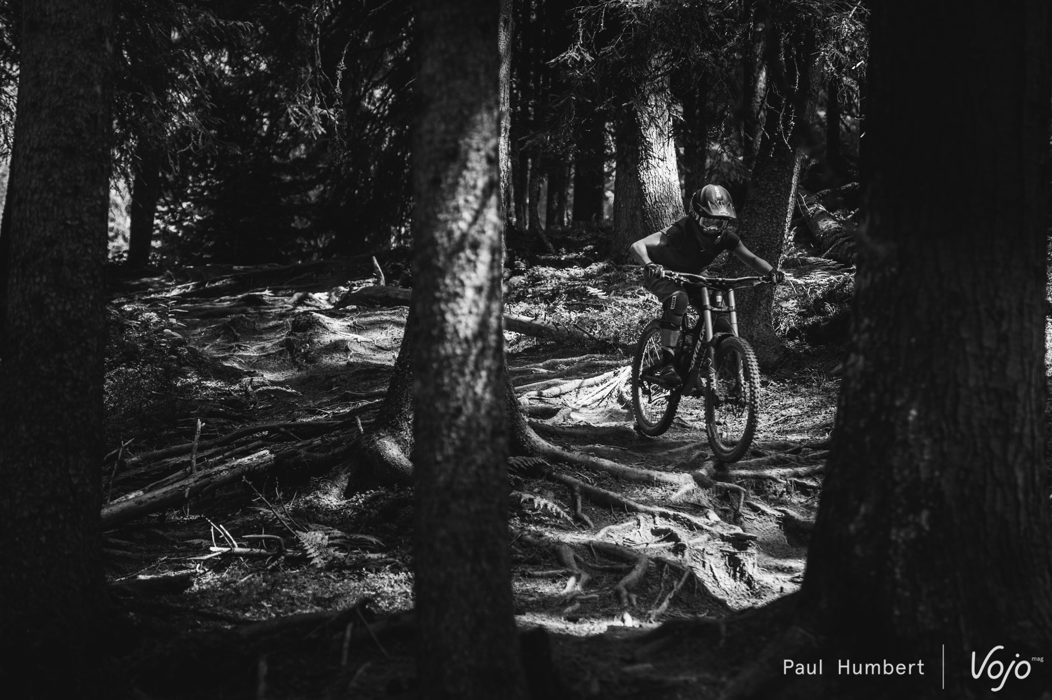 Dès les premiers mètres, je me demandais bien comment j’allais faire pour piloter et pour me comporter sur un tel engin. Il m’aura finalement fallu une journée pour m’habituer au plus gros débattement, au guidon plus large, à la géométrie complètement différente et aux pédales plates. Plus je roulais et plus je me familiarisais avec la bête. Dans les passages techniques, dans les lits de racines, je me sentais prendre beaucoup plus de vitesse qu’avec mon Transition. Le gros débattement et la géométrie me mettaient en confiance en absorbant tous les chocs, à tel point que j’avais presque l’impression d’être dans un fauteuil.
