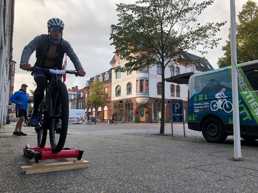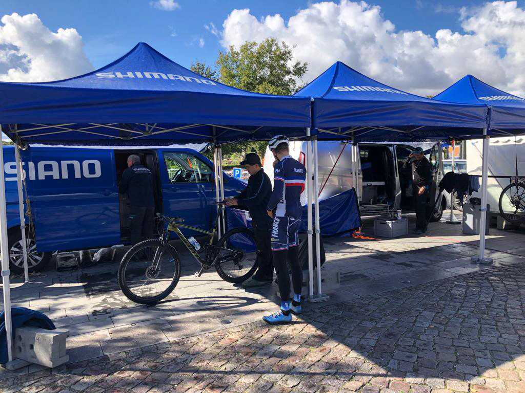 La journée du lendemain, tout comme celle du vendredi, est consacrée à la reconnaissance du parcours. Mais avant de découvrir les singletracks danois, nous profitons d’être sur le site de la course pour effectuer les inscriptions et récupérer les maillots de l’équipe de France. Nous échangeons quelques mots avec les autres Français présents, notamment Jordan Sarrou et Hugo Drechou. Au niveau du matériel, le plateau de 38 dents et les pneus semi-slicks sont de sortie : 28 km/h de moyenne sont annoncés pour les premiers…