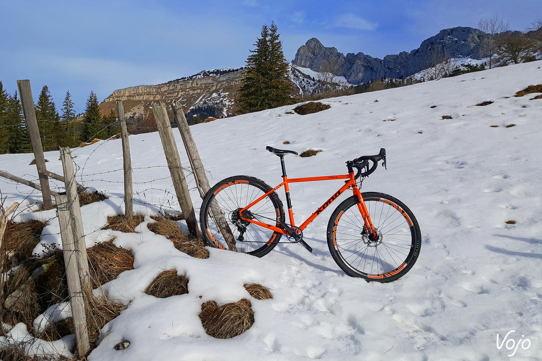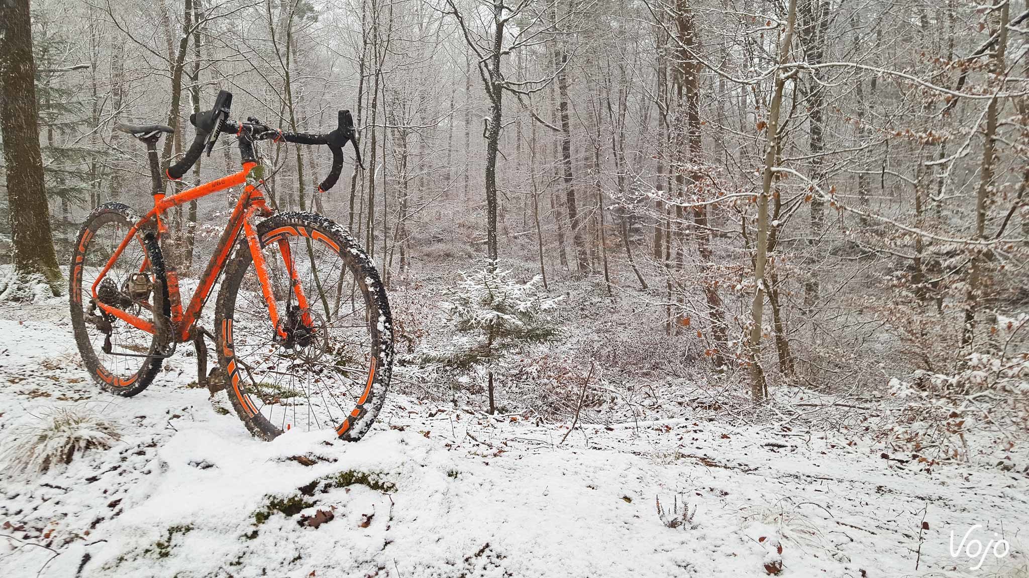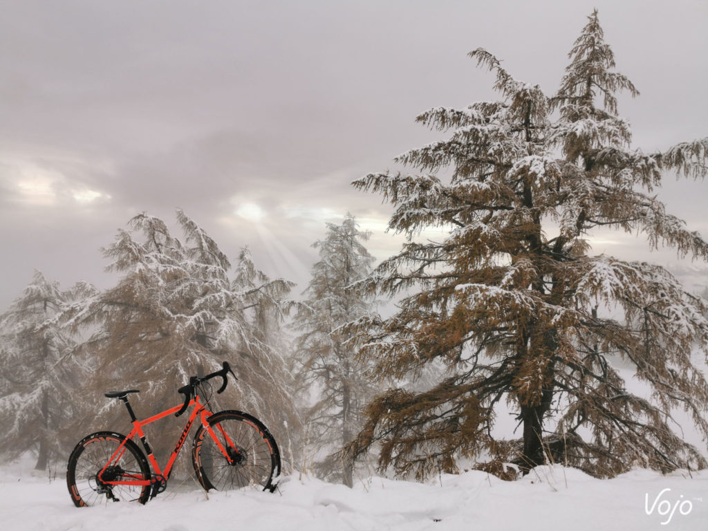 Bonjour à tous. Désolé si je vous parais un peu timide mais comprenez bien que c’est la première fois qu’on me permet de m’exprimer ainsi. Mon prénom est Sutra, et je fais partie de la branche des gravel dans la famille Kona. Le début de ma vie est somme toute assez banal. Né sur une planche à dessin canadienne et soudé loin de chez moi, j’ai ensuite été malmené par les transporteurs, ai subi le mal de mer dans un conteneur maritime puis l’attente et le froid des entrepôts avant d’atterrir dans la cour de ma famille d’accueil. Le scotch se déchire et le carton s’ouvre… Je vais bientôt pouvoir me faire une idée de mon nouveau maître ! Bon à première vue il a l’air sympa, et heureux de faire ma connaissance vu son large sourire. Je pense que je lui ai tout de suite plu ! C’est en tout cas comme cela que j’ai interprété l’impression de joie un peu idiote qui lui déguisait le visage une fois qu’il m’a sorti de ma boîte pour me poser sur le pied d’atelier. Ça et aussi le fait qu’il soit resté planté deux bonnes minutes à me dévisager sans rien faire. Totalement nu sans mes accessoires, j’étais à la fois fier et gêné ! Bon, j’ai un peu déchanté quand il a été question de terminer mon montage. Bien que de petite taille, mon jockey n’a pas la poigne légère quand il s’agit de serrer des vis, et la clé dynamométrique ne fait définitivement pas parti de sa servante d’atelier. Lui, c’est plutôt « on serre à fond jusqu’à ce que ça bloque et on refait un tour pour être sur » ! Je ne vous raconte pas la torture pour mes roulements à peine rodés ! Les restes de peinture sur les filetages n’auront pas résisté longtemps. Pas de coup de brosse. Non ! On force et ça finit par passer. Ah je ne suis pas tombé sur un esthète de la mécanique ou un orfèvre de la clé Allen, c’est le moins qu’on puisse dire. J’avoue que je suis issu d’une basse lignée. Point de particules de carbone, encore moins de pièces exotiques pour gonfler mon pedigree. Mon cadre et ma fourche sont en acier tout ce qu’il y a de plus ordinaire et à défaut de faire rêver, mon équipement est éprouvé. Je suis un petit gars simple, sans prétention, un rustique ! Mais quand même, ce n’est pas une raison pour me maltraiter de la sorte ! Du coup, j’étais déjà en train de m’inquiéter, imaginant finalement que son manque de délicatesse était à mettre sur le dos de mes origines. Que j’allais être cantonné aux basses besognes, à ramener le pain le dimanche, à rouler sous la pluie ou dans la boue quand les « beaux » vélos du garage seraient dispensés d’aller salir leur noble mécanique ou encrasser leurs biellettes si fragiles. Qu’il me faudrait supporter les mauvais traitements des sorties hivernales et le harcèlement psychologique des itinéraires de routine au paysage jamais renouvelé. Bon sang mais c’est bien sûr, il m’avait acheté en automne pour supporter l’hiver ! Jamais je n’apercevrais un coin de ciel bleu ! Le manant que j’étais devait rester dans l’ombre et la fange… Une fois le montage terminé, il m’a à nouveau admiré comme un idiot, avec le même sourire d’idiot et la même pose immobile d’idiot, puis il est remonté, en nous souhaitant « de faire de beaux rêves » ! « On ne monte pas des Enve pour aller chercher le pain ! » C’est la phrase que je me suis répété inlassablement durant la première nuit, à la fois pour me rassurer et m’aider à trouver le sommeil. Faut dire que j’étais bien énervé avec ces deux roues qui me donnaient des allures de vélo bien plus haut de gamme ! Rassurez-vous, il n’était pas question que je ne garde pas les pneus sur terre. Je suis un gars simple, bien décidé à le rester et ça tombe bien, l’avenir va vous montrer que je n’ai pas eu trop le choix. Voilà donc comment j’ai vécu ma première journée. Comme vous l’avez donc constaté quelques lignes plus haut, sa passion est telle qu’il nous parle. Je dis « nous » vu qu’il y a de très nombreux VTT qui cohabitent dans son sous-sol. Je vois déjà les membres de la ligue des défenseurs de vélos crier au scandale. Stop ! Eteignez les porte-voix, baissez les banderoles et posez les cagoules : nos conditions de vie sont parfaites. De la lumière, de la chaleur, une ventilation, des visites aussi fréquentes que nos sorties… et même pas obligé de prendre une douche en rentrant ! En plus de la grosse poignée de modernes de tout poil : des fat bikes un peu impressionnants avec leurs pneus énormes qui racontaient des histoires de neige profonde et de sentiers escarpés, des tout-suspendus représentant l’intégralité des pratiques existantes qui ne pouvaient pas s’empêcher de faire le concours de celui qui saute le plus loin, des rigides et des endurigides infoutus de se mettre d’accord et un XC que j’étais supposé remplacer. Je côtoyais aussi un grand nombre d’anciens, des vieux 26″ qui avaient fait l’histoire du vélo tout-terrain. Pourtant, ça n’avait rien d’un mouroir. Bien au contraire, tous étaient propres, rutilants même et équipés comme à leur première randonnée. Ils m’ont raconté la même histoire, comme quoi si un vélo lui procurait du plaisir et lui offrait de bons souvenirs, il n’était pas revendu et vivait une retraite paisible et heureuse au sein de la famille. Certains se déplacent parfois sur des manifestations, dans des expositions et il y en avait même une douzaine qui étaient actuellement sous les feux des projecteurs d’un magasin de sport. Mais ça, c’est surtout réservé aux plus anciens alors que moi, j’étais le petit nouveau, et le premier gravel. J’avais la pression ! Impossible de vous dire combien de temps il m’a fallu attendre avant de faire notre première balade mais ça n’a pas duré longtemps. Deux ou trois jours tout au plus. Je me souviens très bien comment