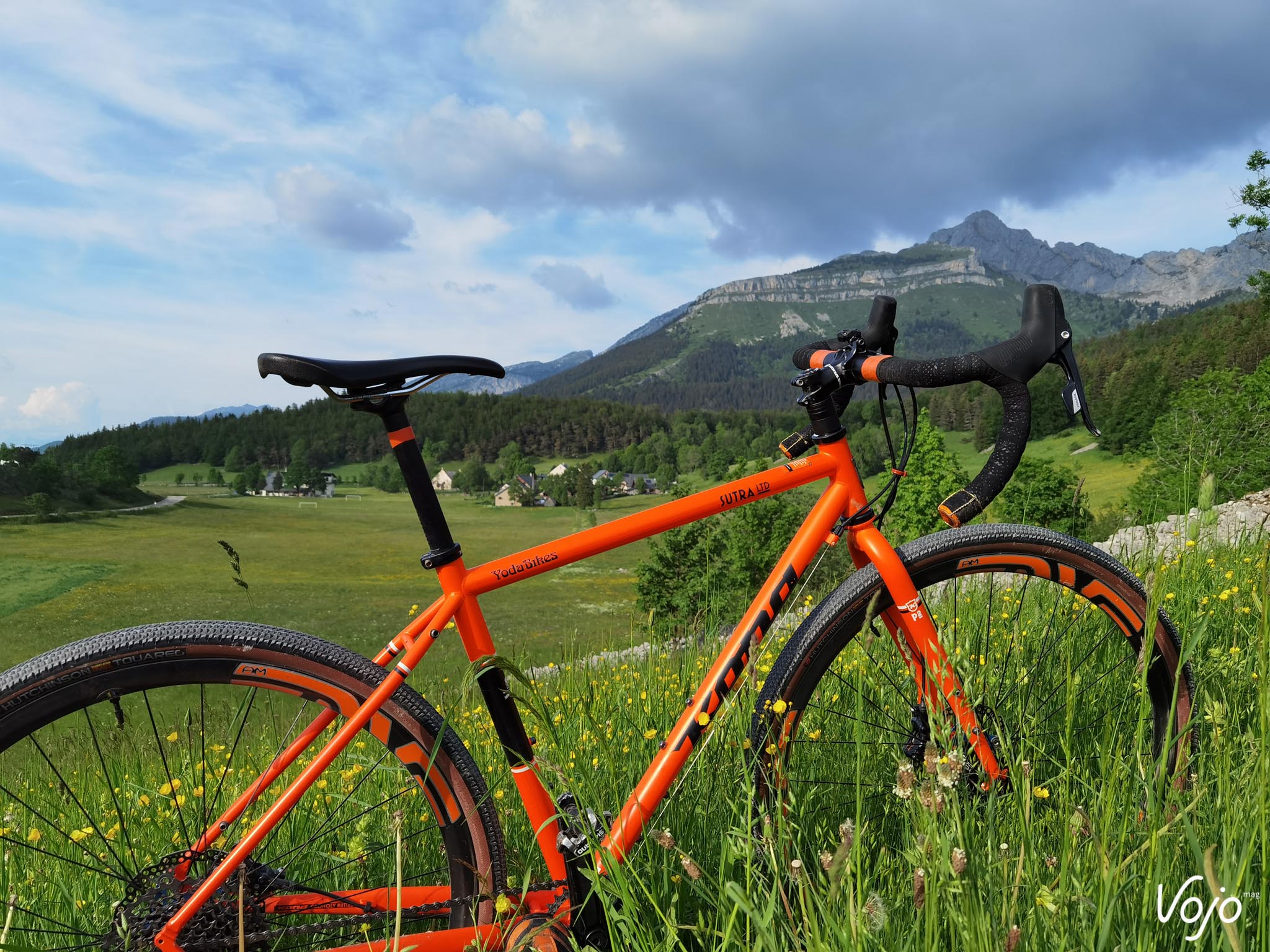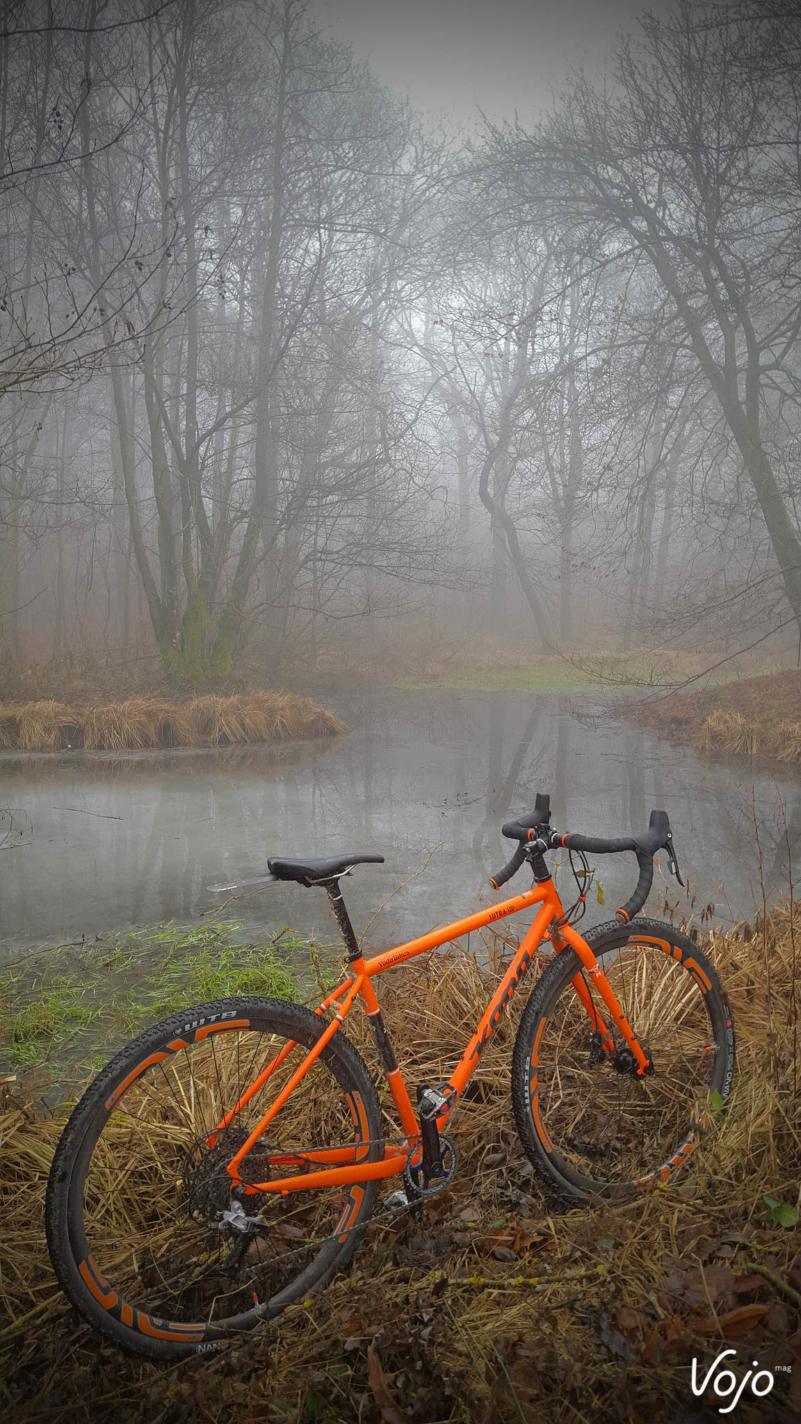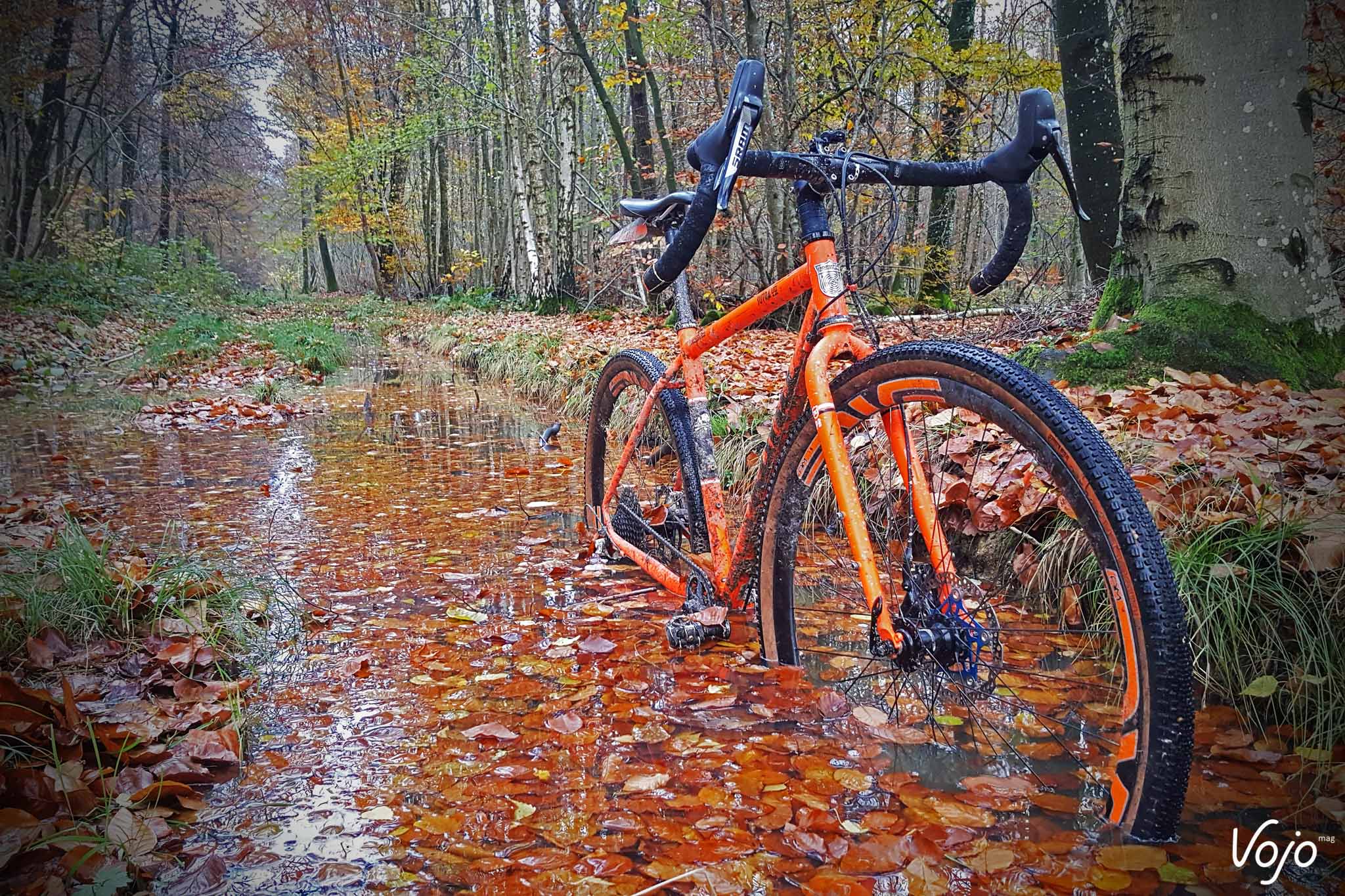 Bonjour à tous. Désolé si je vous parais un peu timide mais comprenez bien que c’est la première fois qu’on me permet de m’exprimer ainsi. Mon prénom est Sutra, et je fais partie de la branche des gravel dans la famille Kona. Le début de ma vie est somme toute assez banal. Né sur une planche à dessin canadienne et soudé loin de chez moi, j’ai ensuite été malmené par les transporteurs, ai subi le mal de mer dans un conteneur maritime puis l’attente et le froid des entrepôts avant d’atterrir dans la cour de ma famille d’accueil. Le scotch se déchire et le carton s’ouvre… Je vais bientôt pouvoir me faire une idée de mon nouveau maître ! Bon à première vue il a l’air sympa, et heureux de faire ma connaissance vu son large sourire. Je pense que je lui ai tout de suite plu ! C’est en tout cas comme cela que j’ai interprété l’impression de joie un peu idiote qui lui déguisait le visage une fois qu’il m’a sorti de ma boîte pour me poser sur le pied d’atelier. Ça et aussi le fait qu’il soit resté planté deux bonnes minutes à me dévisager sans rien faire. Totalement nu sans mes accessoires, j’étais à la fois fier et gêné ! Bon, j’ai un peu déchanté quand il a été question de terminer mon montage. Bien que de petite taille, mon jockey n’a pas la poigne légère quand il s’agit de serrer des vis, et la clé dynamométrique ne fait définitivement pas parti de sa servante d’atelier. Lui, c’est plutôt « on serre à fond jusqu’à ce que ça bloque et on refait un tour pour être sur » ! Je ne vous raconte pas la torture pour mes roulements à peine rodés ! Les restes de peinture sur les filetages n’auront pas résisté longtemps. Pas de coup de brosse. Non ! On force et ça finit par passer. Ah je ne suis pas tombé sur un esthète de la mécanique ou un orfèvre de la clé Allen, c’est le moins qu’on puisse dire. J’avoue que je suis issu d’une basse lignée. Point de particules de carbone, encore moins de pièces exotiques pour gonfler mon pedigree. Mon cadre et ma fourche sont en acier tout ce qu’il y a de plus ordinaire et à défaut de faire rêver, mon équipement est éprouvé. Je suis un petit gars simple, sans prétention, un rustique ! Mais quand même, ce n’est pas une raison pour me maltraiter de la sorte ! Du coup, j’étais déjà en train de m’inquiéter, imaginant finalement que son manque de délicatesse était à mettre sur le dos de mes origines. Que j’allais être cantonné aux basses besognes, à ramener le pain le dimanche, à rouler sous la pluie ou dans la boue quand les « beaux » vélos du garage seraient dispensés d’aller salir leur noble mécanique ou encrasser leurs biellettes si fragiles. Qu’il me faudrait supporter les mauvais traitements des sorties hivernales et le harcèlement psychologique des itinéraires de routine au paysage jamais renouvelé. Bon sang mais c’est bien sûr, il m’avait acheté en automne pour supporter l’hiver ! Jamais je n’apercevrais un coin de ciel bleu ! Le manant que j’étais devait rester dans l’ombre et la fange… Une fois le montage terminé, il m’a à nouveau admiré comme un idiot, avec le même sourire d’idiot et la même pose immobile d’idiot, puis il est remonté, en nous souhaitant « de faire de beaux rêves » ! « On ne monte pas des Enve pour aller chercher le pain ! » C’est la phrase que je me suis répété inlassablement durant la première nuit, à la fois pour me rassurer et m’aider à trouver le sommeil. Faut dire que j’étais bien énervé avec ces deux roues qui me donnaient des allures de vélo bien plus haut de gamme ! Rassurez-vous, il n’était pas question que je ne garde pas les pneus sur terre. Je suis un gars simple, bien décidé à le rester et ça tombe bien, l’avenir va vous montrer que je n’ai pas eu trop le choix. Voilà donc comment j’ai vécu ma première journée. Comme vous l’avez donc constaté quelques lignes plus haut, sa passion est telle qu’il nous parle. Je dis « nous » vu qu’il y a de très nombreux VTT qui cohabitent dans son sous-sol. Je vois déjà les membres de la ligue des défenseurs de vélos crier au scandale. Stop ! Eteignez les porte-voix, baissez les banderoles et posez les cagoules : nos conditions de vie sont parfaites. De la lumière, de la chaleur, une ventilation, des visites aussi fréquentes que nos sorties… et même pas obligé de prendre une douche en rentrant ! En plus de la grosse poignée de modernes de tout poil : des fat bikes un peu impressionnants avec leurs pneus énormes qui racontaient des histoires de neige profonde et de sentiers escarpés, des tout-suspendus représentant l’intégralité des pratiques existantes qui ne pouvaient pas s’empêcher de faire le concours de celui qui saute le plus loin, des rigides et des endurigides infoutus de se mettre d’accord et un XC que j’étais supposé remplacer. Je côtoyais aussi un grand nombre d’anciens, des vieux 26″ qui avaient fait l’histoire du vélo tout-terrain. Pourtant, ça n’avait rien d’un mouroir. Bien au contraire, tous étaient propres, rutilants même et équipés comme à leur première randonnée. Ils m’ont raconté la même histoire, comme quoi si un vélo lui procurait du plaisir et lui offrait de bons souvenirs, il n’était pas revendu et vivait une retraite paisible et heureuse au sein de la famille. Certains se déplacent parfois sur des manifestations, dans des expositions et il y en avait même une douzaine qui étaient actuellement sous les feux des projecteurs d’un magasin de sport. Mais ça, c’est surtout réservé aux plus anciens alors que moi, j’étais le petit nouveau, et le premier gravel. J’avais la pression ! Impossible de vous dire combien de temps il m’a fallu attendre avant de faire notre première balade mais ça n’a pas duré longtemps. Deux ou trois jours tout au plus. Je me souviens très bien comment