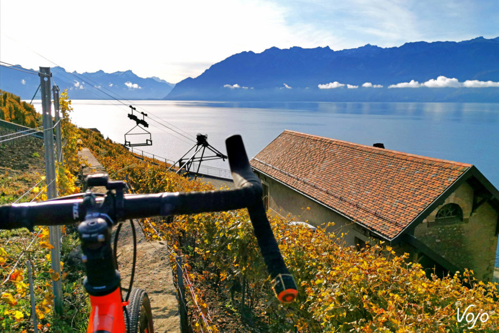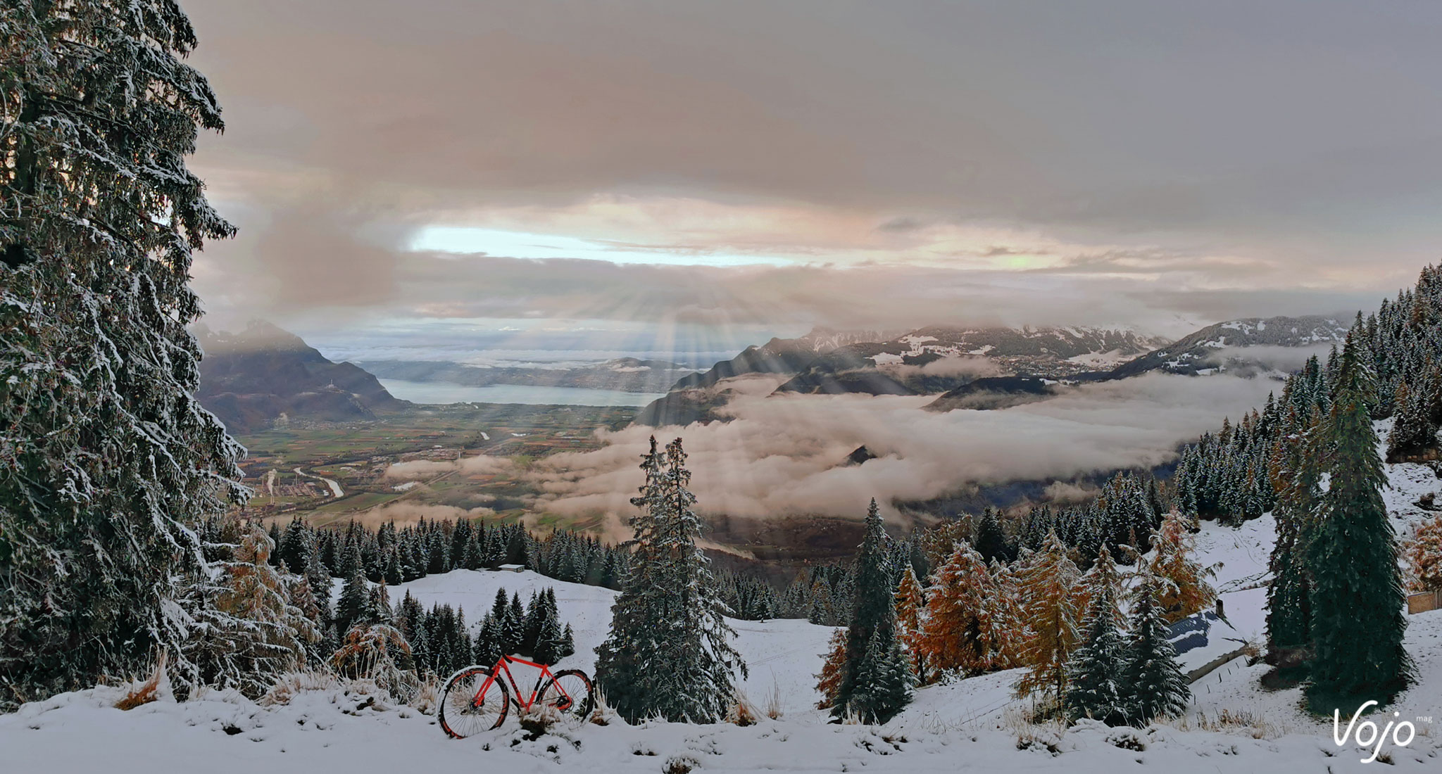 Mais une fois arrivés en haut, la nature nous a récompensés : les gros nuages se sont ouverts, le soleil est apparu dévoilant le lac Léman au loin ! Le ciel a même pris des reflets oranges, coordonnés à ma couleur. Wahou ! Et je me suis retrouvé enfoncé dans la neige, pour la sempiternelle séance photo. Quand il a enfin décidé que c’était bon, nous sommes redescendus, et là quelle rigolade ! Des glissades et des travers dans tous les sens, des vrais beaux travers. La neige était fraiche, il y en avait au moins 5 centimètres que mes pneus fins coupaient aisément pour aller chercher le dur au fond. De son propre aveu, je m’étais mieux comporté qu’un fat bike dans ces conditions mais ça, je n’ai jamais osé le répéter devant les costauds du garage, trop peur de leurs gros pneus. Un grand moment que cette sortie.