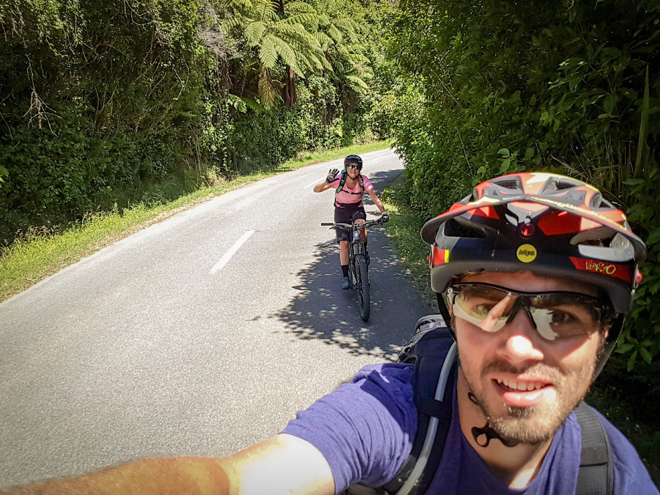 Changement de genre. On s’aventure sur un sentier d’abord tracé pour les piétons, mais qui a également été ouvert, quelques années après, aux vététistes ! Ici, vous êtes bien au nord de l’île du Sud, vous y voyez un tas de petites îles, et les paysages sont d’un reposant intense ! Afin de rouler le Queen Charlotte Track, nous avons opté pour une virée en deux jours, sacs à dos et repas du midi avec nous. La première journée consistait à rallier le point de départ du chemin via la route ! Alors nous avons laissé la voiture à Anakiwa et nous nous sommes partis sur le bitume pour plus de 55km en bord de mer !