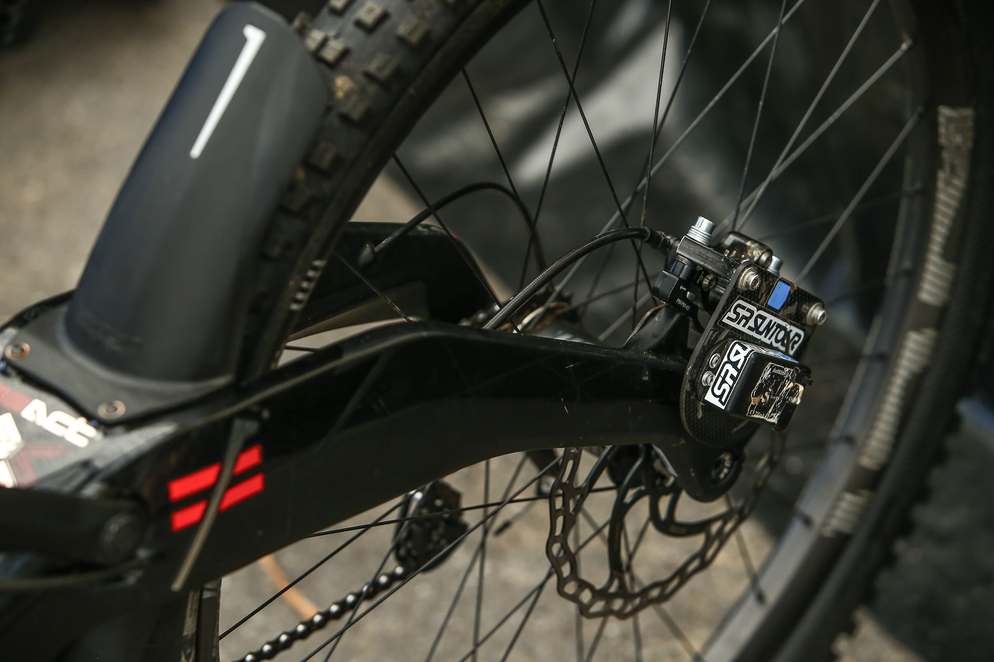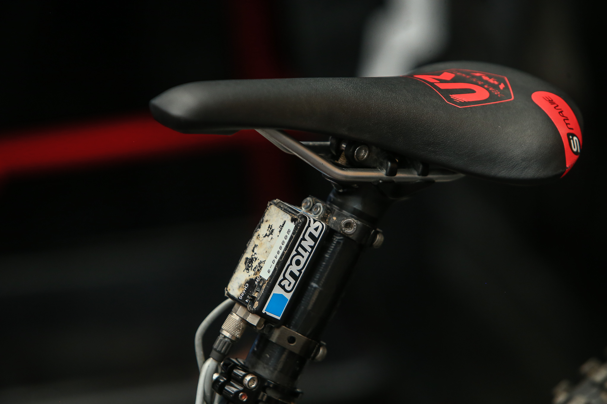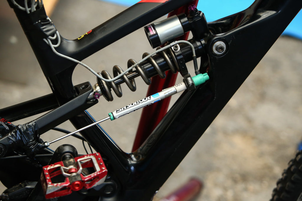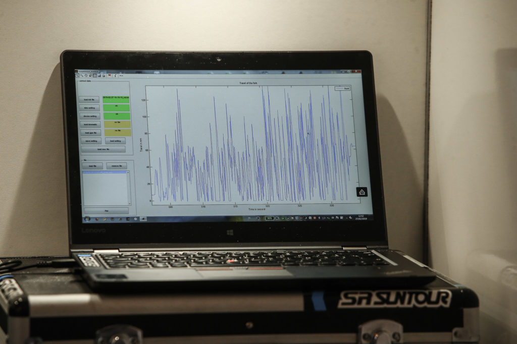 « Pour nous, il est plus simple à mettre en oeuvre quand on la change de vélo en vélo », précise Stéphane. Plusieurs dispositifs d’enregistrement de données sont installés sur le vélo : sur la fourche et l’amortisseur mais aussi sur les bases et le guidon, afin de créer des repères fixes pour mesurer le travail du débattement.