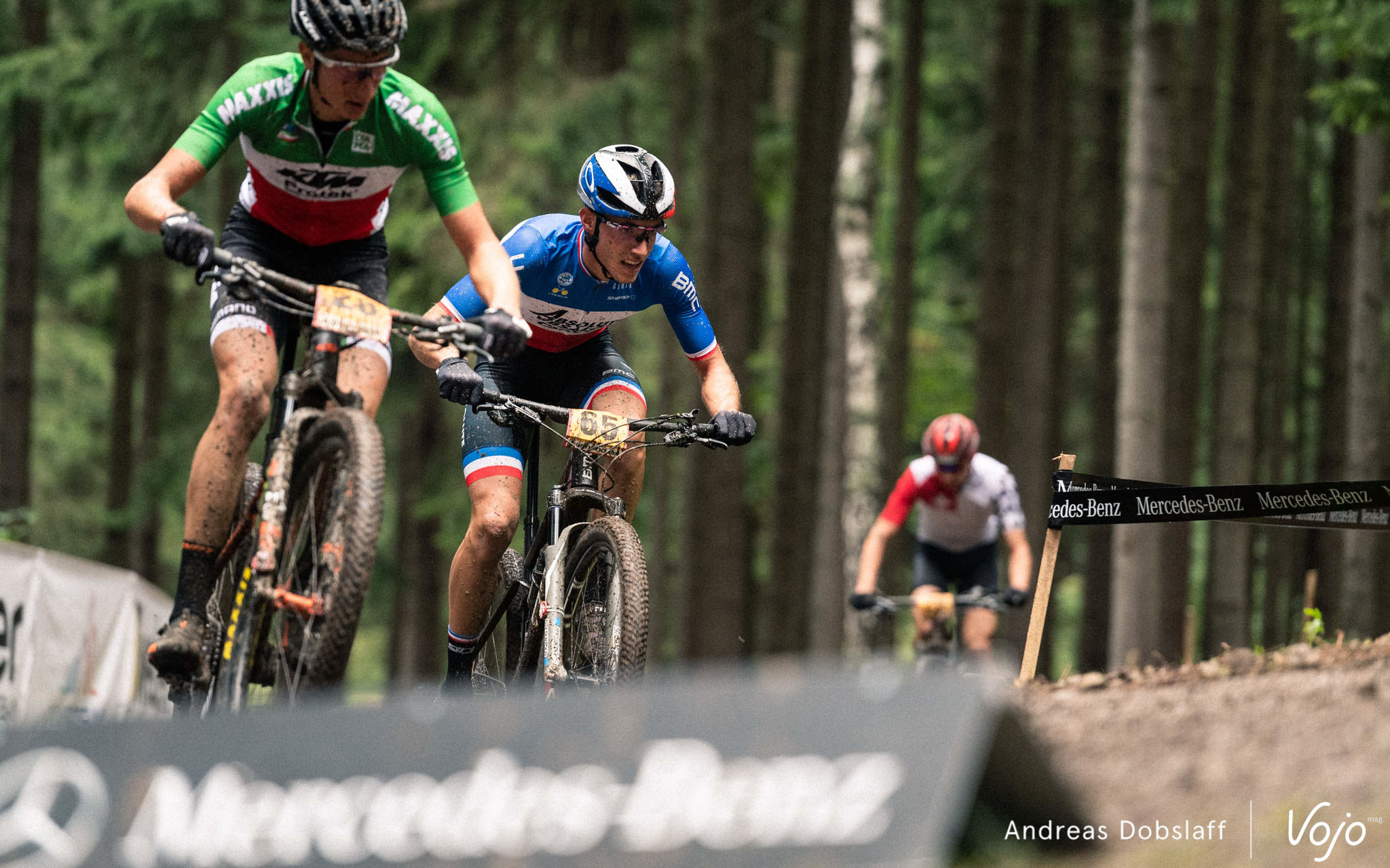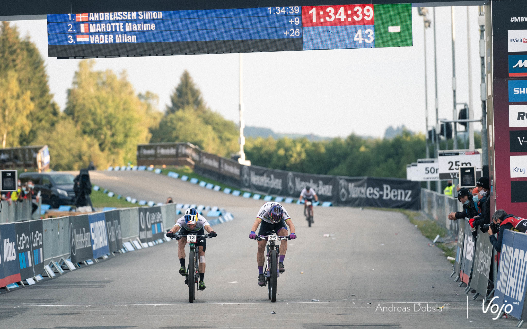 Tout va donc se jouer dans la dernière boucle, aussi bien pour la victoire que pour le podium. En tête de course, Simon Andreassen et Maxime Marotte mettent à mal Milan Vader, qui perd quelques mètres une fois, deux fois, revient puis craque définitivement. Il reste un demi-tour pour faire la différence et c’est le Danois qui bascule en tête dans la descente du milieu du parcours. Il prend quelques secondes à Maxime Marotte puis creuse encore l’écart dans les deux dernières bosses.